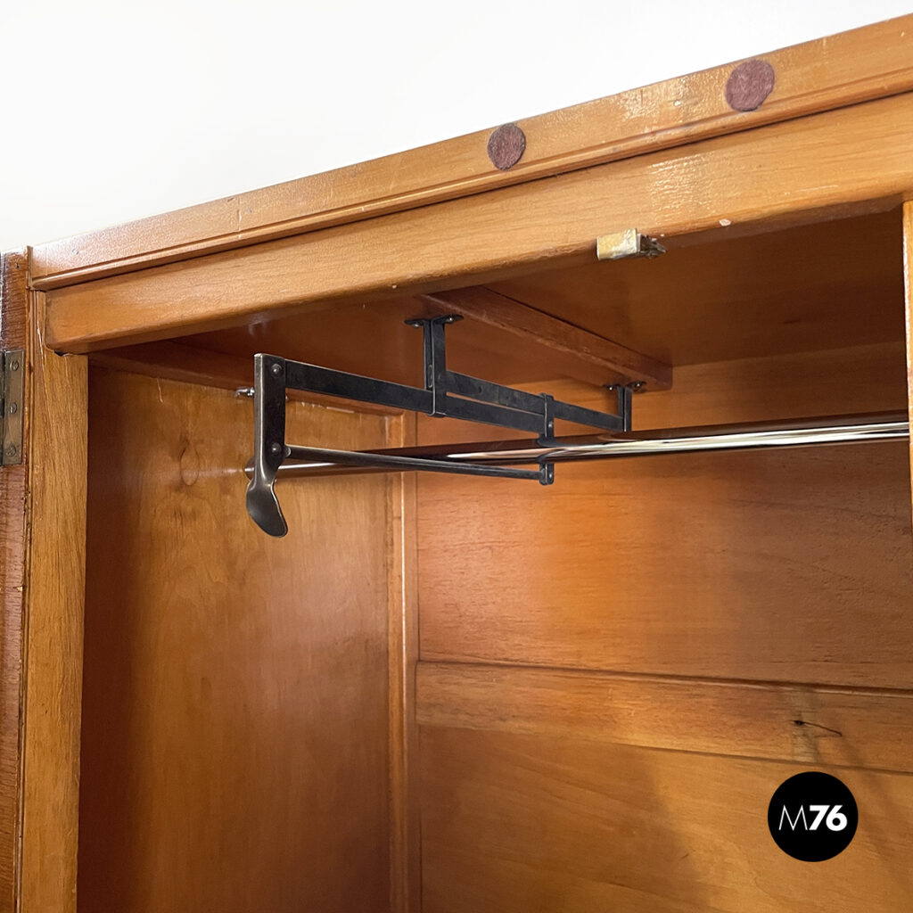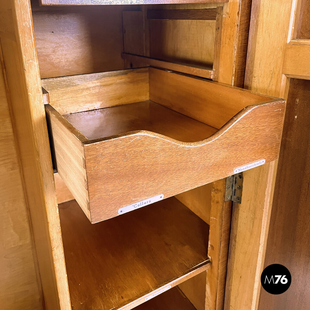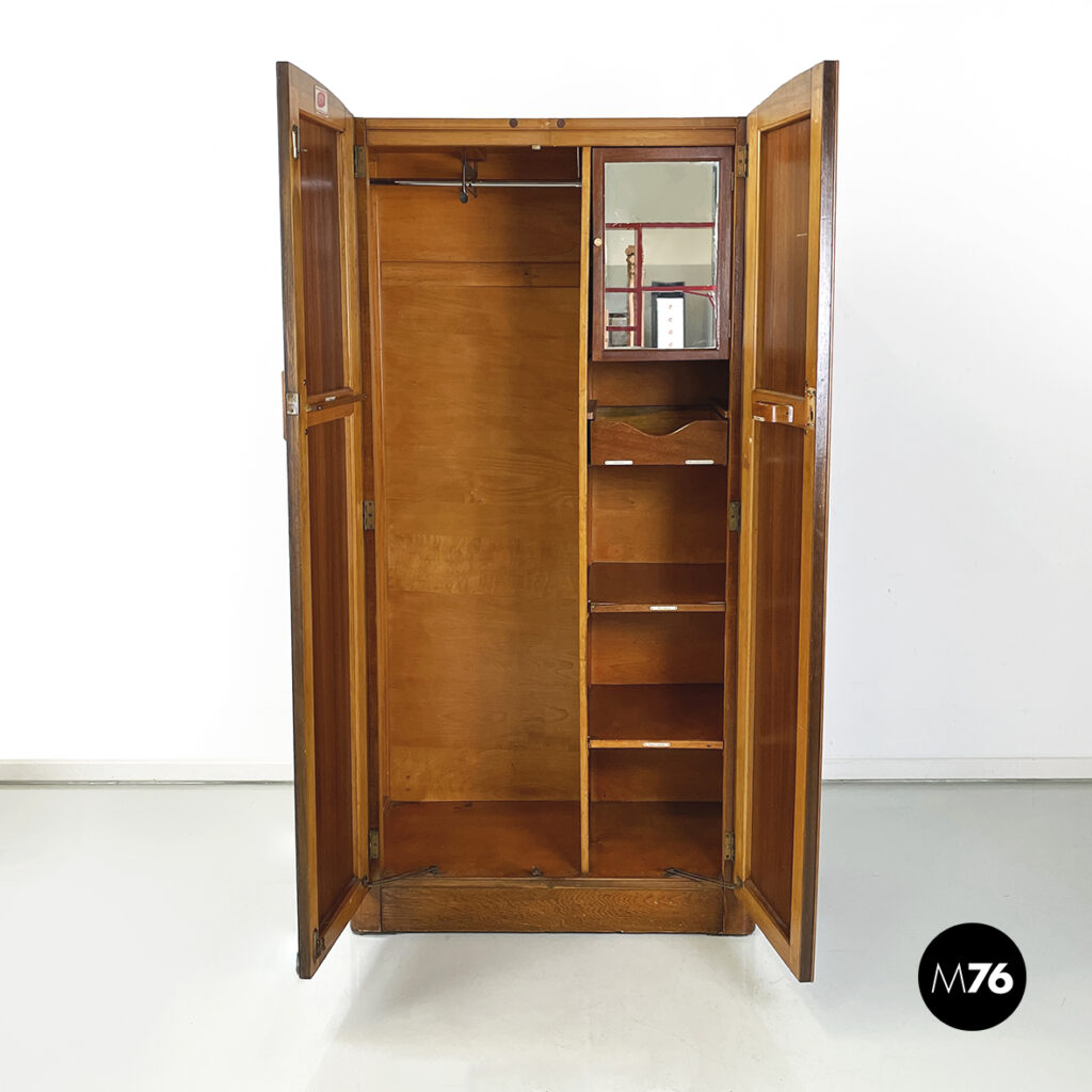 Armadio interamente in legno massello con doppia anta a battente. All’interno sono presenti due vani. Sulla sinistra è presente un appendiabiti estraibile in metallo con un asta in legno per le cravatte. Sulla destra sono presenti delle mensole, un cassetto, un piccolo portaoggetti per bottoni e uno vano con antina con specchio. Ogni elemento presenta etichetta specifica che definisce l’utilizzo della mensola. Art Deco.