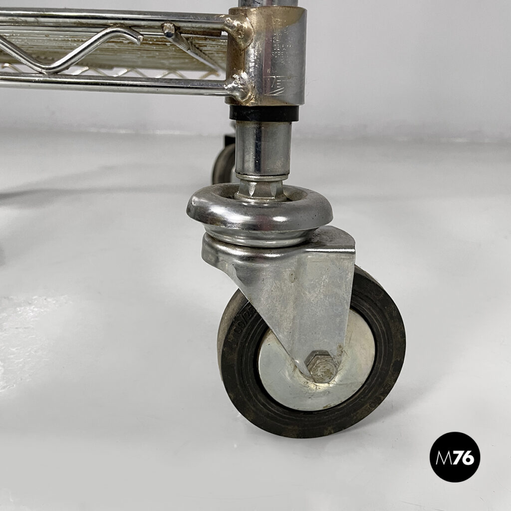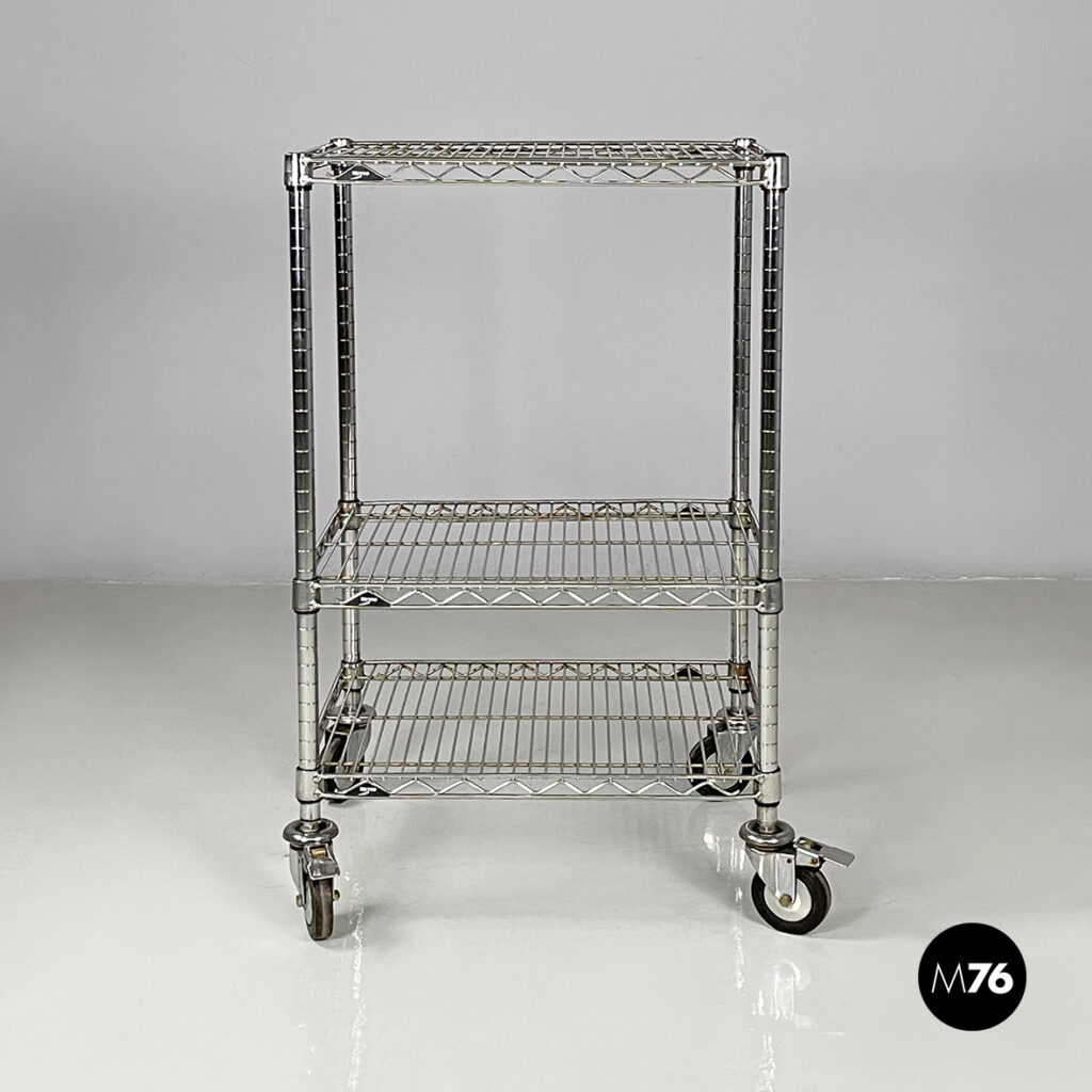 Carrello a tre ripiani composti da tondini di acciaio verticali, orizzontali e diagonali. La struttura è composta da quattro tubolari di metallo e quattro ruote.