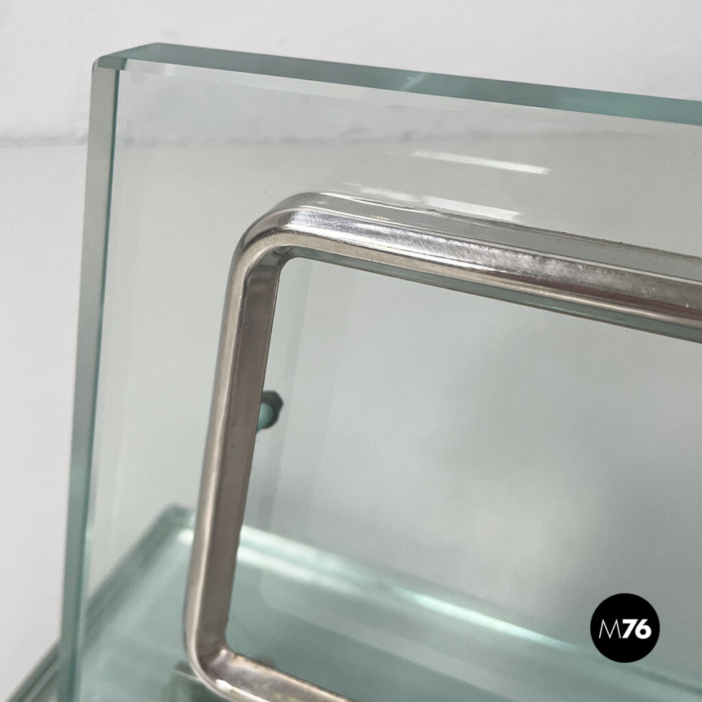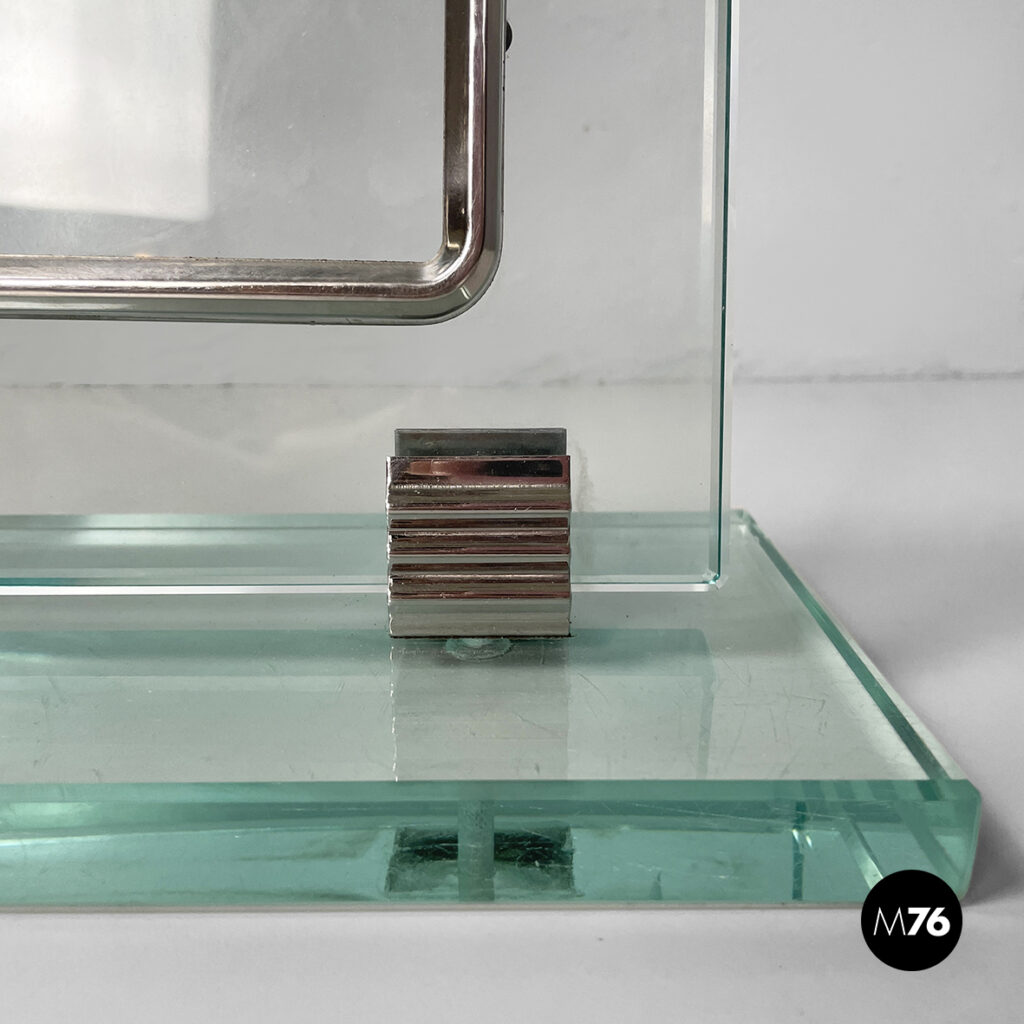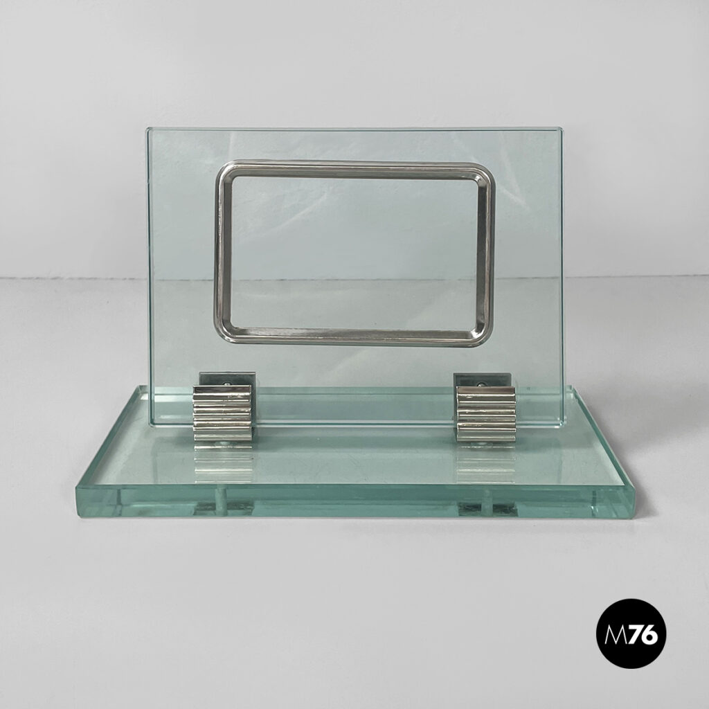 Cornice portafoto da tavolo con cornice in metallo. La struttura è composta da una lastra di vetro di grosso spessore, la quale si incastra in due morsetti di metallo ancorati alla base. Base squadrata in vetro di grosso spessore.