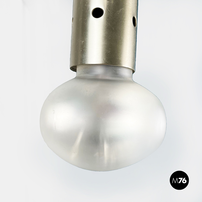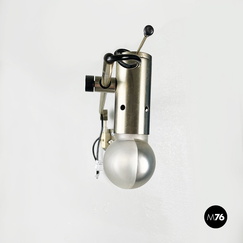 Lampada da parete con struttura composta da due bracci regolabili in metallo cromato tubolare. Il diffusore a forma di lampadina è in vetro opalino e metallo e scorre sul tubolare. La lampada e la lampadina possono essere orientate in tutte le direzioni. L’attacco al muro è di forma tonda in metallo.