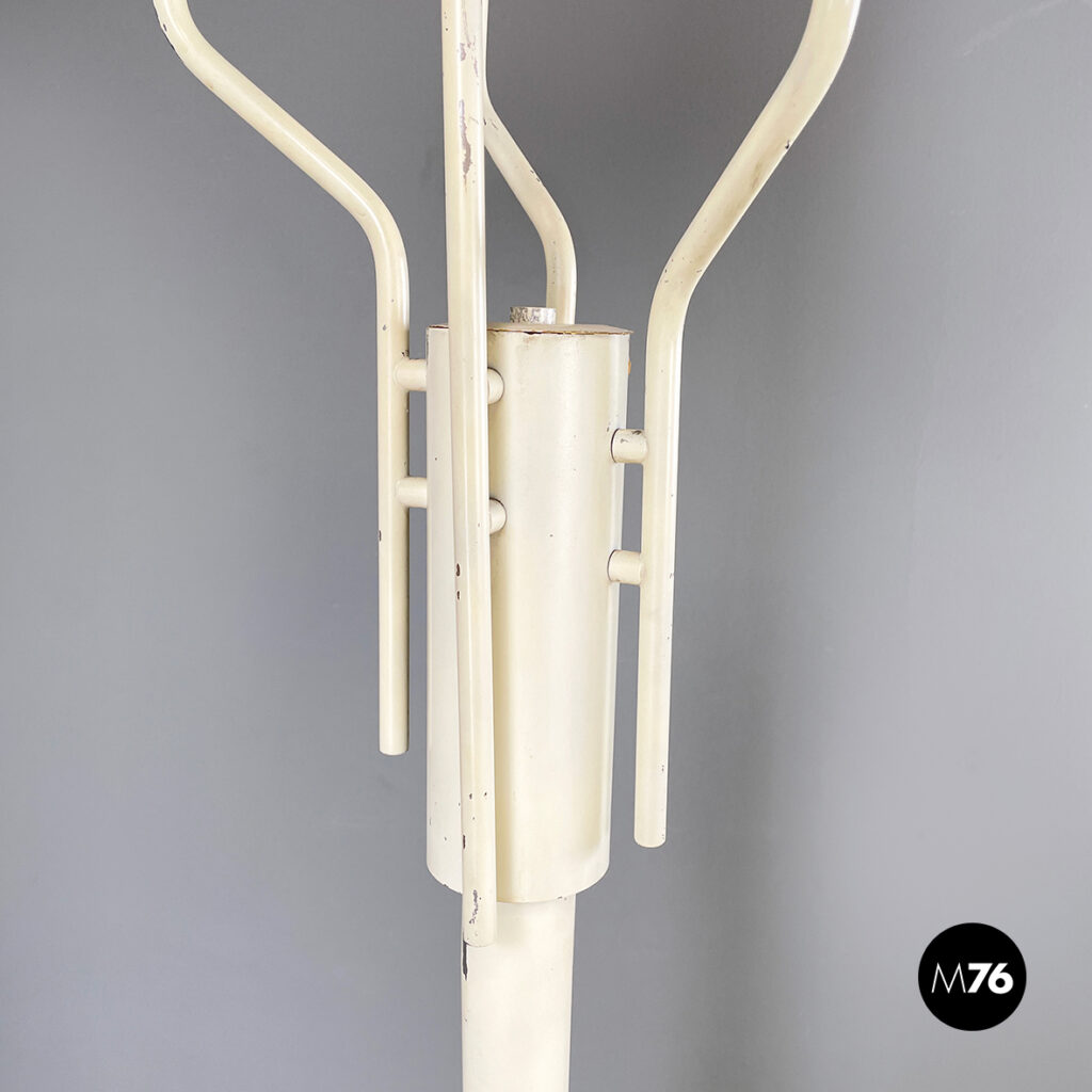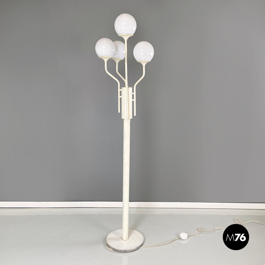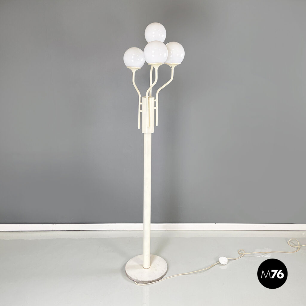 Lampada da terra a 4 luci in metallo verniciato bianco. I 4 diffusori sferici sono in vetro opalino, ognuno posizionato alla fine di un braccio in tondino di metallo bianco. I 4 bracci su uniscono al centro e si congiungono alla struttura centrale in tubolare di metallo bianco. La base, anche essa ub metallo verniciato bianco, è tonda.