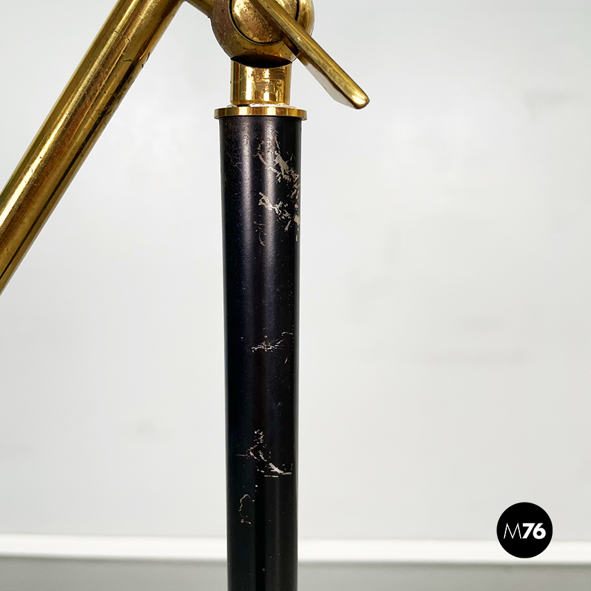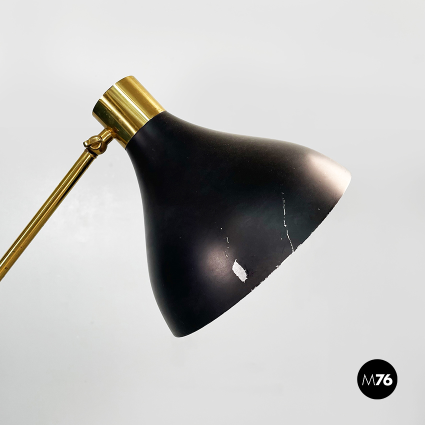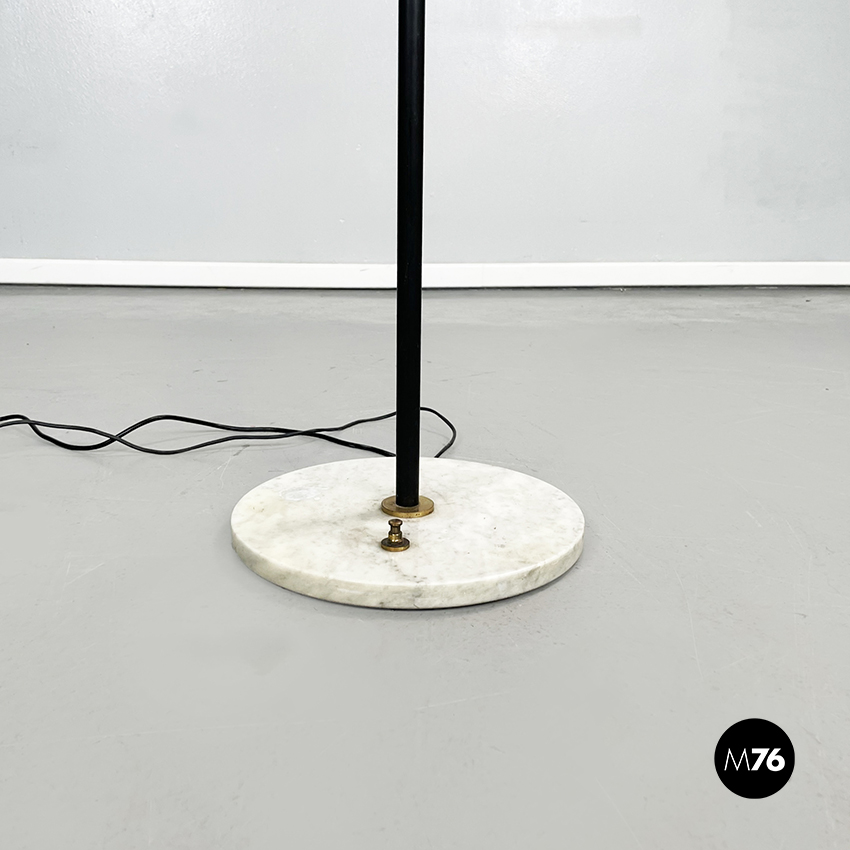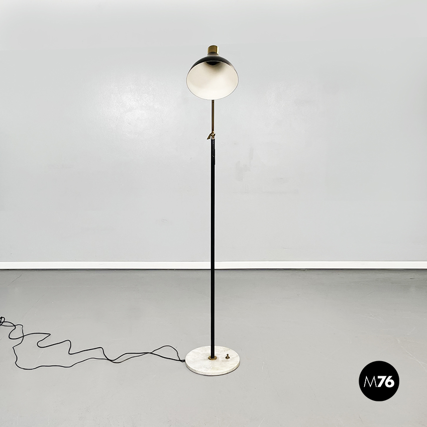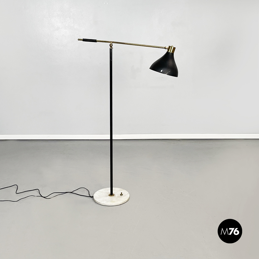 Lampada da terra regolabile con base tonda in marmo e struttura in ottone e metallo tubolare. Il paralume è in metallo verniciato nero. La struttura presenta un’asta in ottone con manico, che permette alla lampada di inclinarsi, e un’asta verticale in metallo verniciato nero con inserti in ottone.