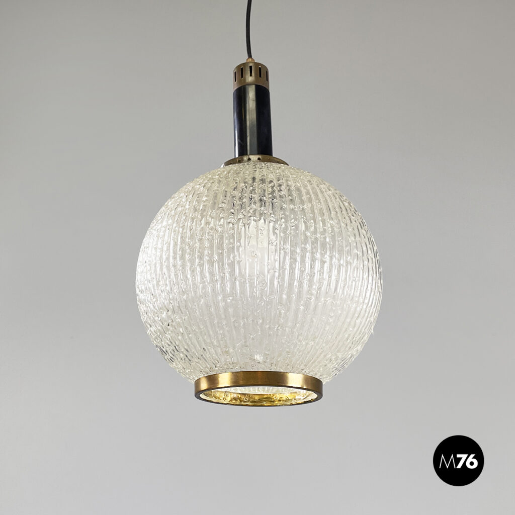 Lampadario con diffusore sferico in vetro stampato con scanalature decorative, il quale presenta sotto un foro con bordo in ottone. La struttura cilindrica è in metallo verniciato nero e ottone. Attacco al soffitto cilindrico nero.