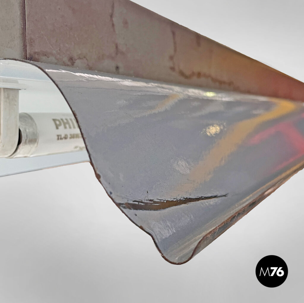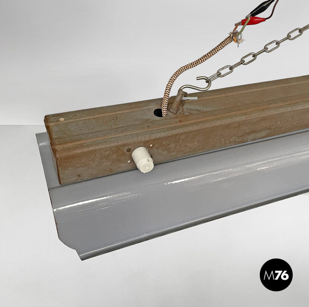 Lampadario industriale di forma rettangolare in metallo smaltato grigio scuro con catenina per la sospensione abbinata.