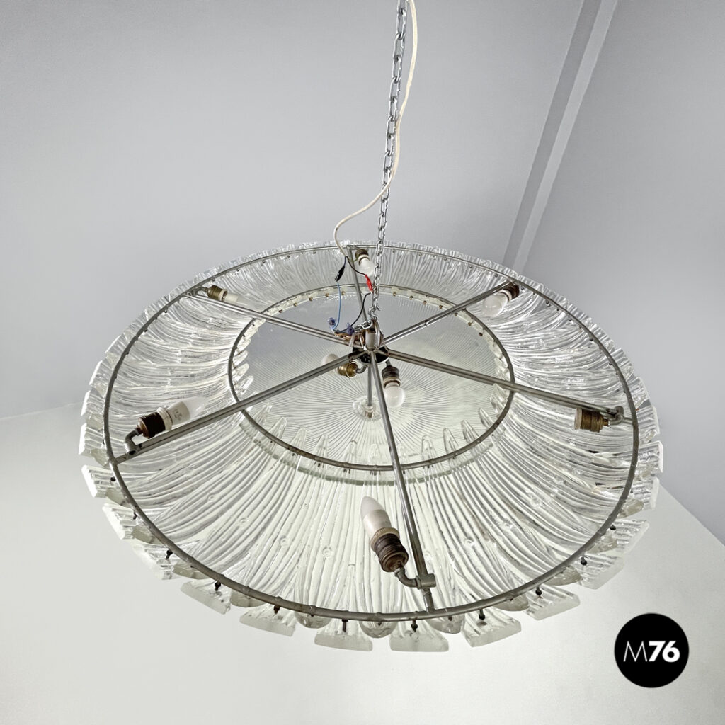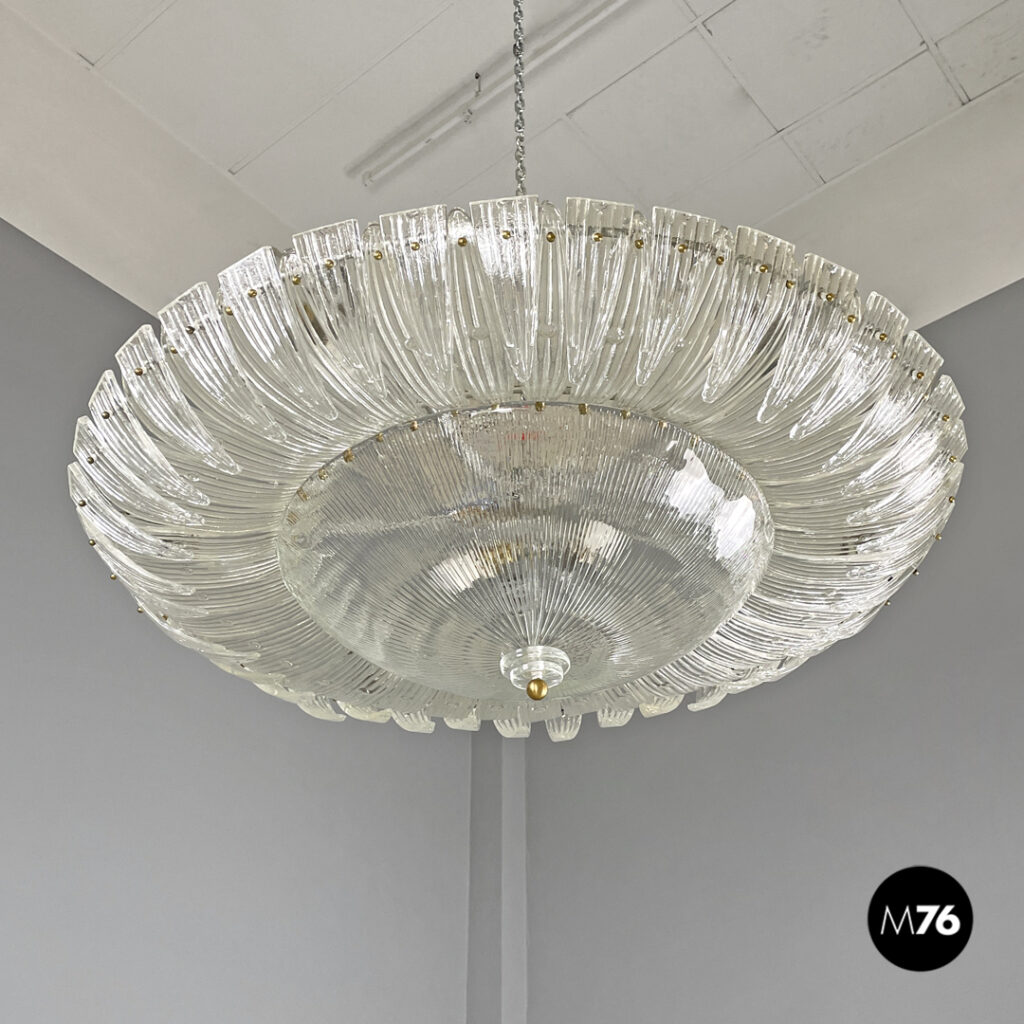 Lampadario tondo o plafoniera in vetro di Murano trasparente, che ricorda la forma di un fiore. La fila esterna è composta da elementi dalla forma triangolare sagomata con incisioni verticali decorative che si sviluppano verso l’interno del lampadario. La fila più interna è composta dagli stessi “petali” ma dalla forma più allungata, mentre al centro si trova una cupola rovesciata con le stesse decorazioni incise, con due dischi di vetro trasparente ed una sfera in metallo dorato. La struttura portante è in metallo.