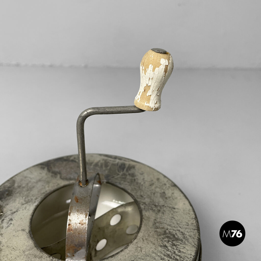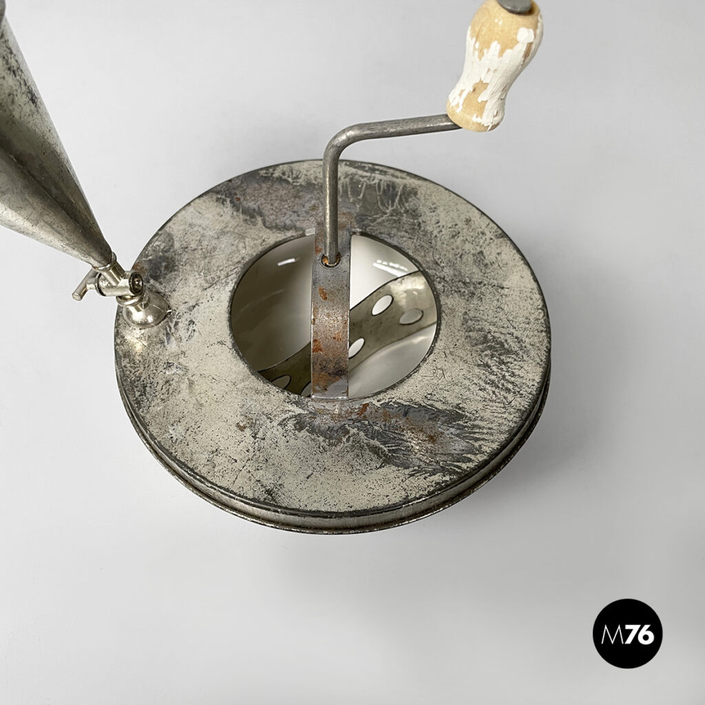 Macchina per maionese in metallo e ceramica. La struttura è composta da un cono in cui si inseriscono gli ingredienti e una manovella, che muove delle spatole metalliche per mischiare gli ingredienti. Alla base è presente una ciotola in ceramica bianca.