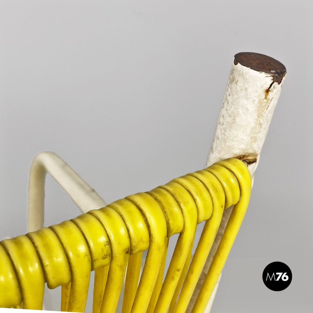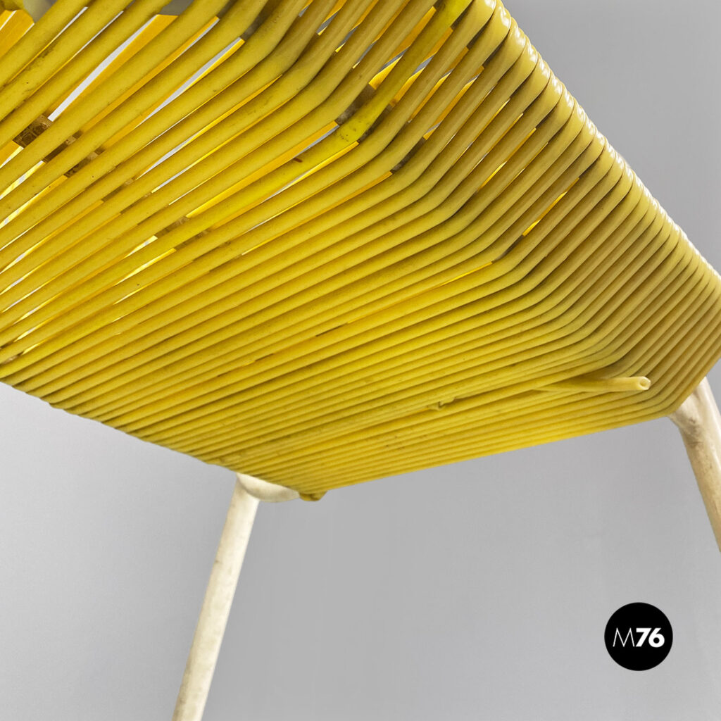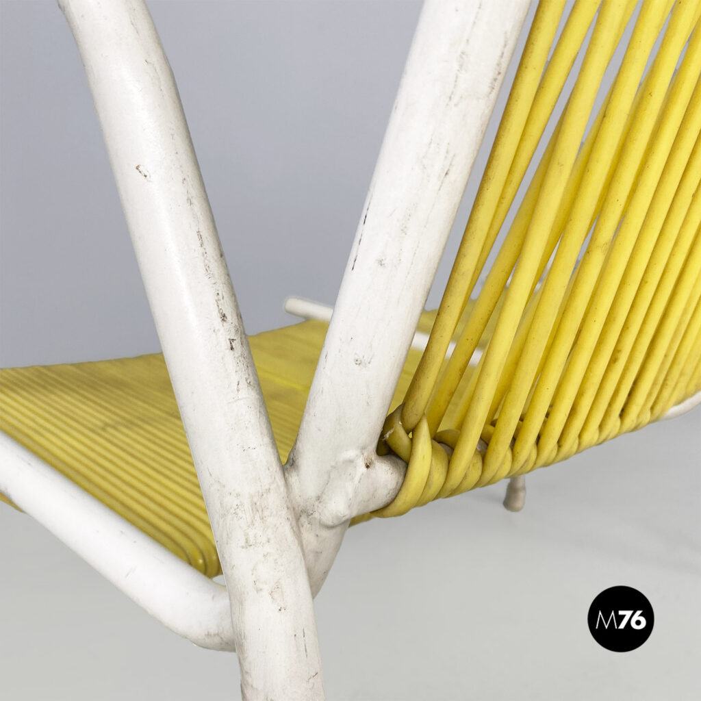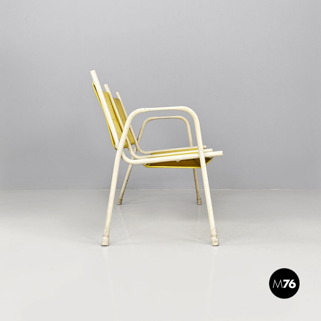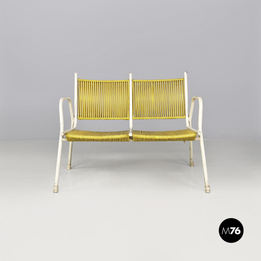 Panchina da esterno, a due posti a sedere, con struttura in tubolare di metallo smaltato bianco e con seduta e schienale in scooby o fili di plastica in color giallo.