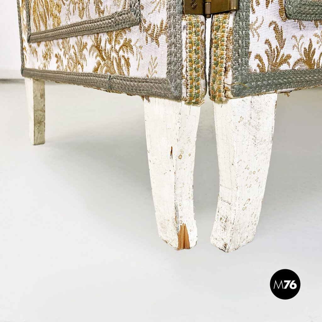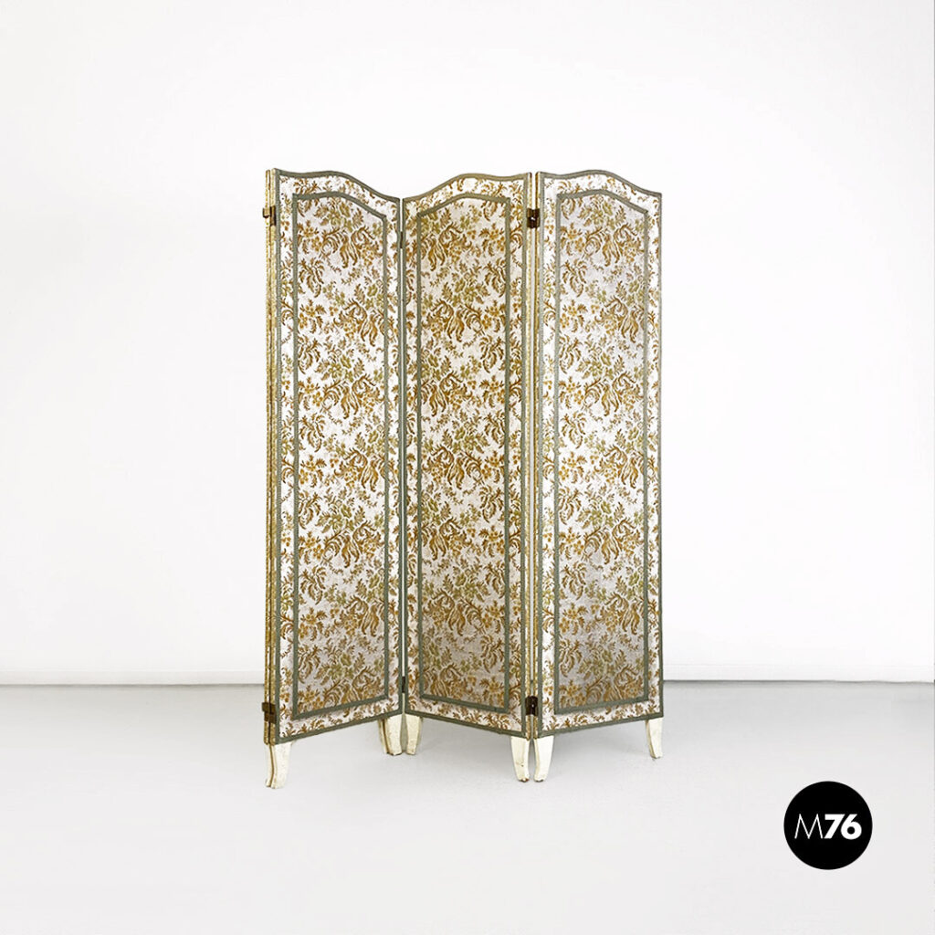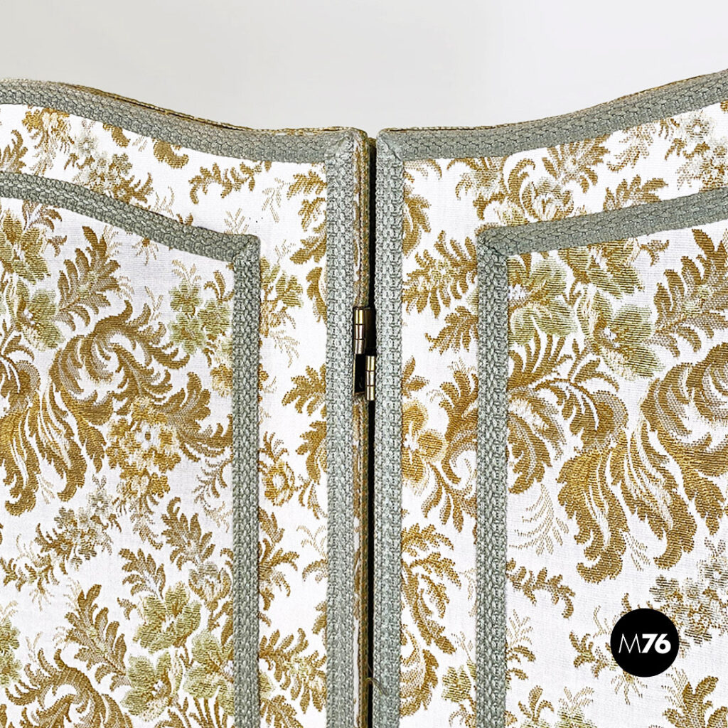 Paravento a quattro ante con motivo floreale e zampe curve in legno verniciato bianco.