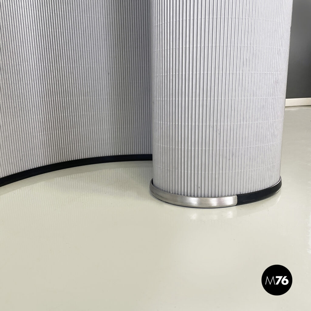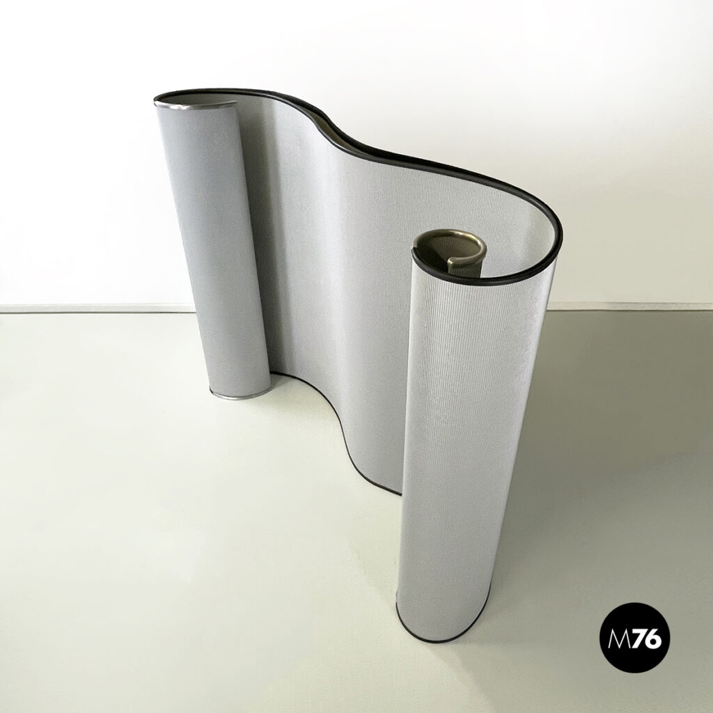 Paravento mod. Cartoons caratterizzato da una struttura autoportante in cartone ondulato grigio chiaro. Il bordo superiori e inferiore sono in gomma nera con elementi terminali rigidi in alluminio pressofuso satinato. Il paravento può essere posizionato a piacere o arrotolato.