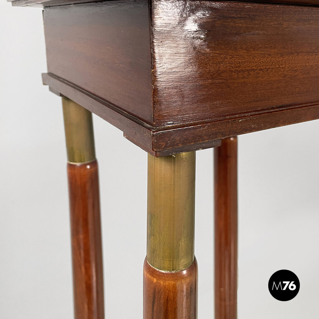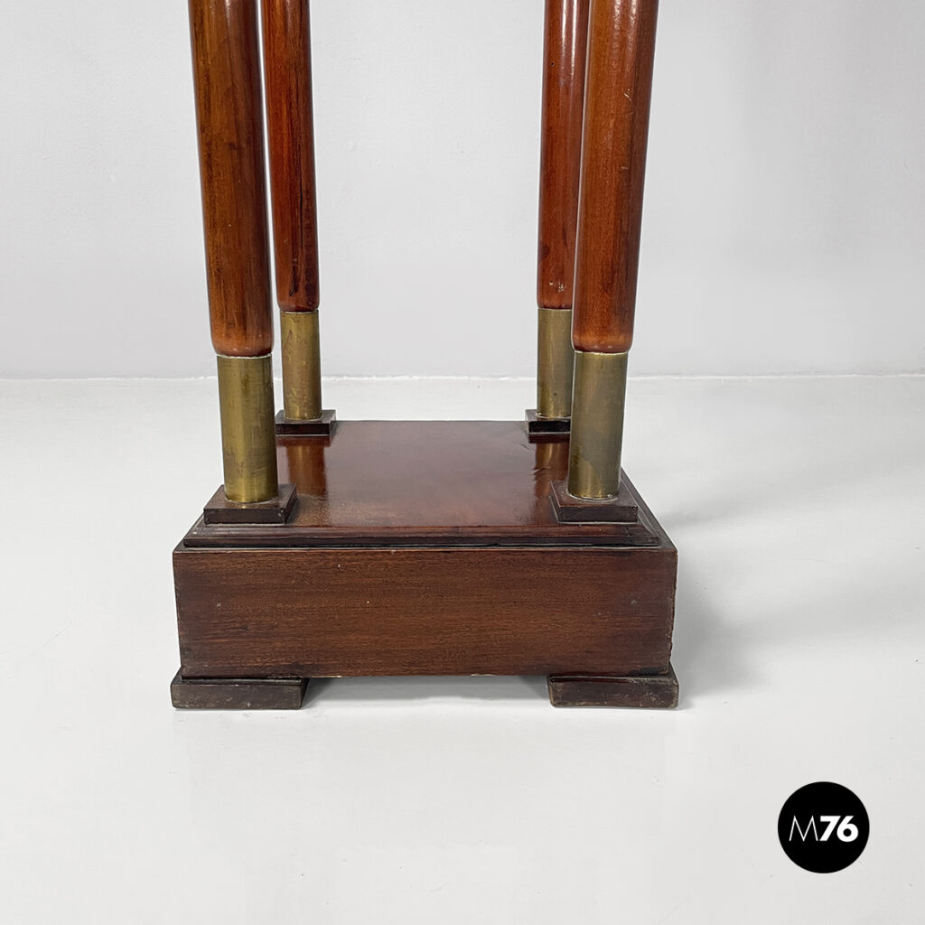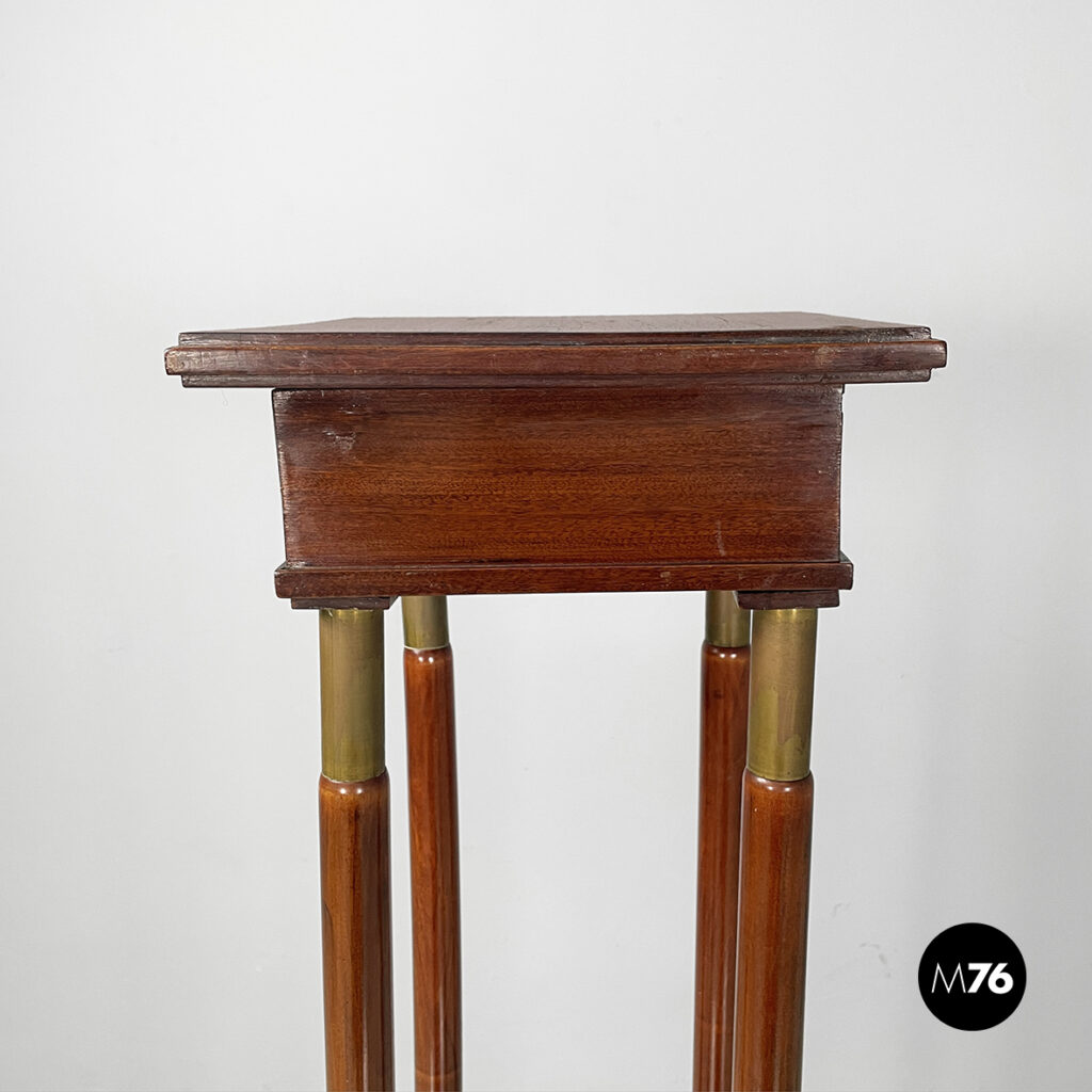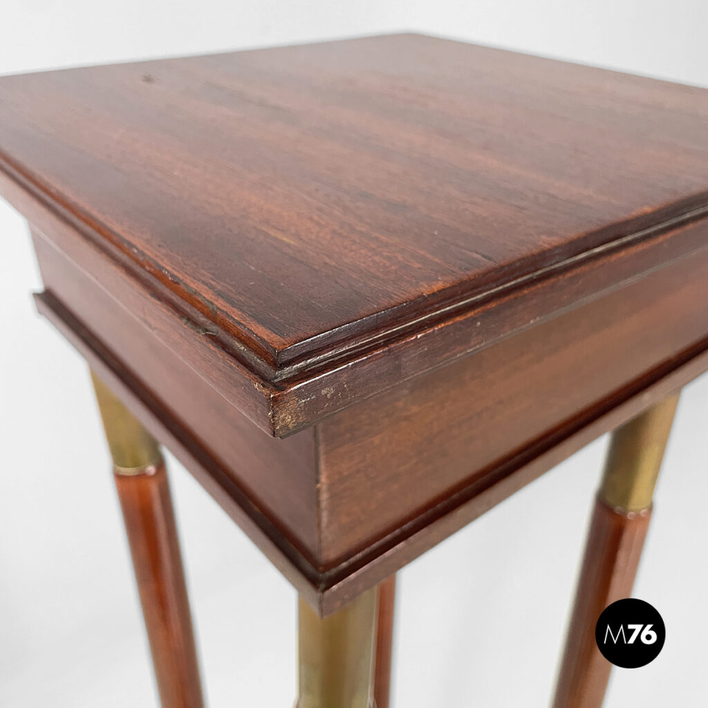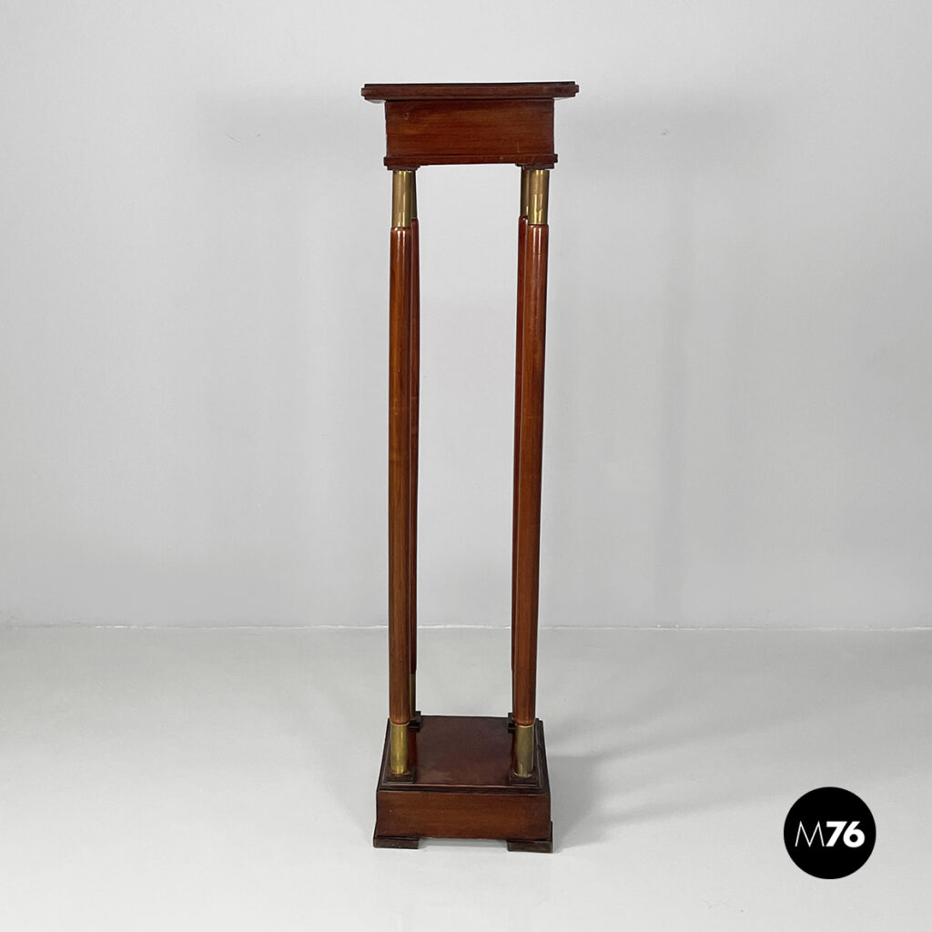 Piedistallo o colonna espositore con piano quadrato in legno. Il piano è sostenuto da quattro listelli a sezione tonda in legno con finiture in ottone agli estremi. Base quadrata in legno con piedini squadrati. Stile Impero.