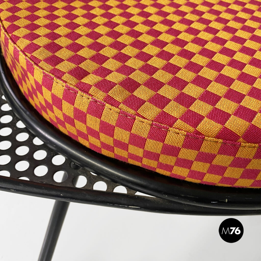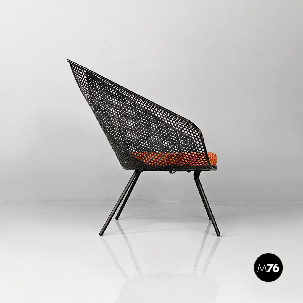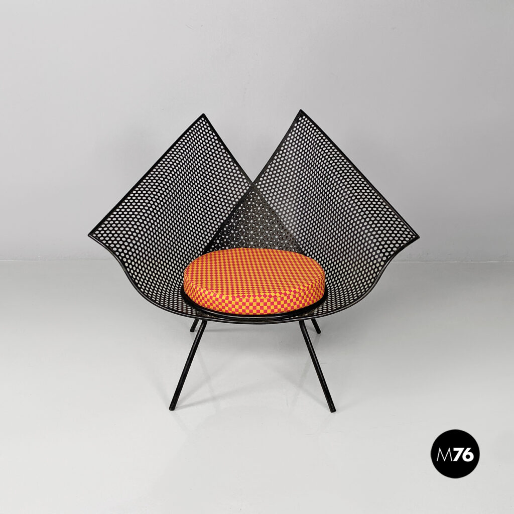Poltrona con struttura in metallo verniciato nero, formata da due sorta di ali composte da una rete metallica, che incrociandosi vanno a creare lo schienale della poltrona. La seduta è tonda, così come il cuscino che la copre, in tessuto rosso e arancione a scacchi. L’intera struttura è sorretta da quattro zampe diagonali in tondino di metallo, sempre in colore nero.