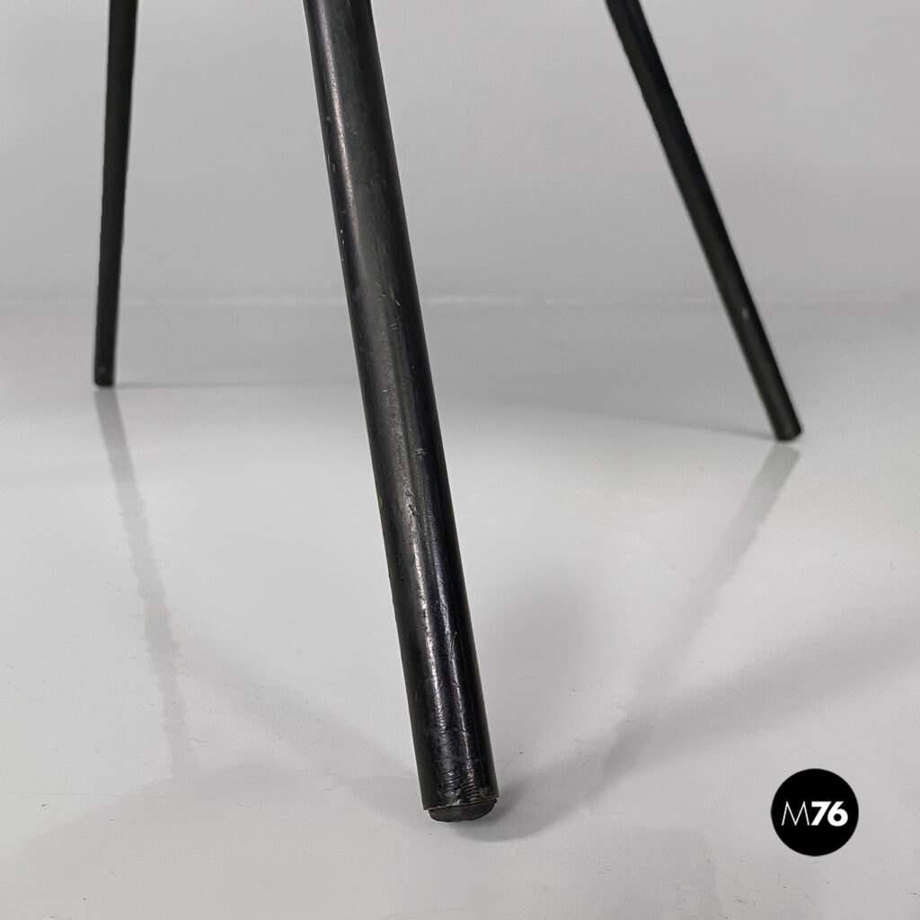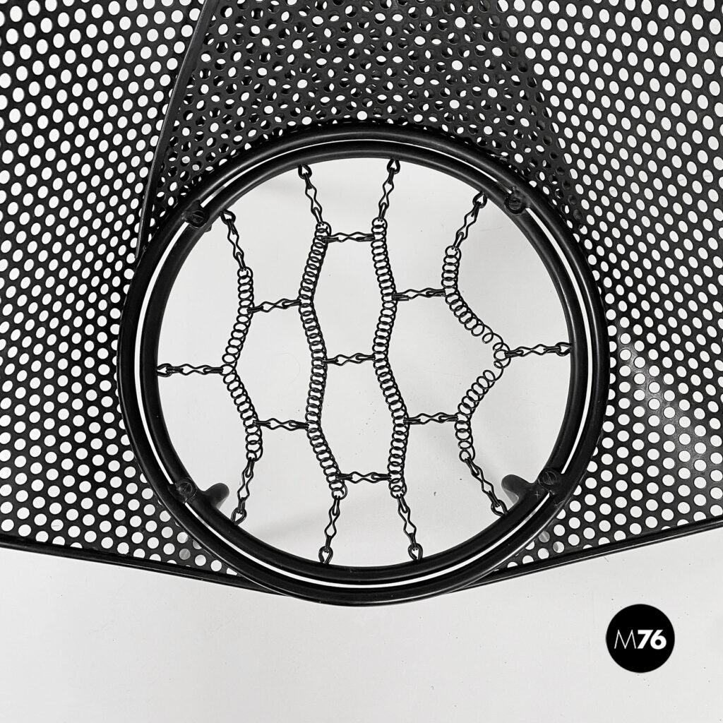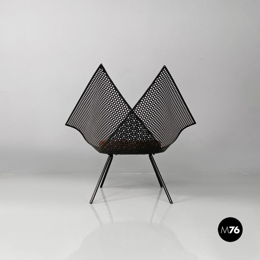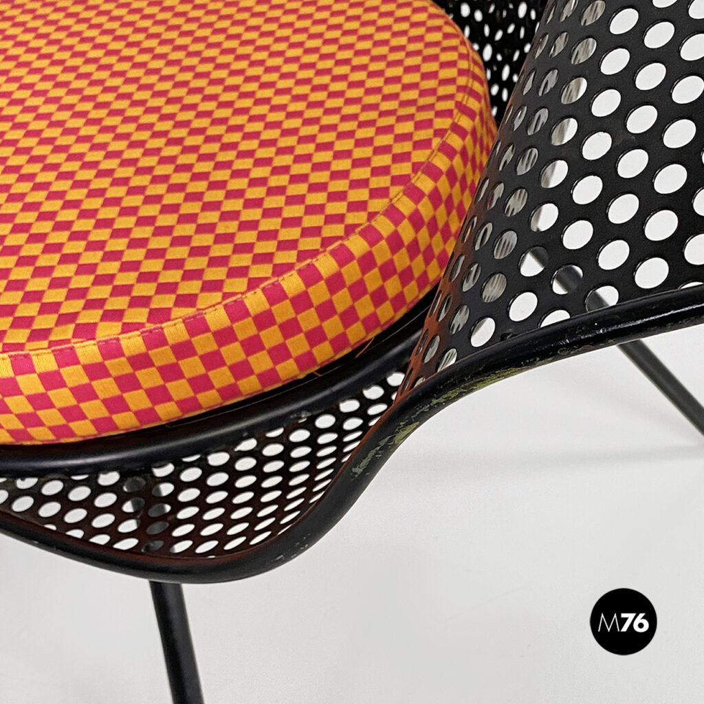 Poltrona con struttura in metallo verniciato nero, formata da due sorta di ali composte da una rete metallica, che incrociandosi vanno a creare lo schienale della poltrona. La seduta è tonda, così come il cuscino che la copre, in tessuto rosso e arancione a scacchi. L’intera struttura è sorretta da quattro zampe diagonali in tondino di metallo, sempre in colore nero.