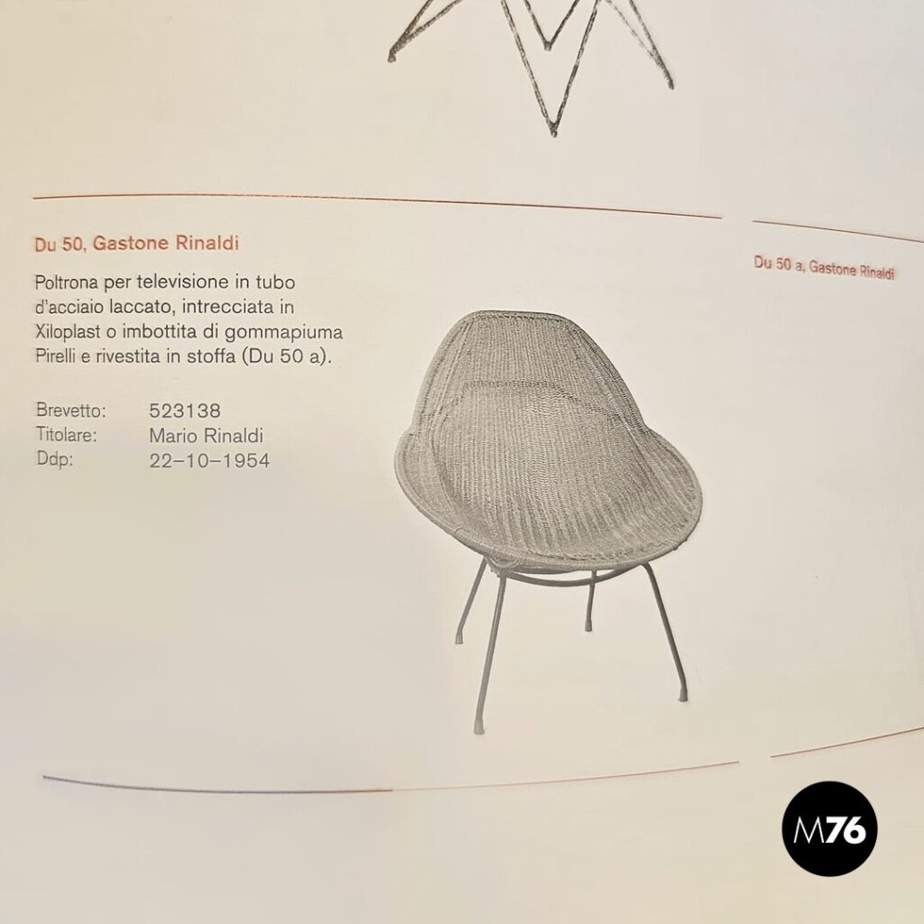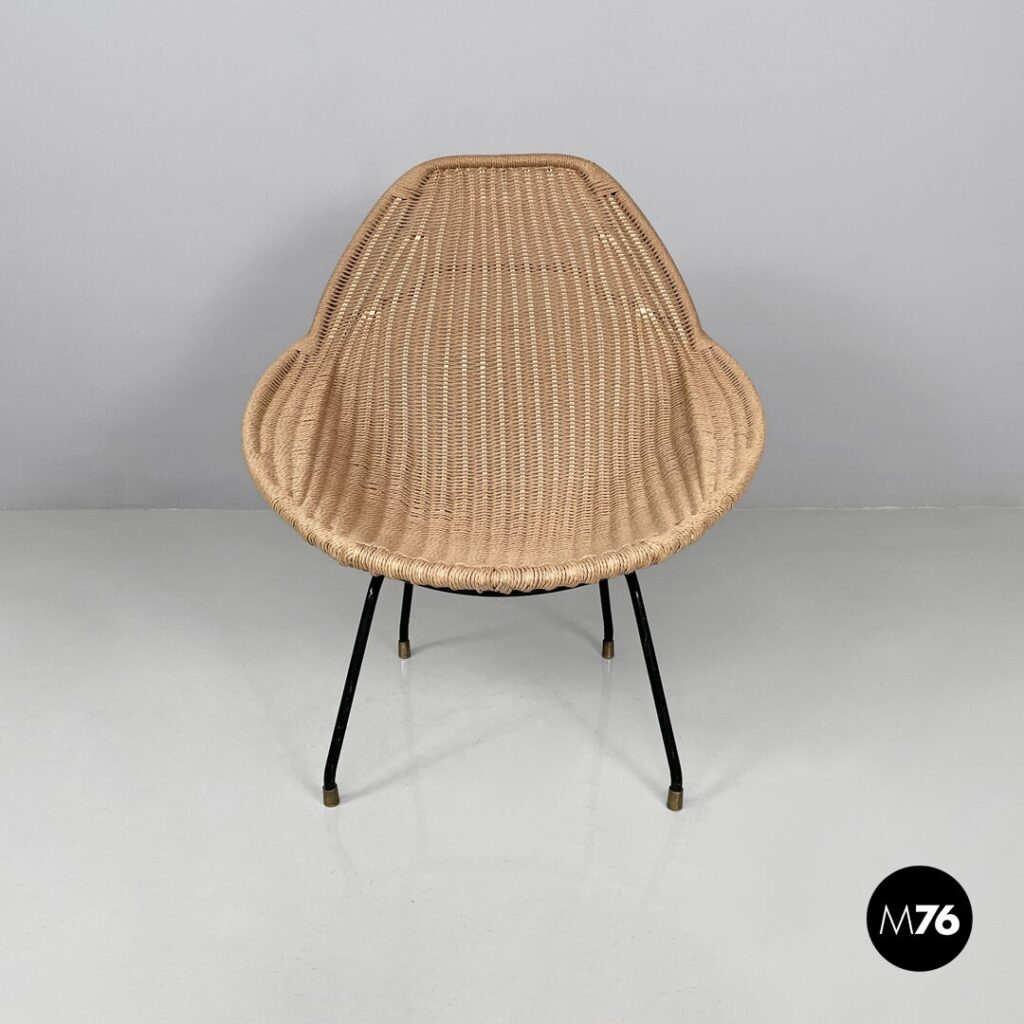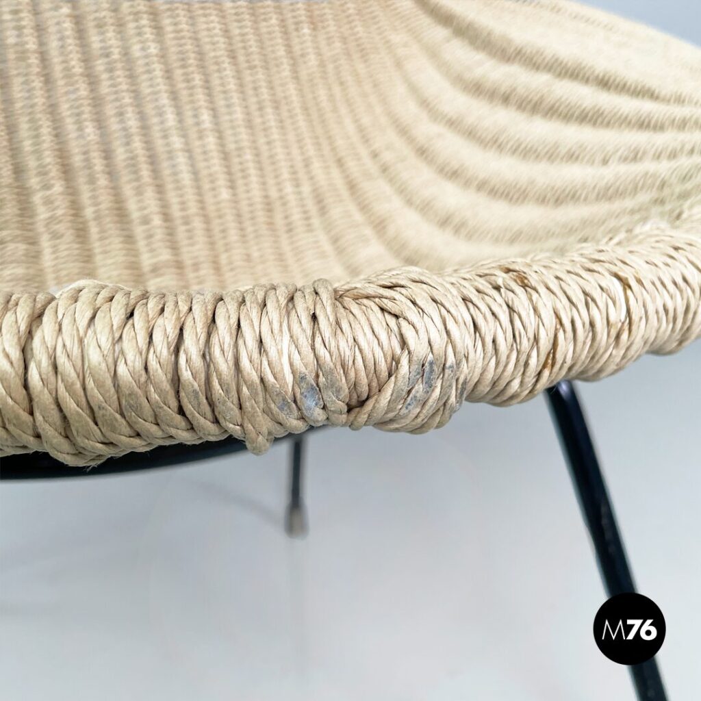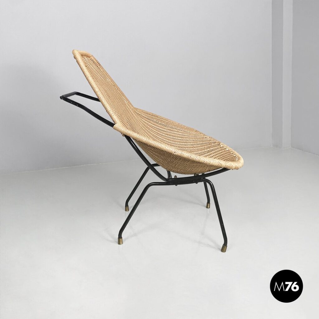 Poltrona modello Du 50 in metallo e paglia. La struttura è in tubo di acciaio laccato nero con piedini tondi in ottone. La seduta è rivestita in paglia intrecciata.