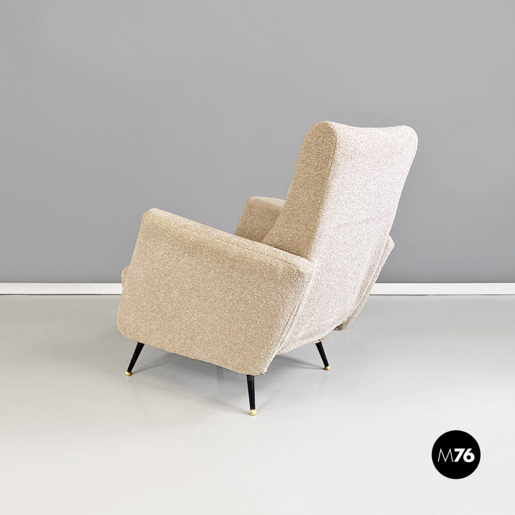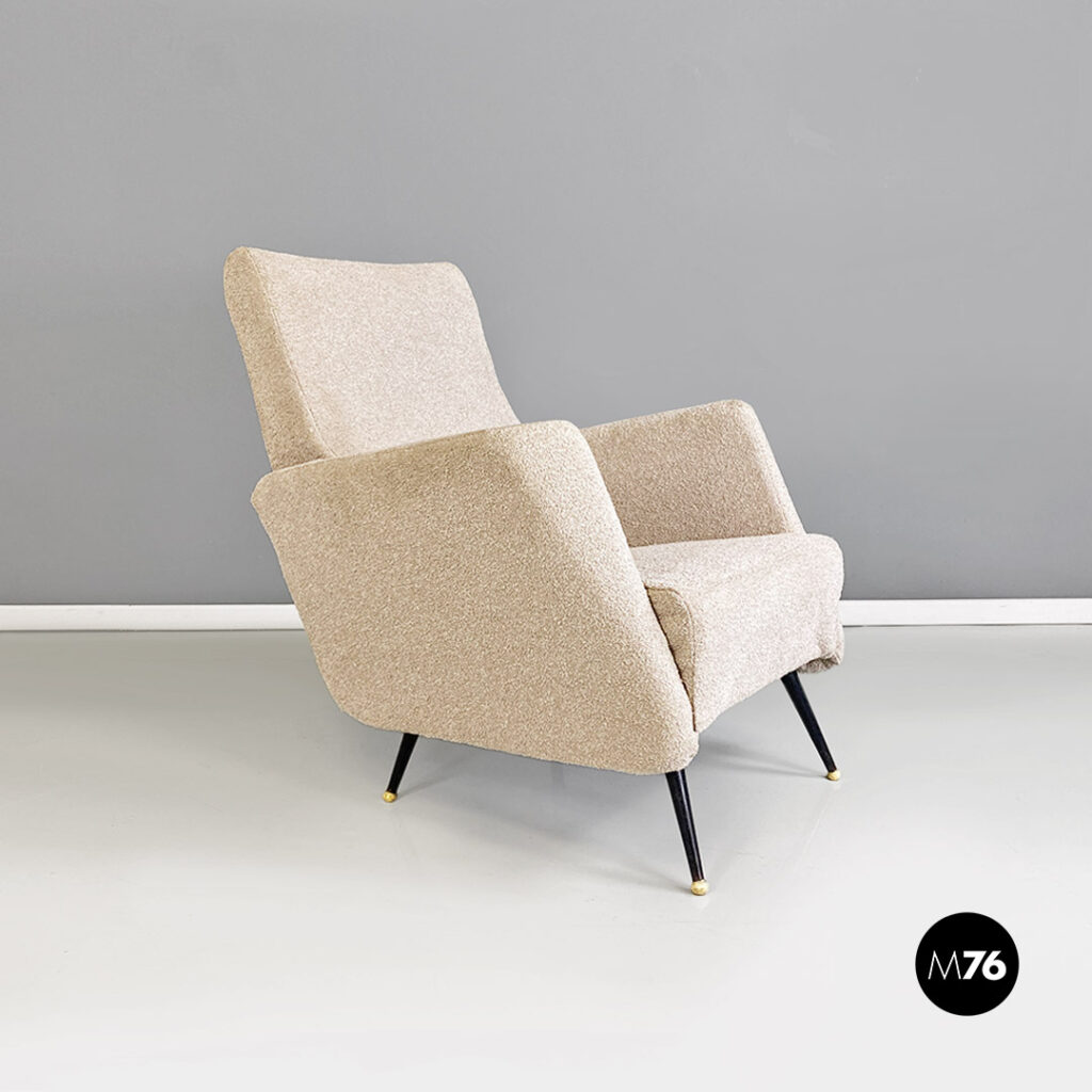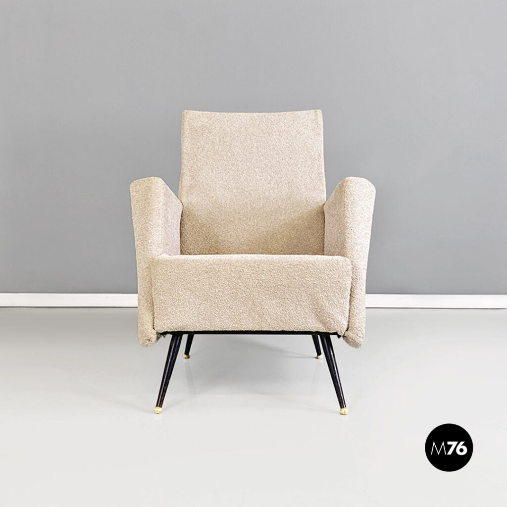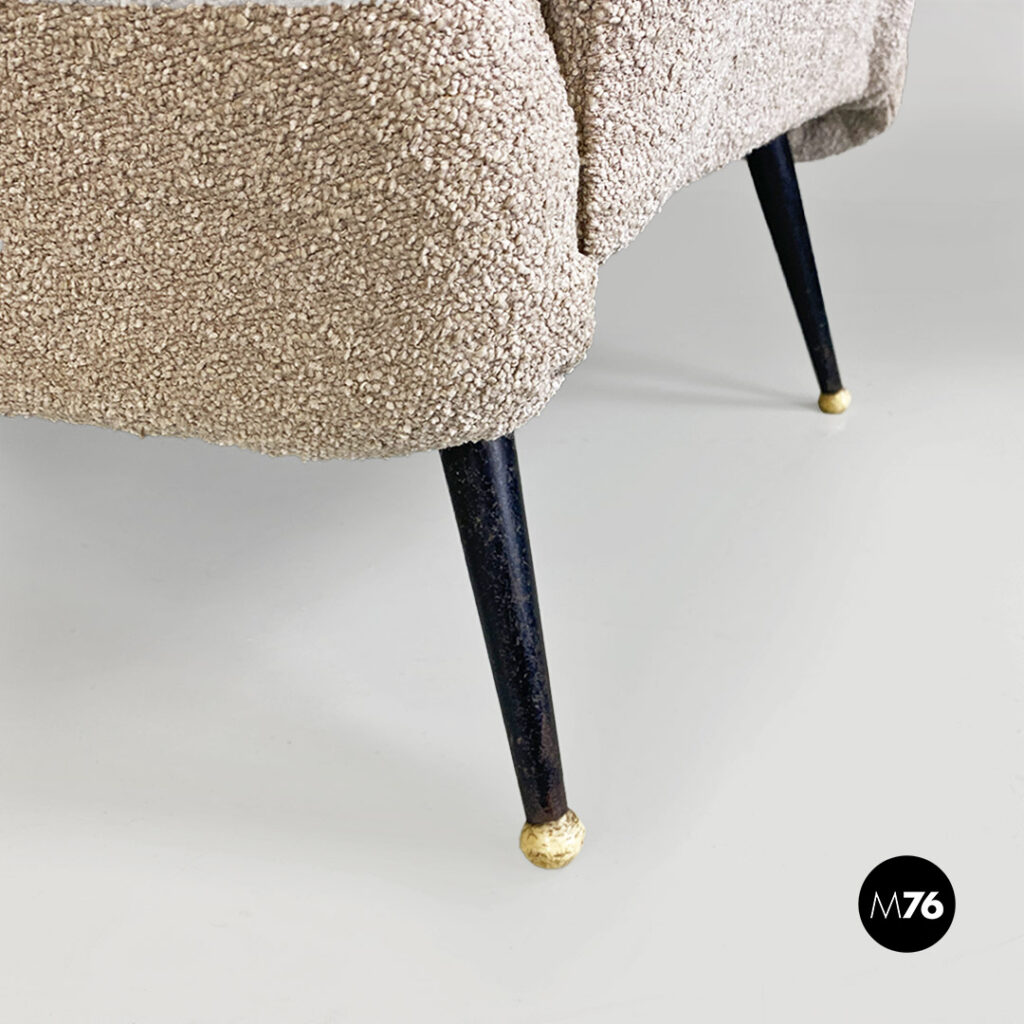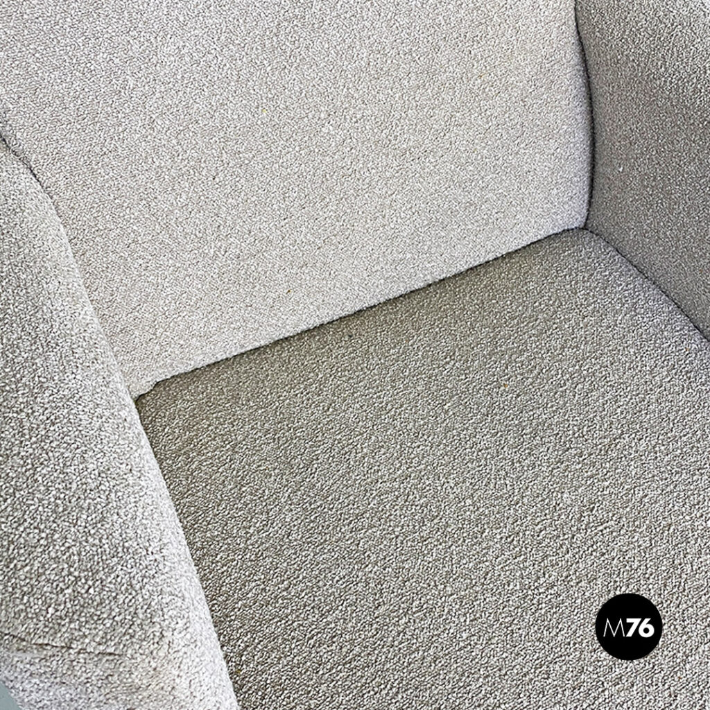 Coppia di poltrone, rivestite in tessuto bouclé grigio chiaro, con zampe in metallo verniciato nero e puntali sferici bianchi.