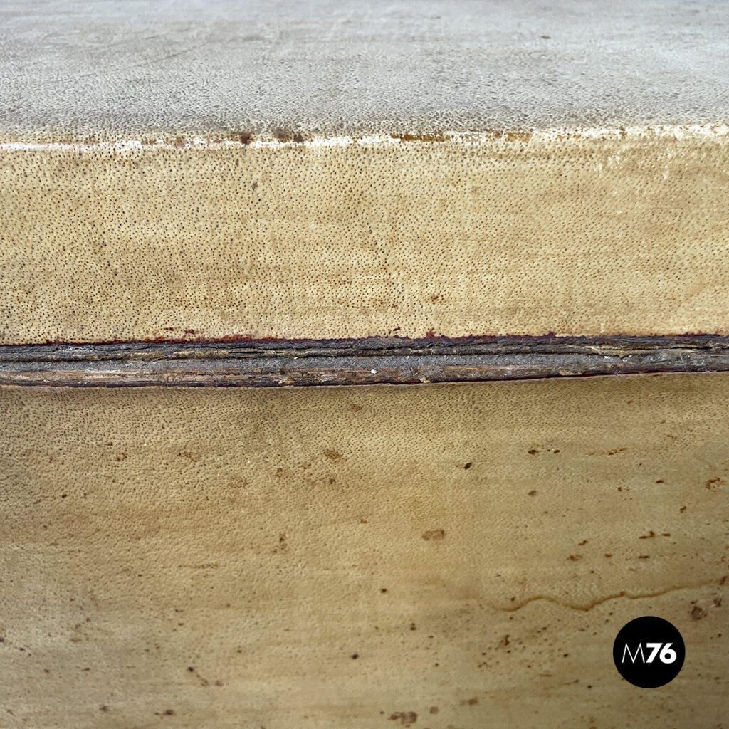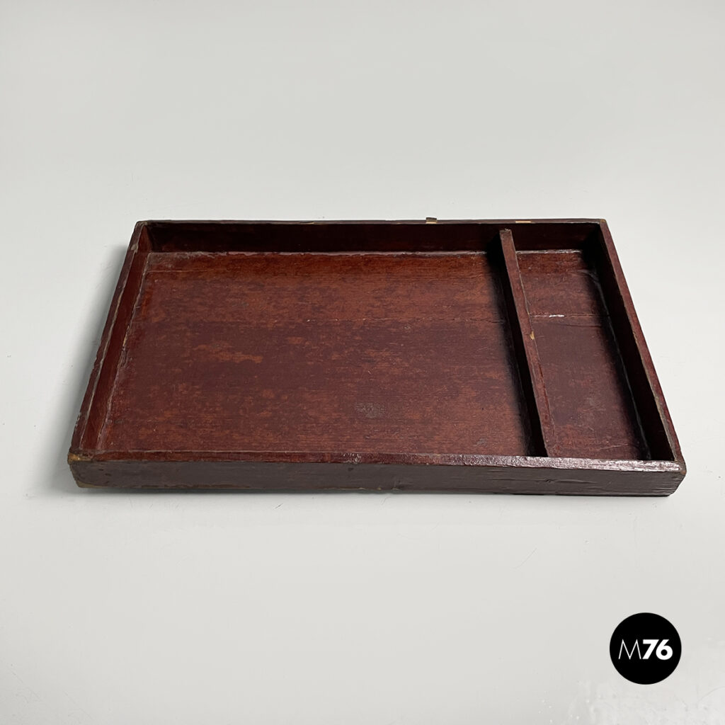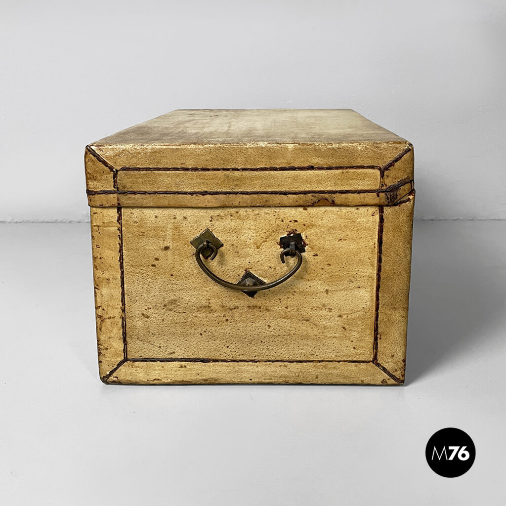 Scatola a base rettangolare con struttura in legno rivestito in carta beige. Sul fronte è presente la chiusura in ottone e sui lati delle maniglie in metallo. All’interno è presente un vano estraibile in legno. Interni azzurri. Cuciture a vista. In stil asiatico. Utilizzabile come organizer o piccolo contenitore.