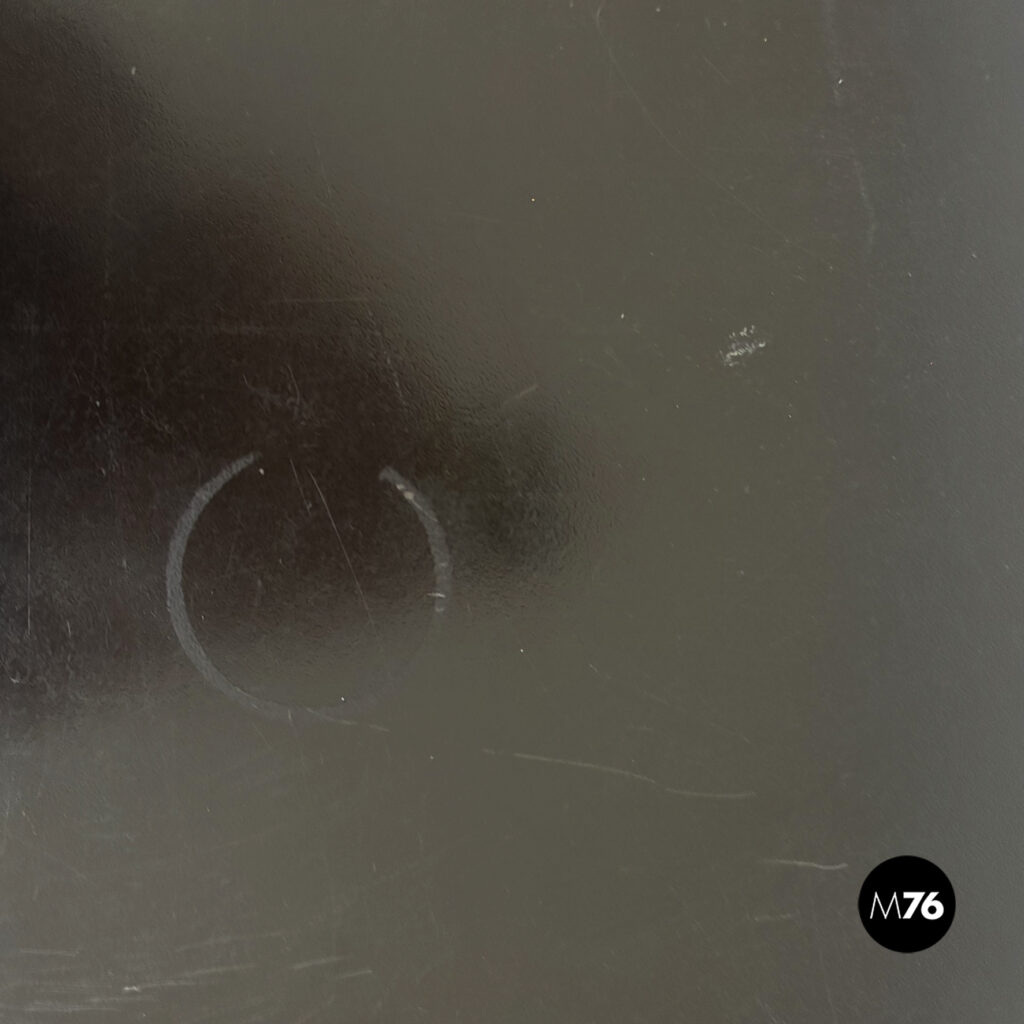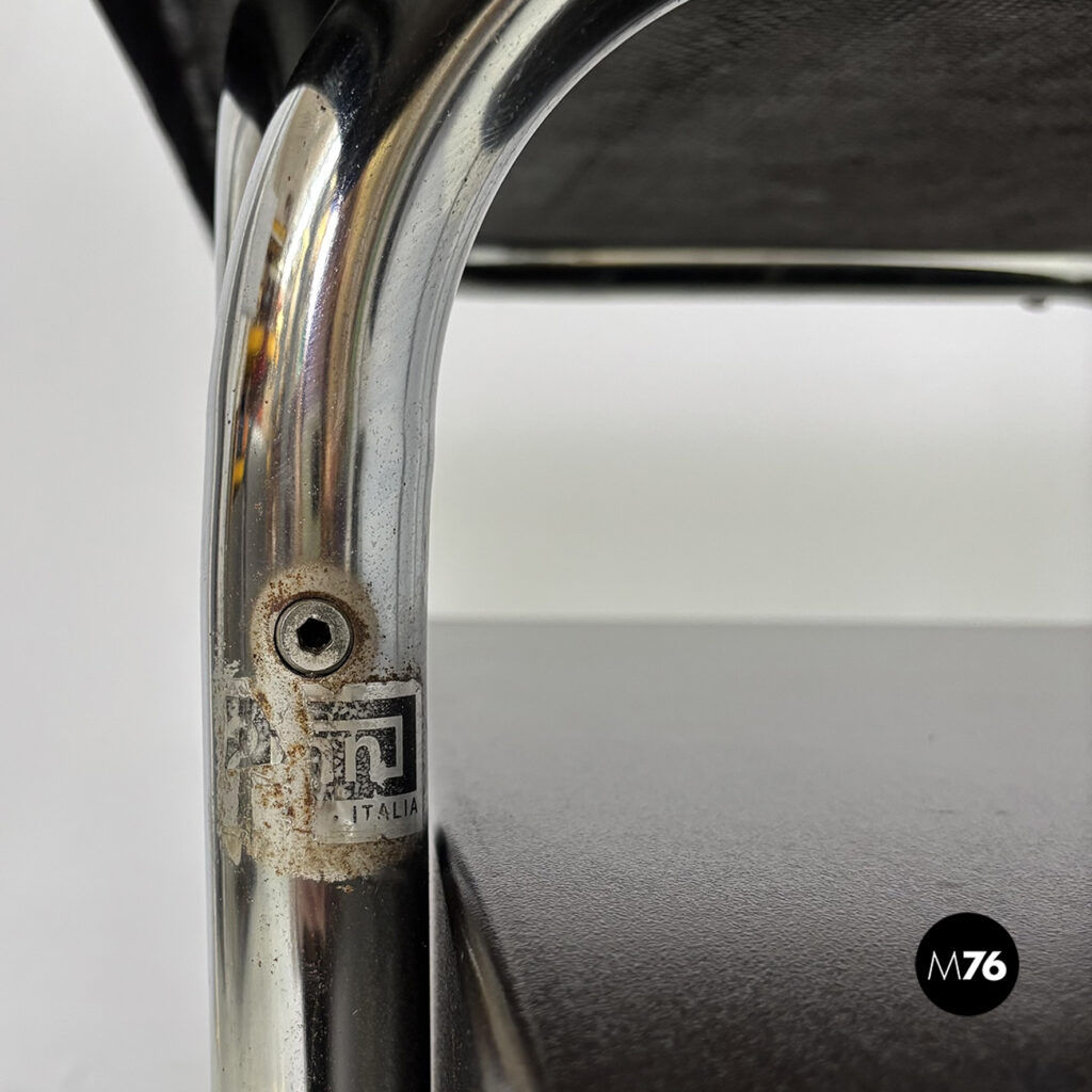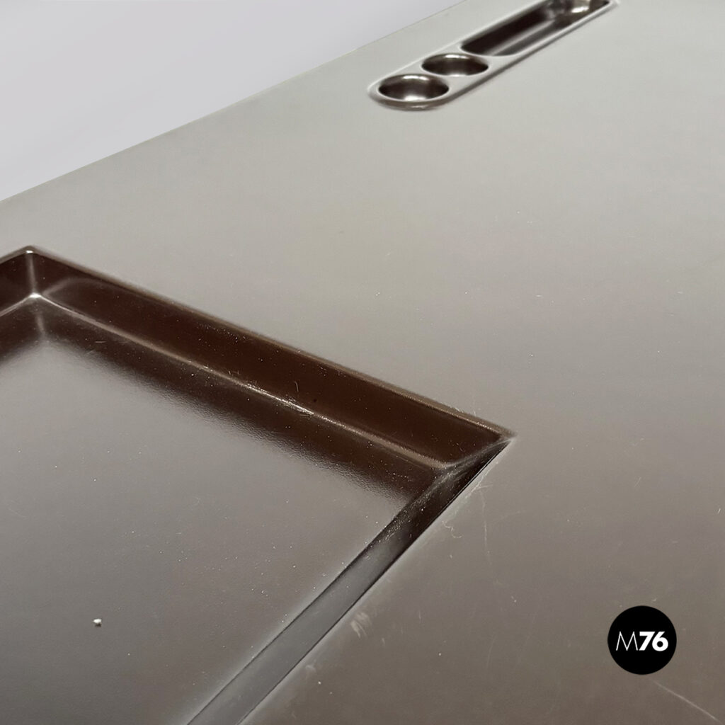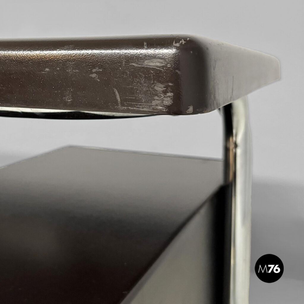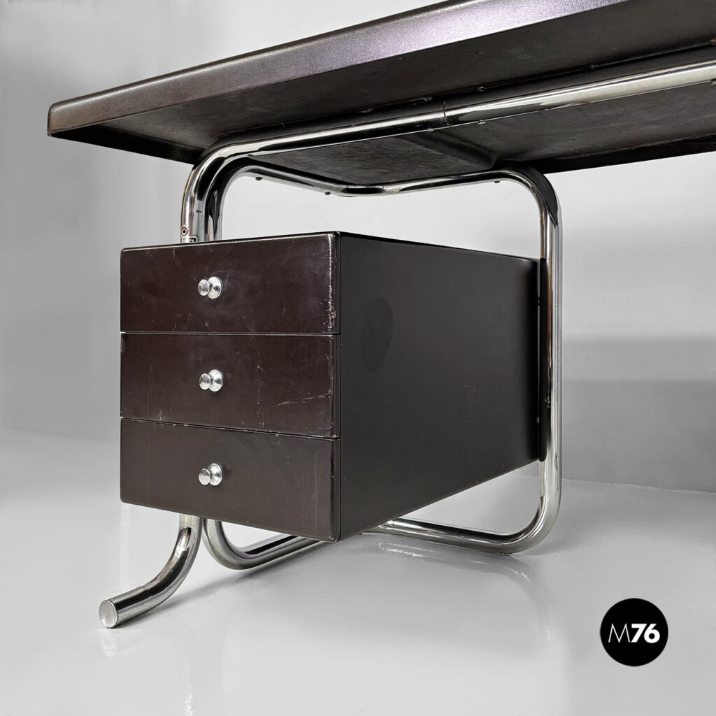 Scrivania in metallo e plastica. La struttura è in tubolare di acciaio inox curvato. Il piano rettangolare con angoli smussati è in plastica laccata colore marrone scuro con vani contenitori per oggetti da scrivania. Sul lato è presente una cassettiera composta da tre cassetti con maniglie a pomello in metallo. Appartenente allo stile Bauhaus.