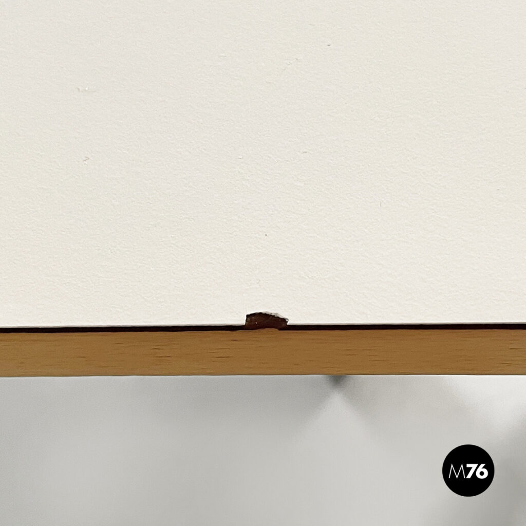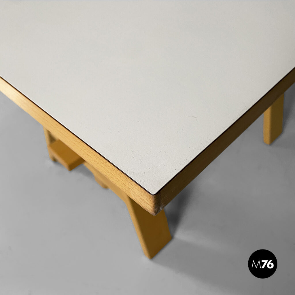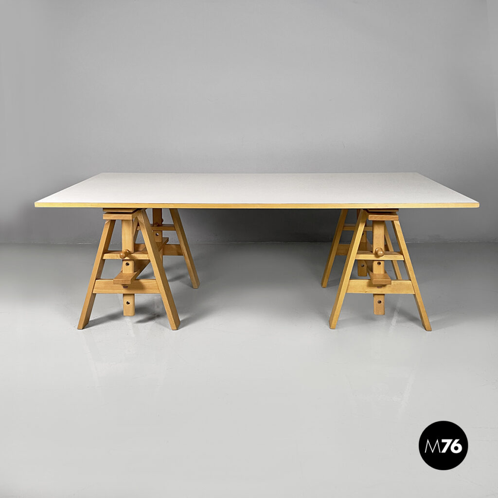 Scrivania modello Leonardo con piano rettangolare in legno con finitura bianca. Le due zampe a forma di cavalletto sono a listelli in legno. Le zampe sono regolabili in altezza. Utilizzabile anche come tavolo da pranzo.