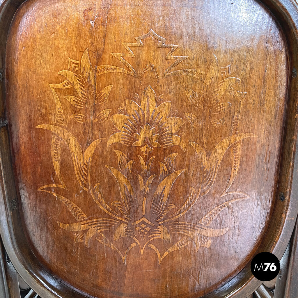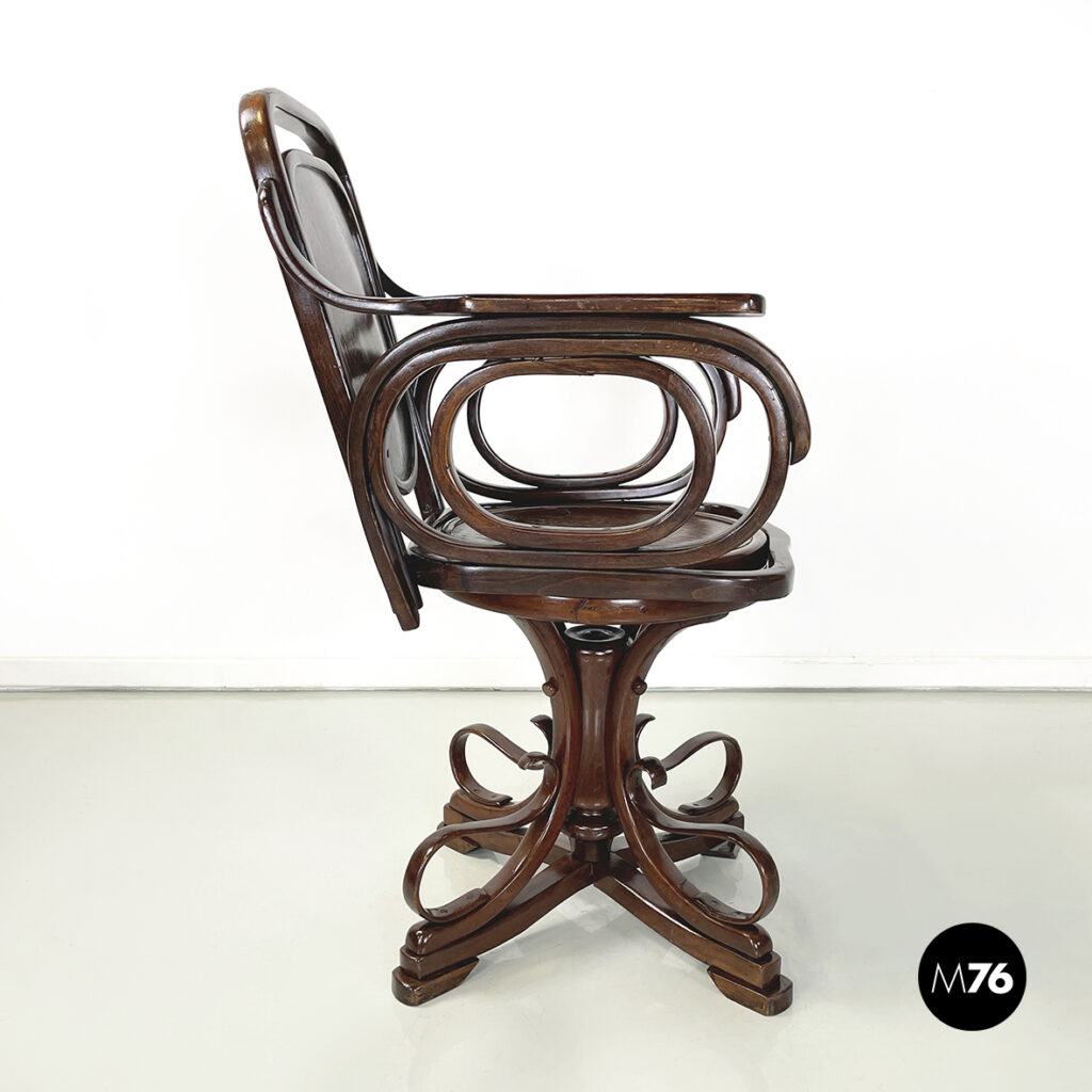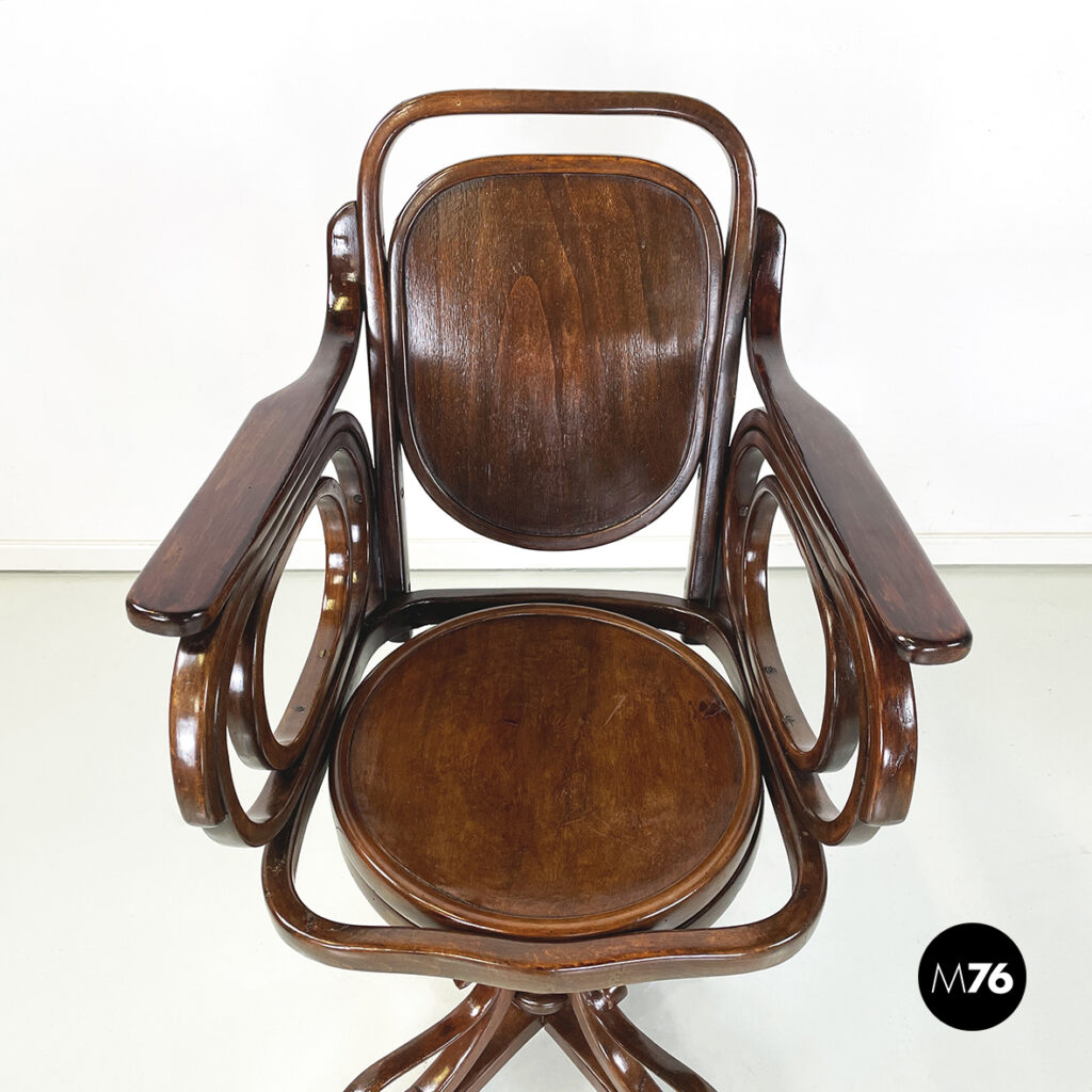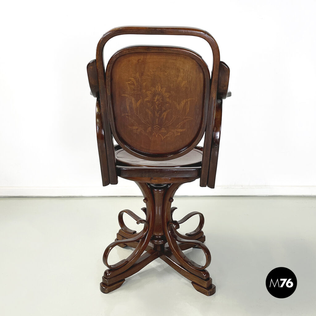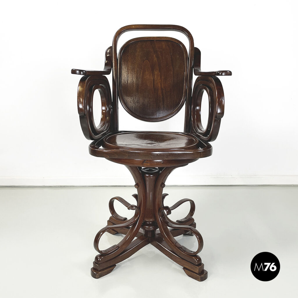 Sedia girevole interamente in legno massello. Lo schienale e la seduta sono di forma tonda. Sul retro dello schienale e sulla seduta sono presenti delle lavorazioni con disegno floreale. I braccioli ovali sono composti da listelli di legno incurvato. La base è composta da 4 razze in legno curvato finemente lavorato. Appartenente all’Art Nouveaux. Utilizzate un tempo come poltrona da barbiere.