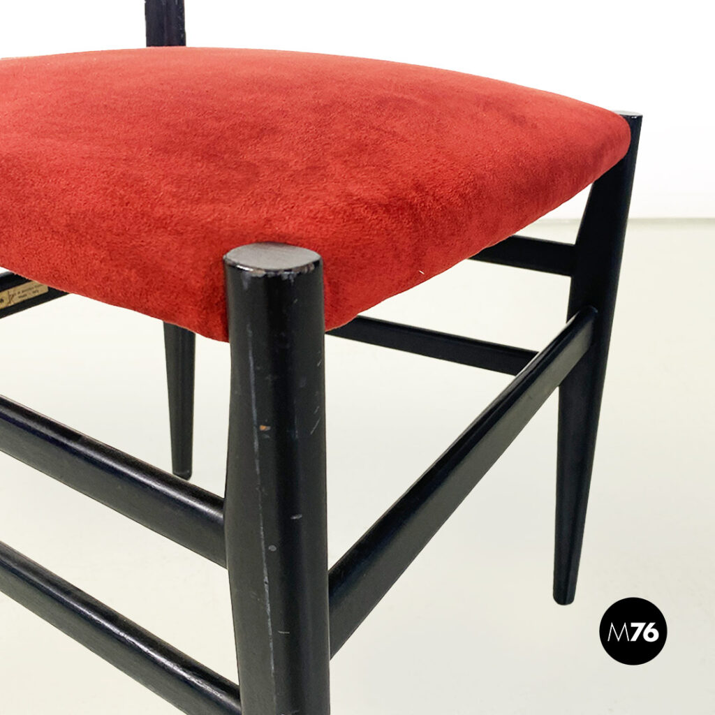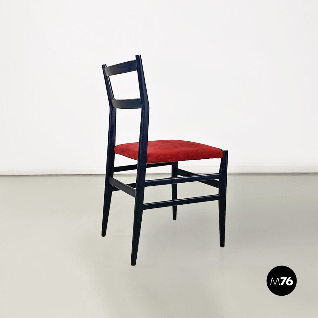 Sedia modello Leggera con struttura in legno di faggio tinto nero, con seduta imbottita e rivestita in tessuto rosso.
