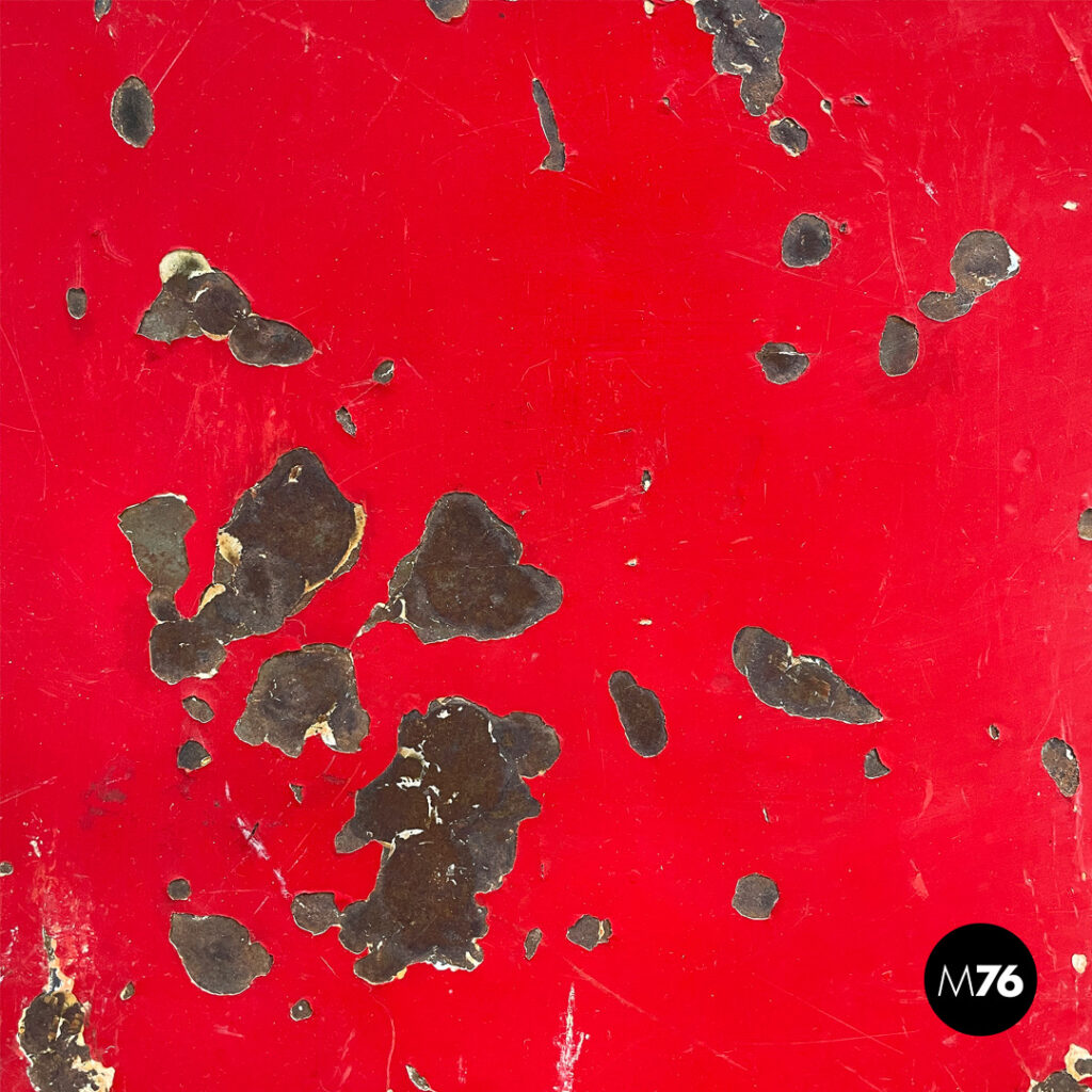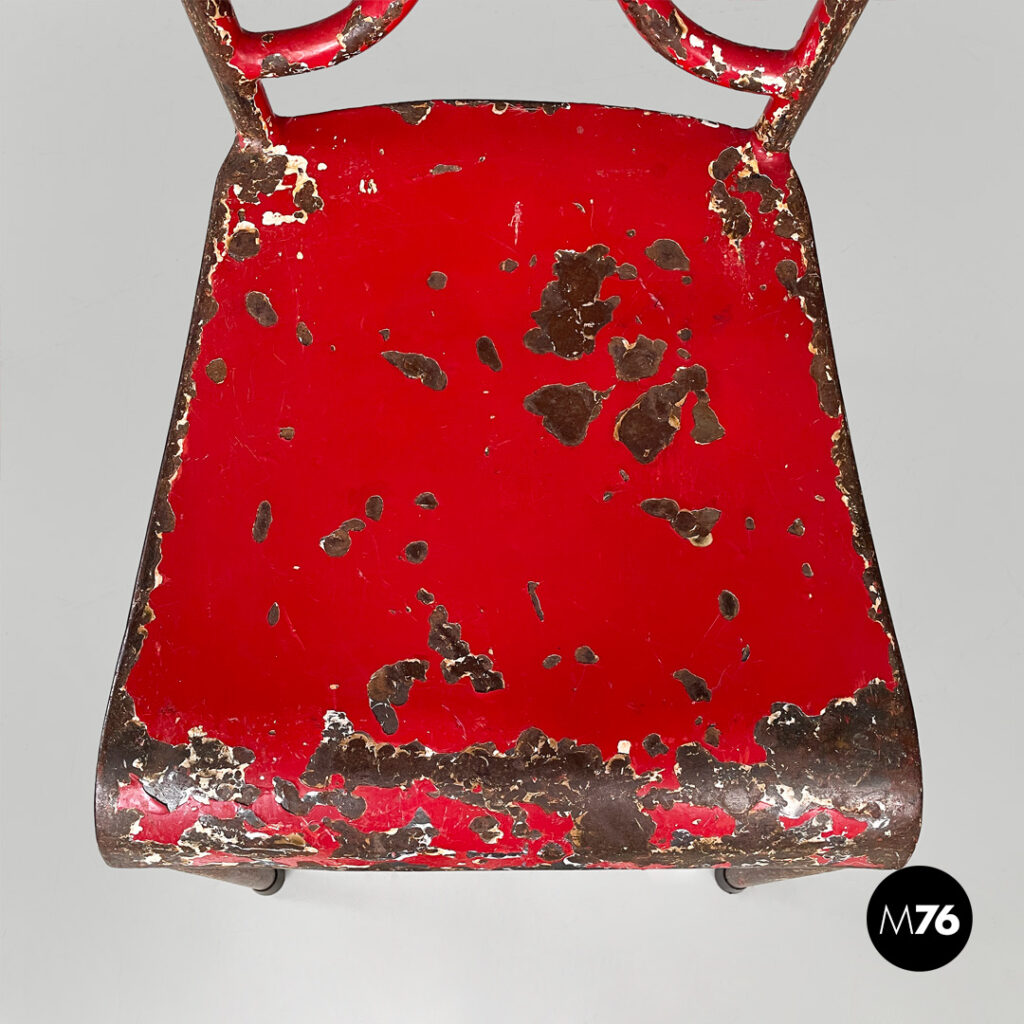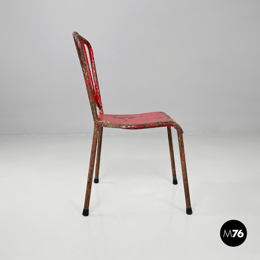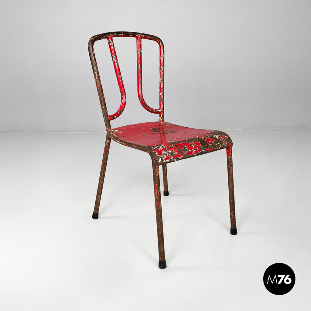 Set di sei sedie in metallo verniciato colore rosso. Lo schienale dal profilo arrotondato è composto da due elementi verticali incurvati verso il basso, che si uniscono alla base della seduta. Piedini in gomma nera.