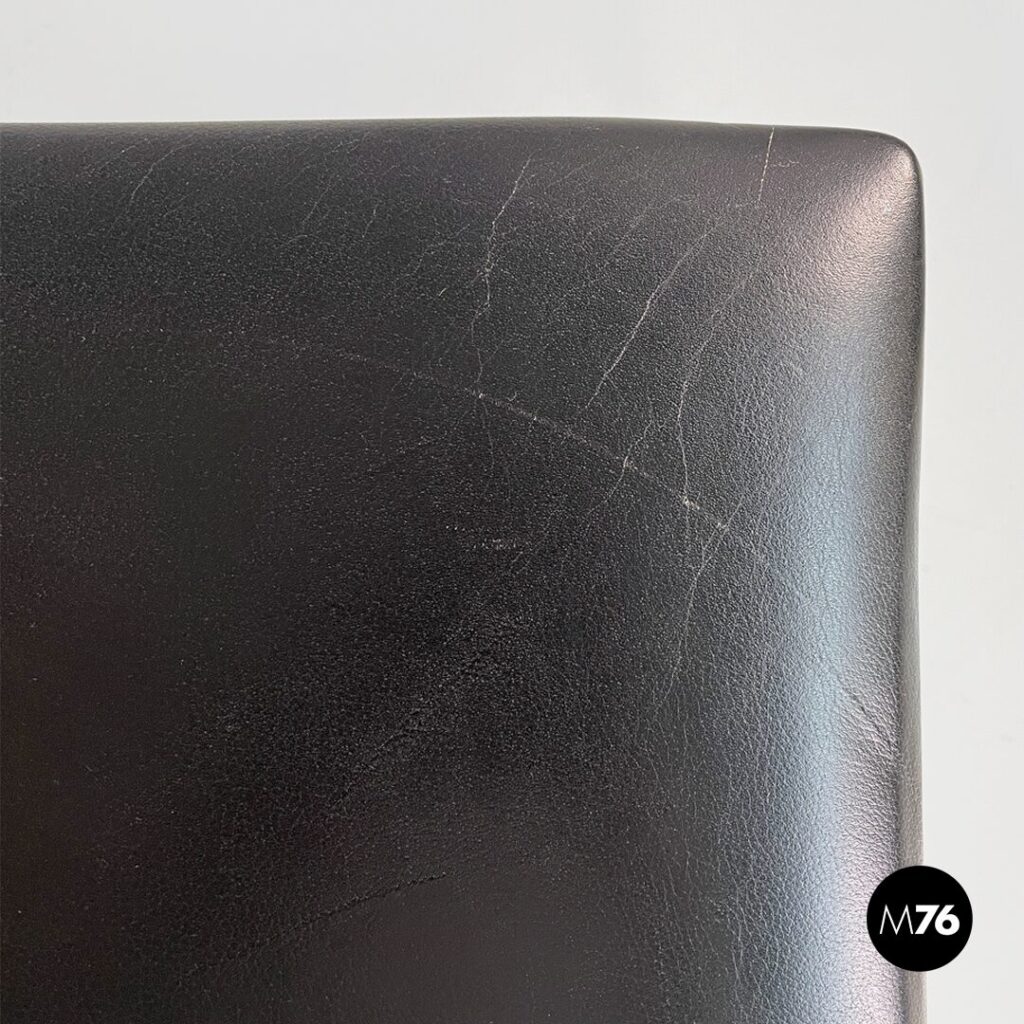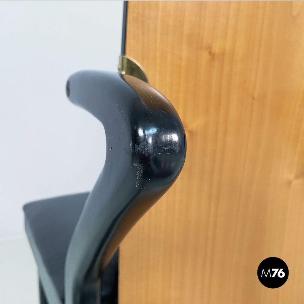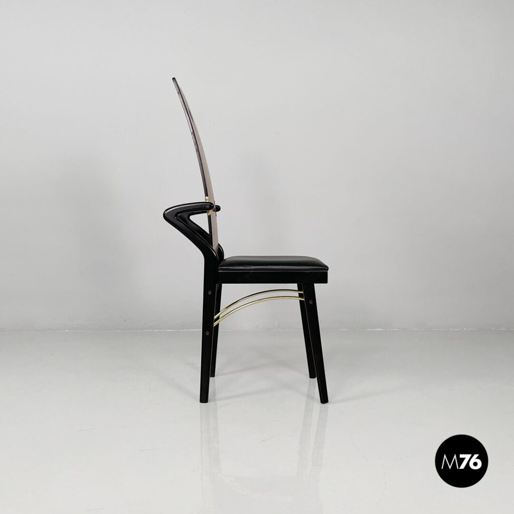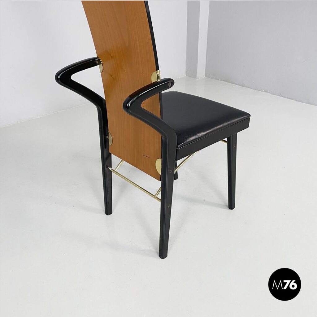 Set di quattro sedie in legno di ciliegio. Lo schienale è in legno curvato con un taglio e un foro decorativo. La seduta rettangolare è imbottita e rivestita in pelle nera con parti in legno verniciato nero. Le gambe sono in legno verniciate di nero con inserti in ottone tubolare.