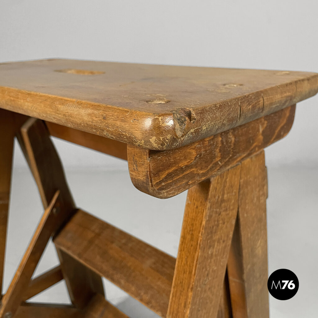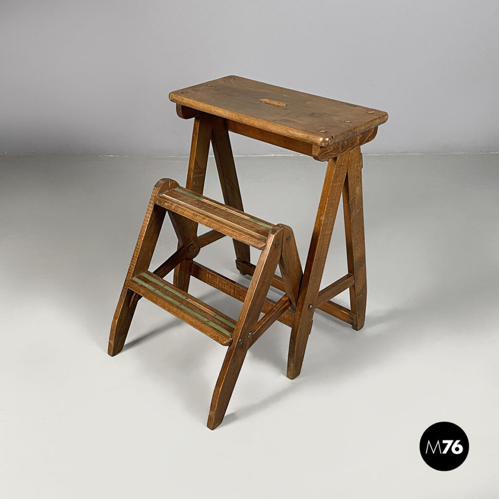 Sgabello da bar trasformabile in scala interamente in legno. La seduta rettangolare presenta un foro centrale. La scala a listelli presenta due scalini, oltre la seduta.