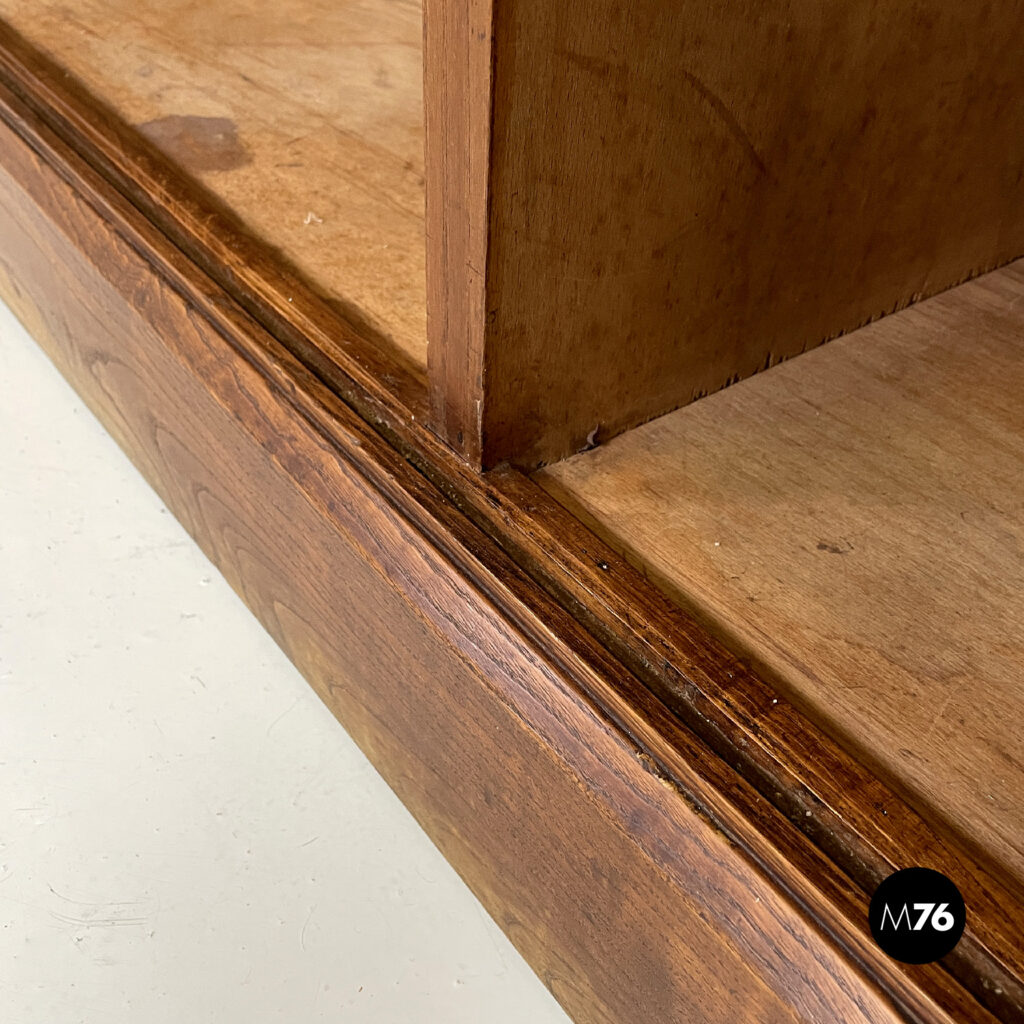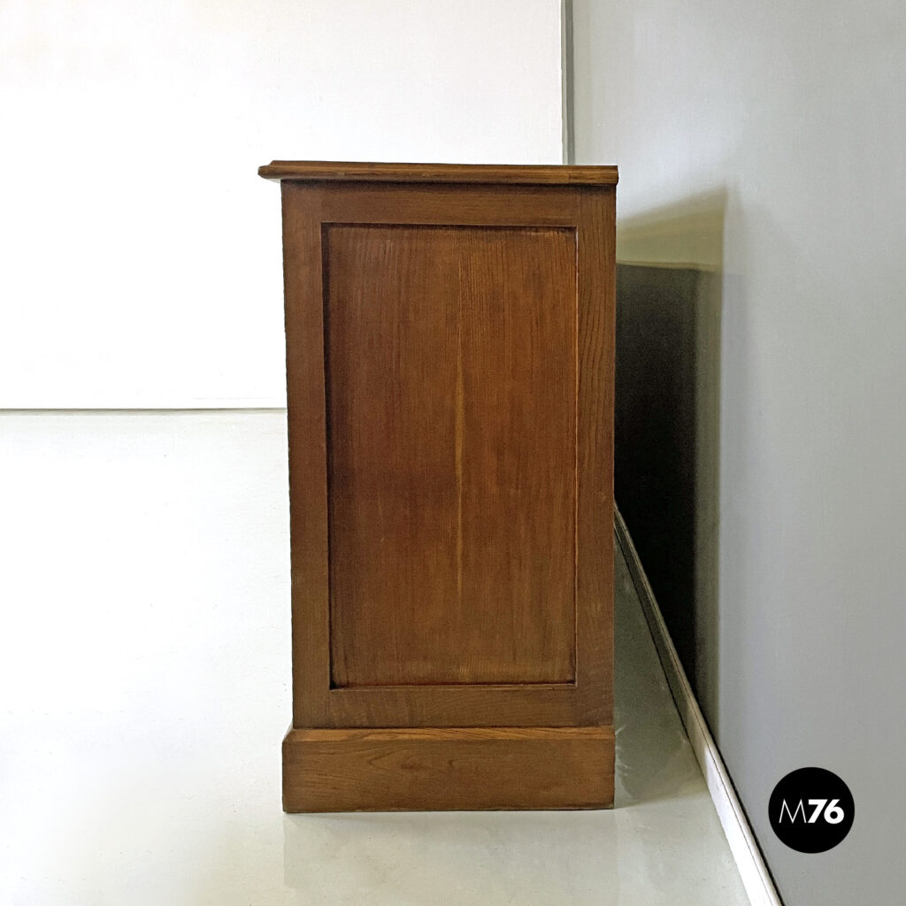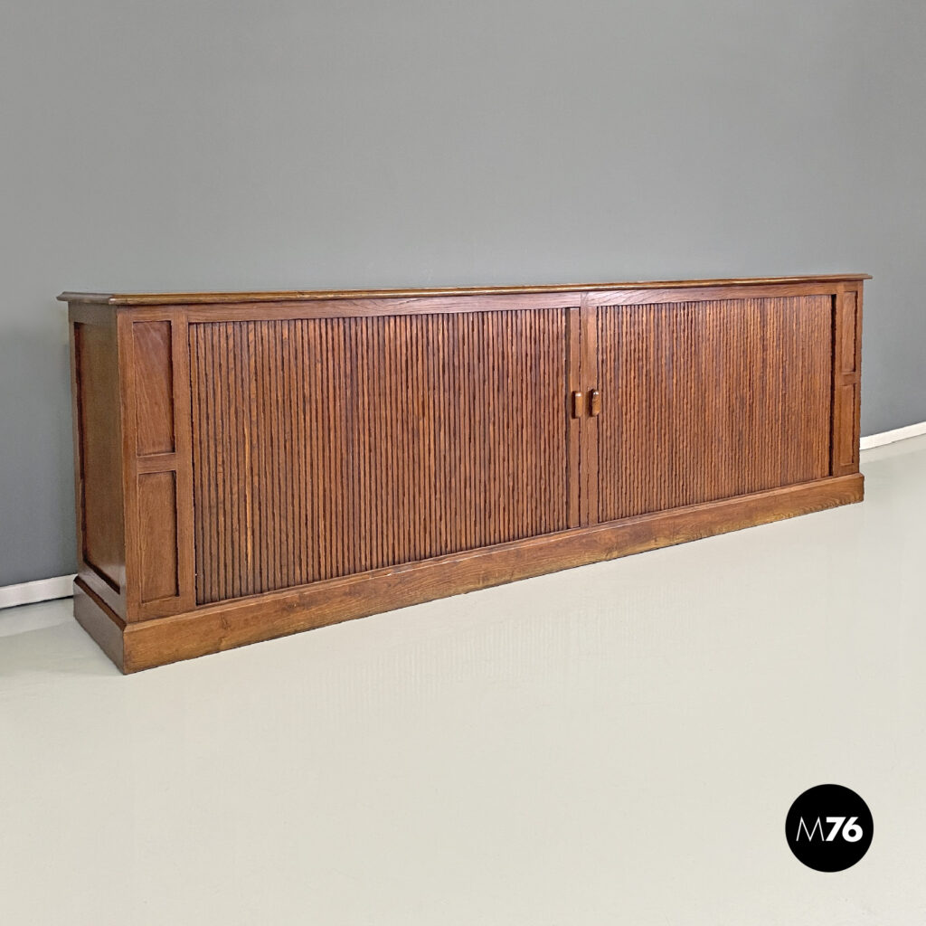 Sideboard a base rettangolare interamente in legno. Il piano è composto da una tavola in legno rettangolare liscia con i bordi sagomati e leggermente più larghi della struttura centrale. Presenta per tutta la lunghezza un’apertura a serrandina che si apre fino ai bordi, con due pomelli centrali in legno di forma allungata. All’interno della credenza si trovano sei vani più ampi di forma rettangolare e otto vani più piccoli verticali.