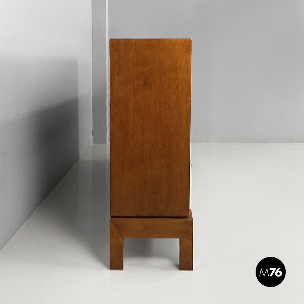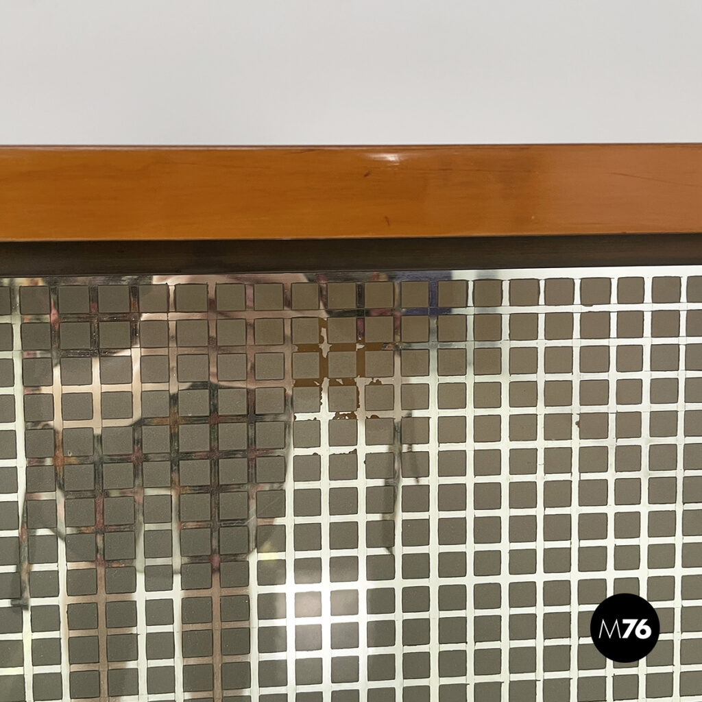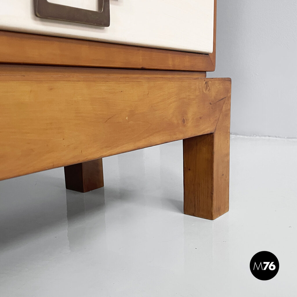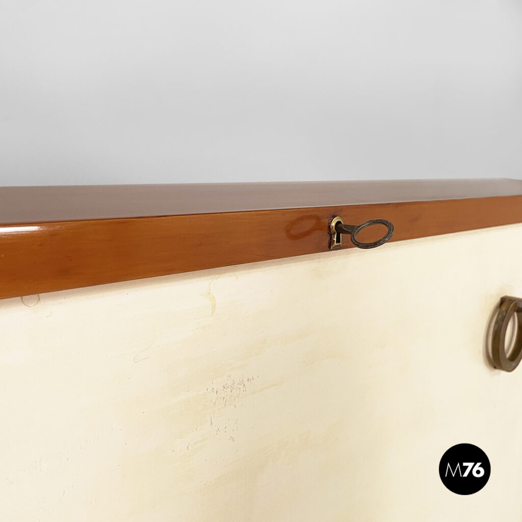 Sideboard o credenza a base rettangolare in legno e vetro. Nella parte superiore sono presenti sui lati due vani con anta a battente in vetro quadrettato, una mensola in legno e maniglie in ottone. Il vano centrale presenta un’anta a ribalta in legno con finitura in pergamena bianca, una mensola interna in vetro e maniglie tonde in ottone. Nella parte inferiore sono presenti sei cassetti, divisi in quattro colonne, in legno con finitura in pergamena bianca e con maniglie in ottone. Piedini a sezione squadrata in legno. Art Deco