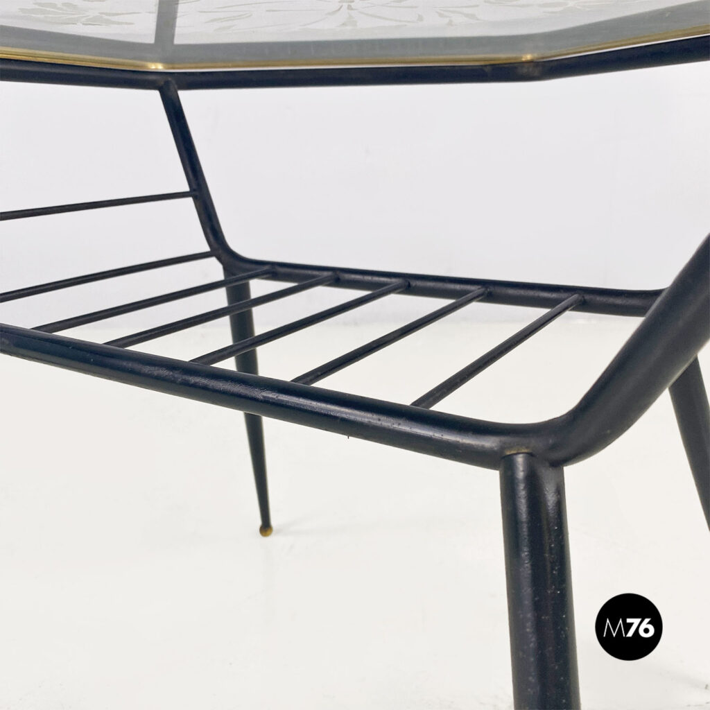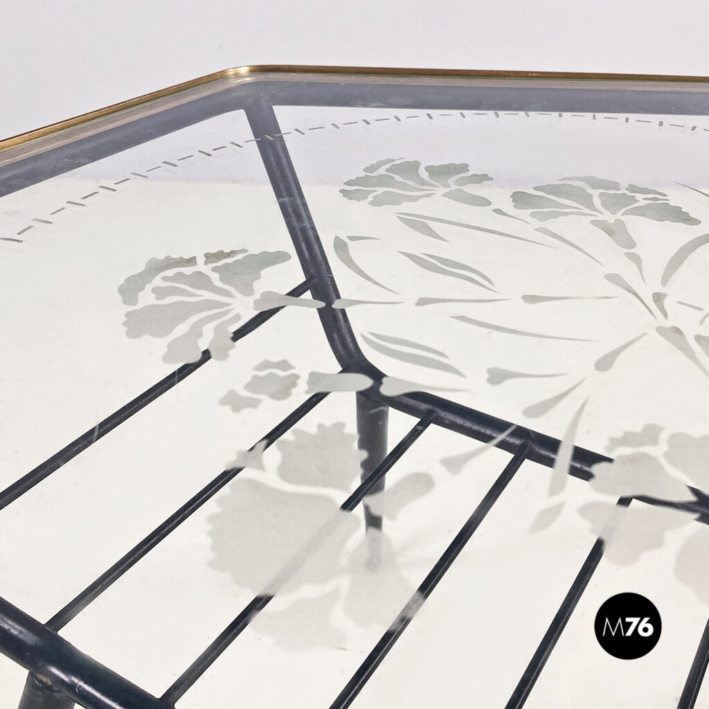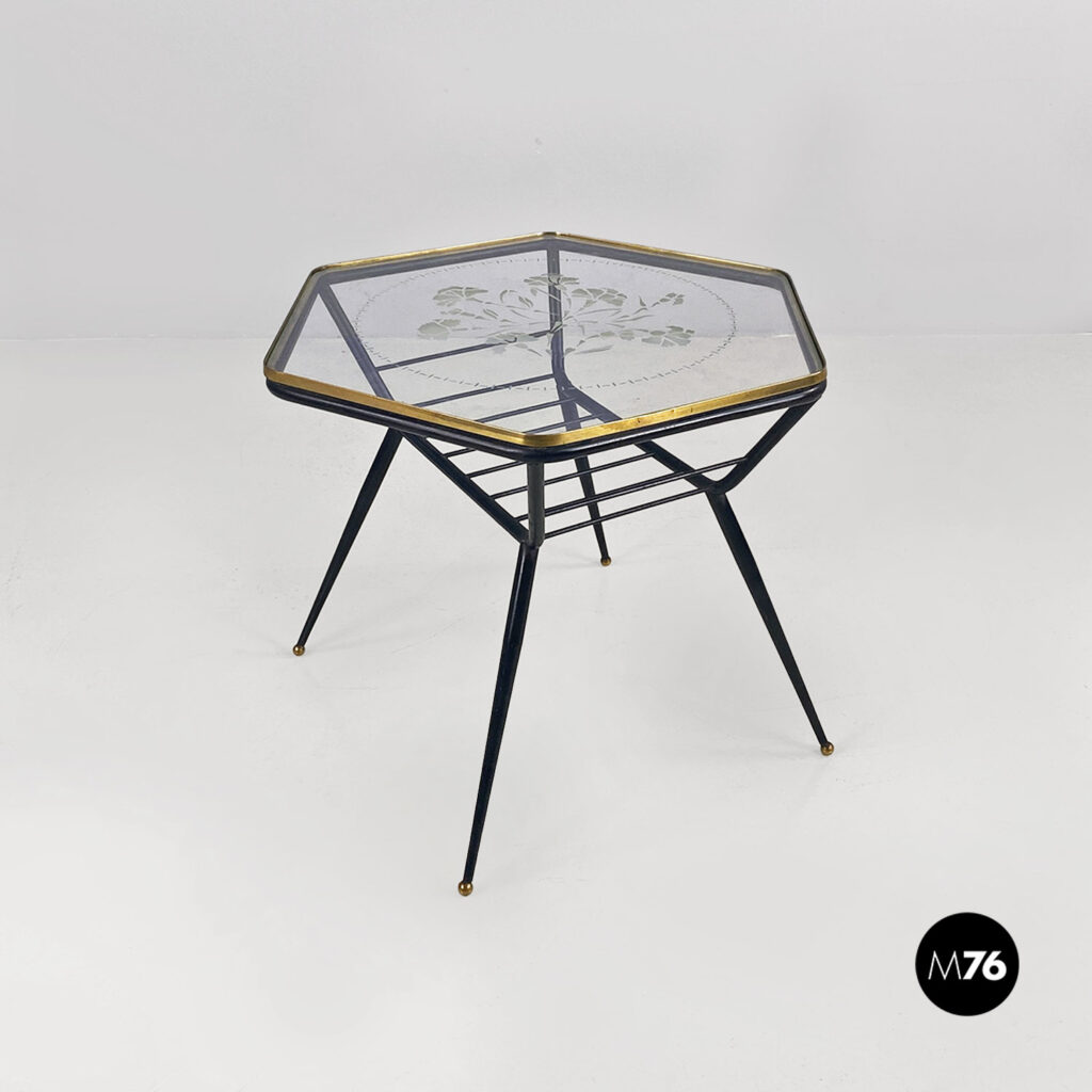 Tavolino da caffè con portariviste, con struttura in tondino di metallo, piano esagonale in vetro trasparente con disegno decorativo e bordo in ottone e puntali a sfera sempre in ottone.