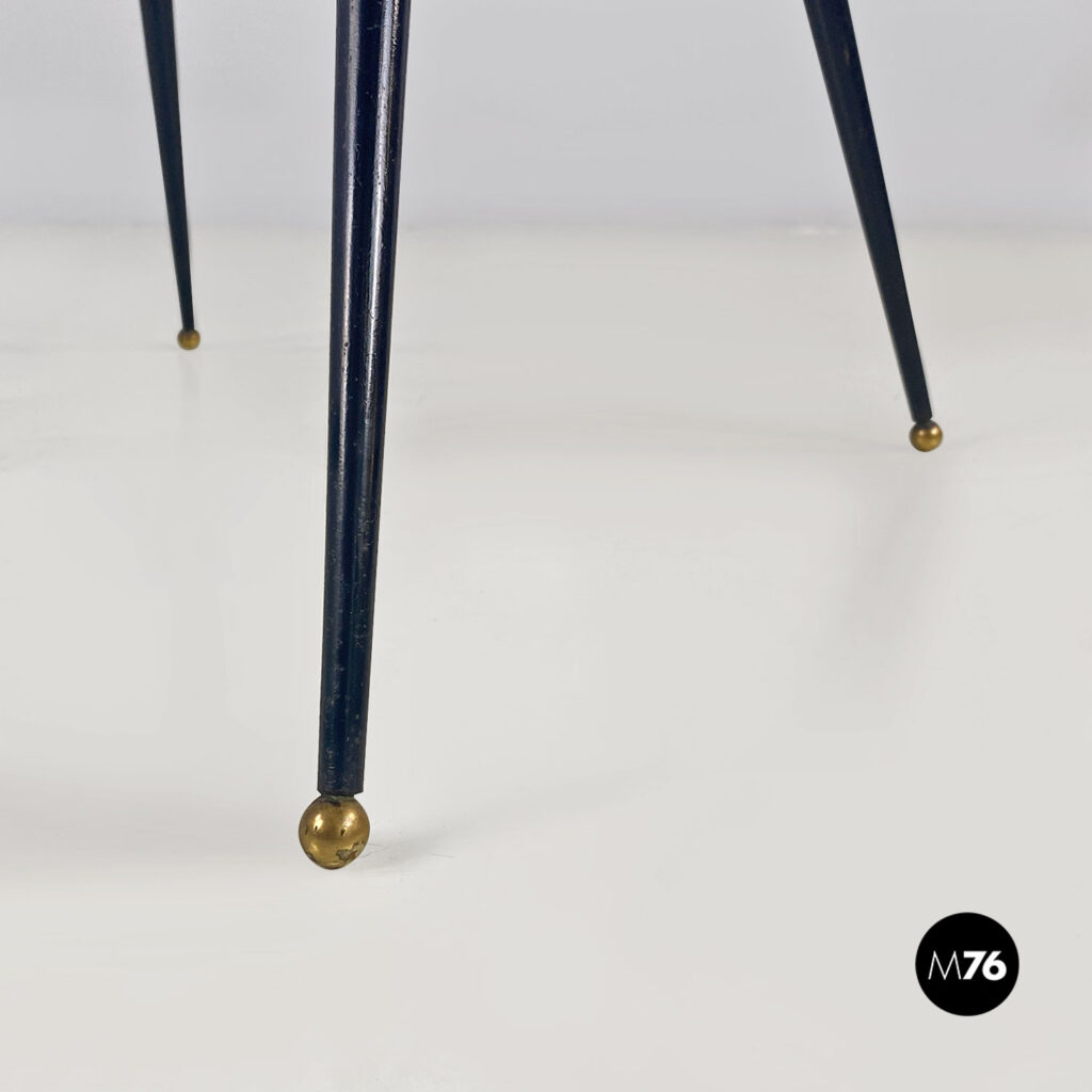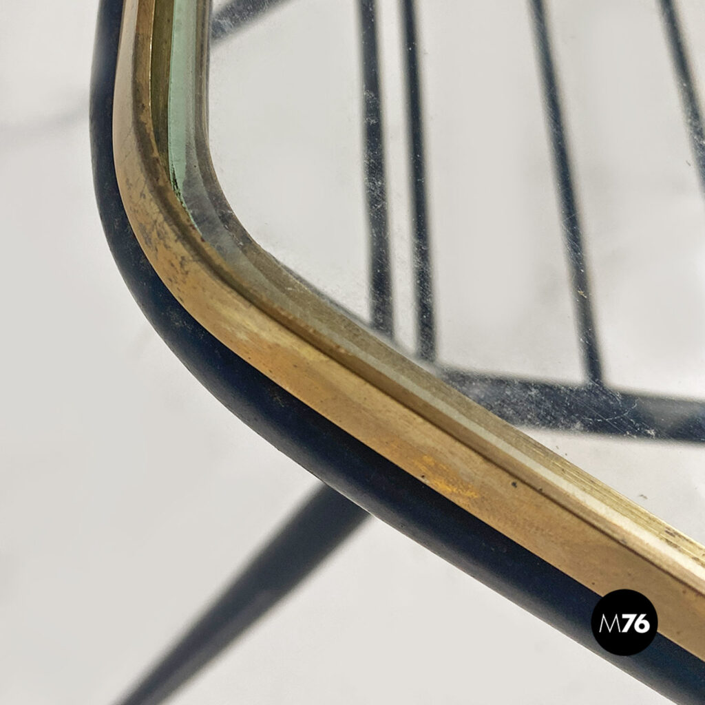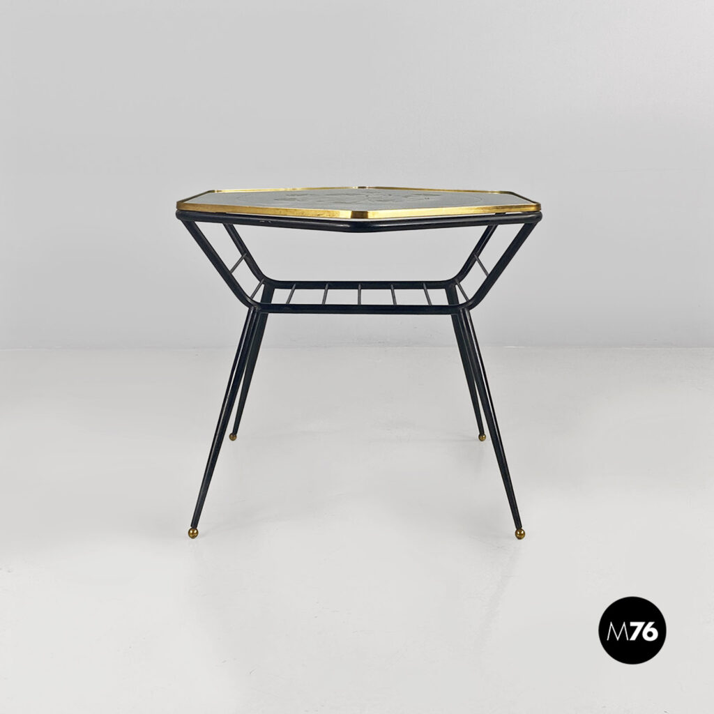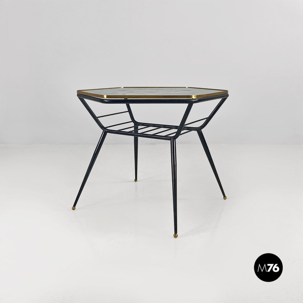 Tavolino da caffè con portariviste, con struttura in tondino di metallo, piano esagonale in vetro trasparente con disegno decorativo e bordo in ottone e puntali a sfera sempre in ottone.