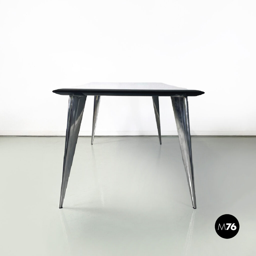 Tavolo da pranzo mod. M rettangolare. Il piano è in legno verniciato nero lucido con sagomatura speculare nella parte inferiore e superiore su tutto il perimetro. Le gambe, in metallo, sono a sezione irregolare: partono dal piano con sezione ellittica che diventa tonda nell’appoggio a terra della zampa.