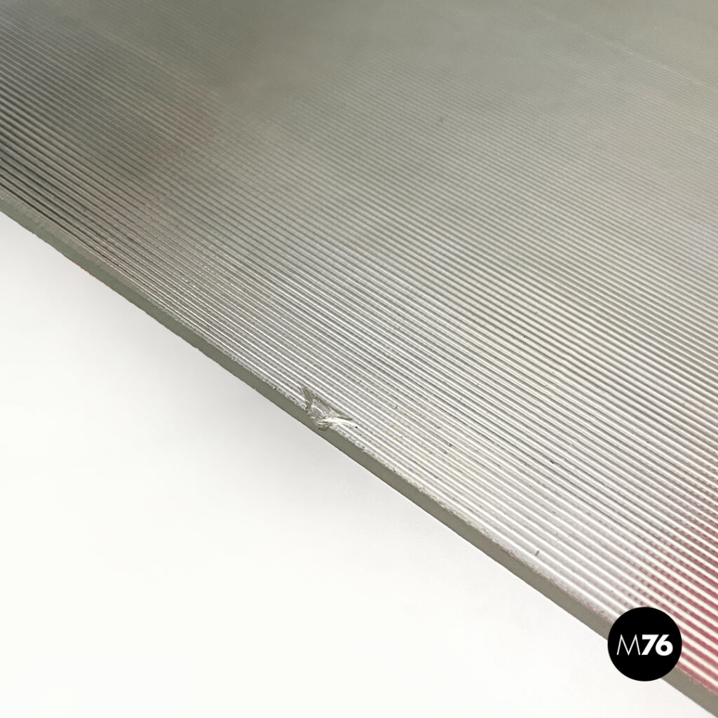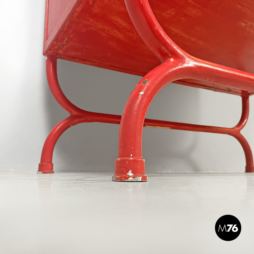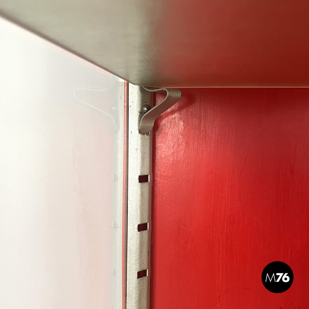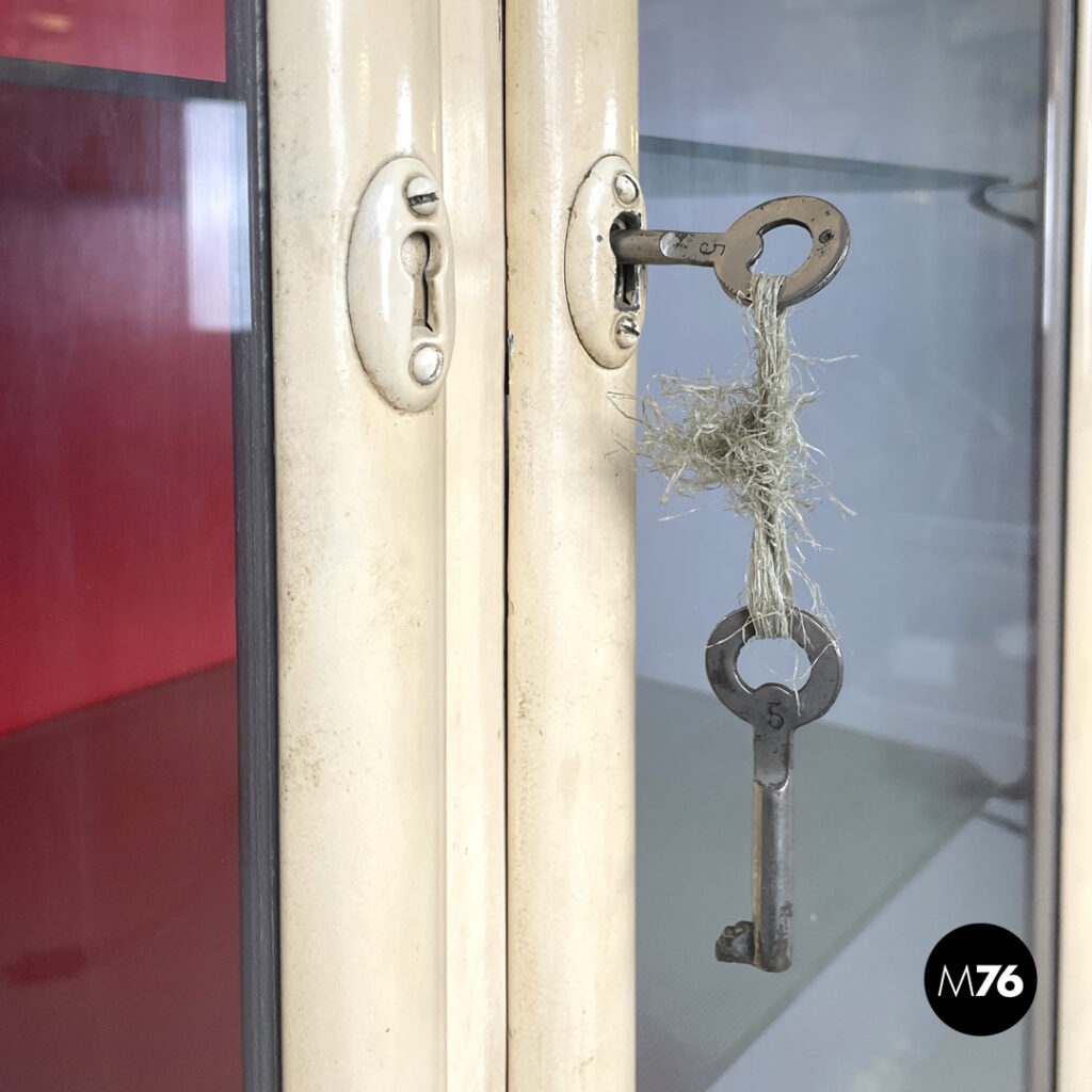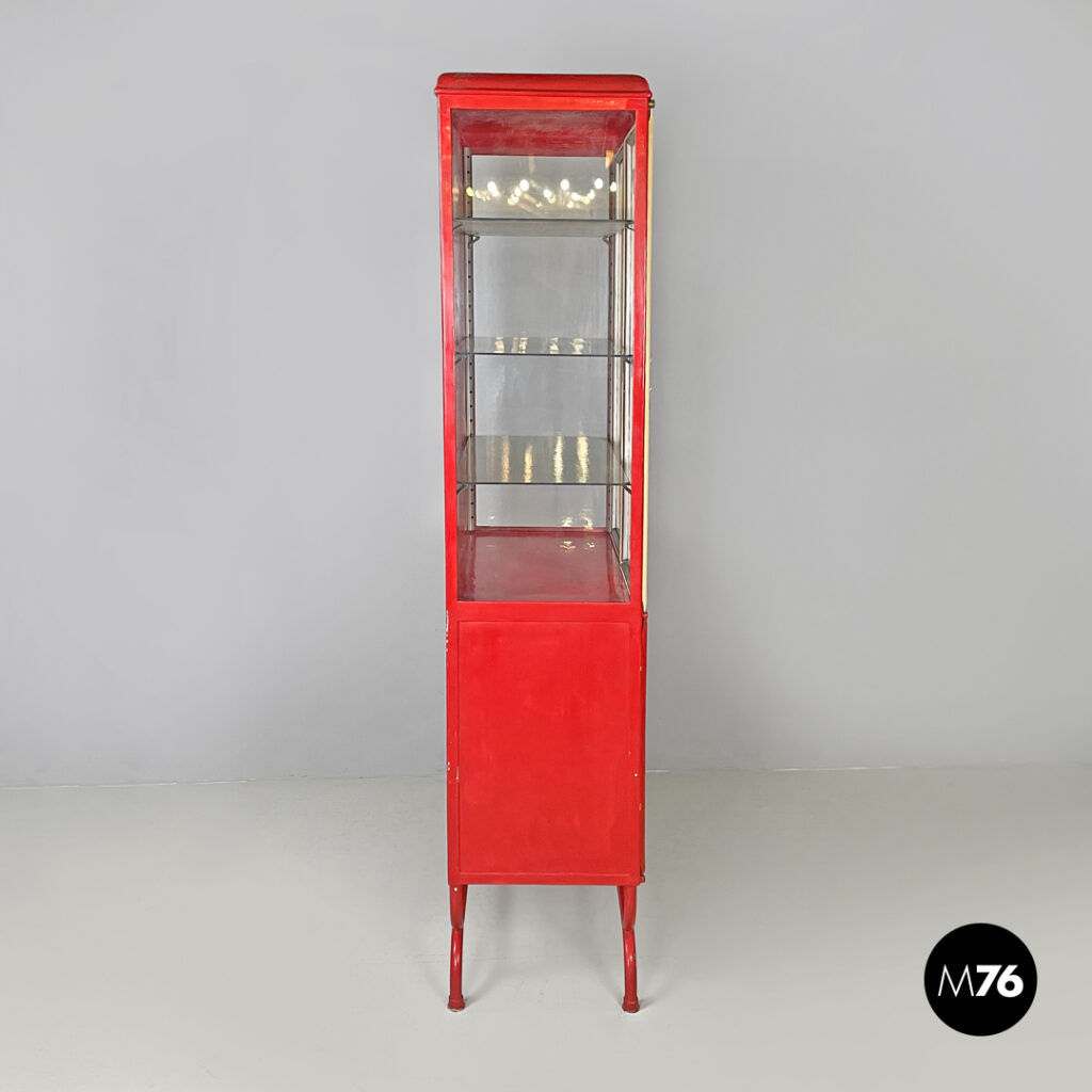 Vetrina in metallo verniciato rosso a base rettangolare. Presenta due ante in vetro con chiave funzionante, che si aprono su un vano interno suddiviso in quattro parti da tre mensole in vetro trasparente con un decoro a righe. Le mensole possono essere disposte a piacimento spostando gli angoli in metallo sulle cremagliere. Nella parte bassa della struttura si trovano altre due ante, le gambe sono in tubolare di metallo anch’esse rosse con piedino tondo. Un lato trasparente della vetrina è in plexiglass trasparente. Utilizzabile anche come armadio.