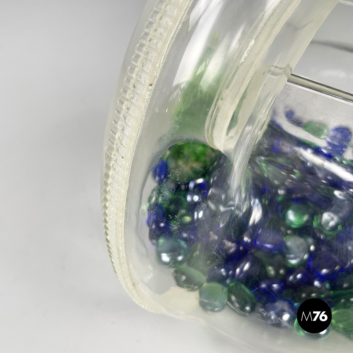 Acquario ornamentale da tavolo modello Aqua-Loop con struttura interamente in plastica. La boccia a base ovale presenta una scritta in rilievo dove si indica il livello dell’acqua e al suo interno sono presenti elementi decorativi come sassi colorati e piante in plastica. Nella parte alta è presente un manico a sezione tonda, infatti la particolarità di questo acquario è la libertà di muoversi del pesce anche nel manico.