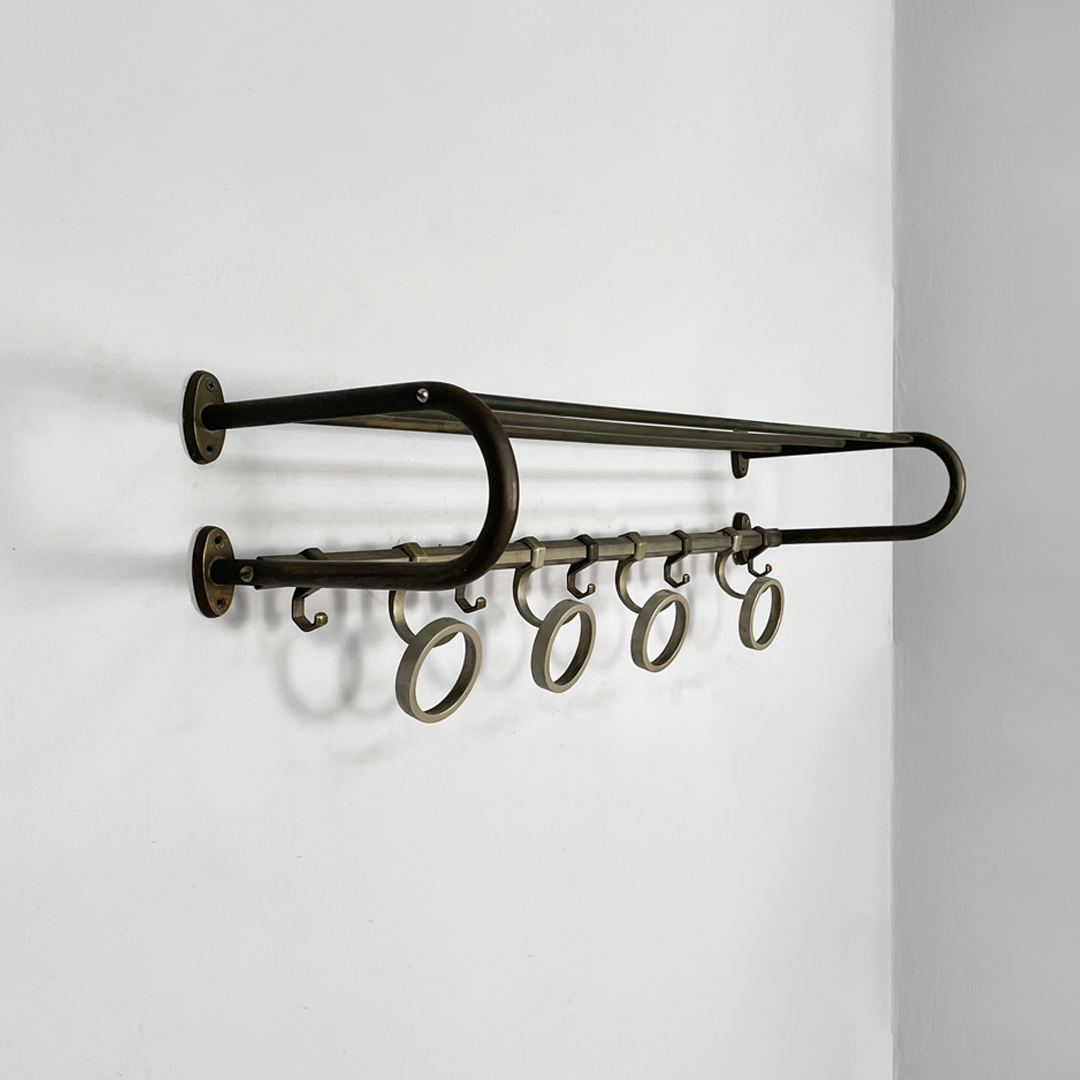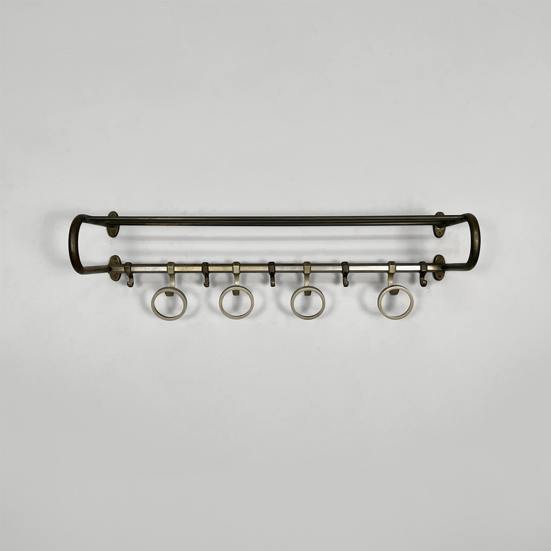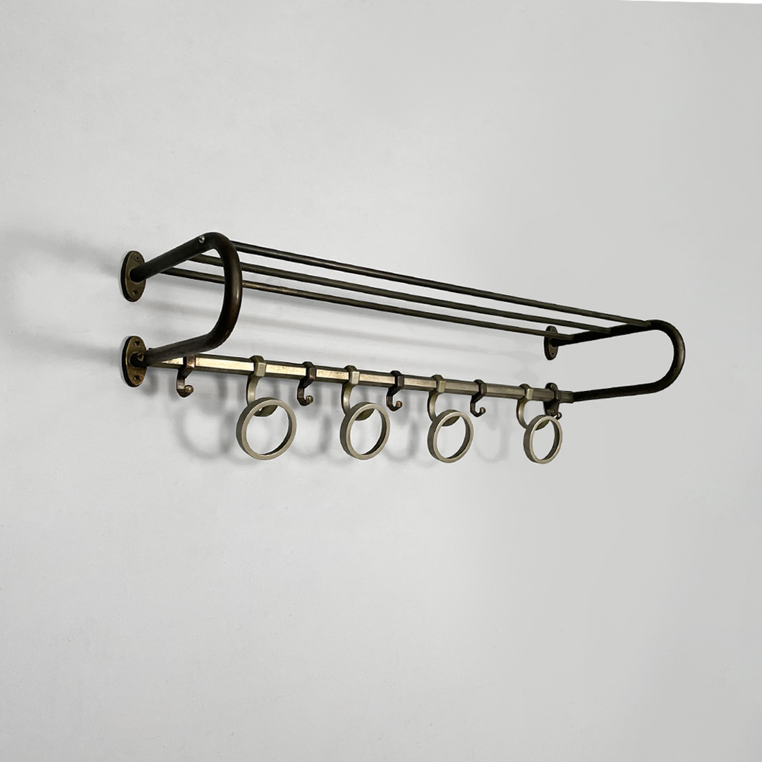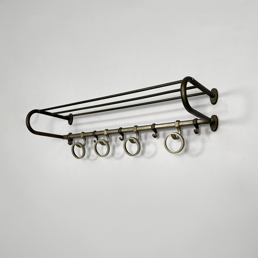 Appendiabiti da parete con mensola. Presenta cinque ganci a uncino e quattro con anello. E’ possibile posizionarli anche sulla prima barra della mensola.