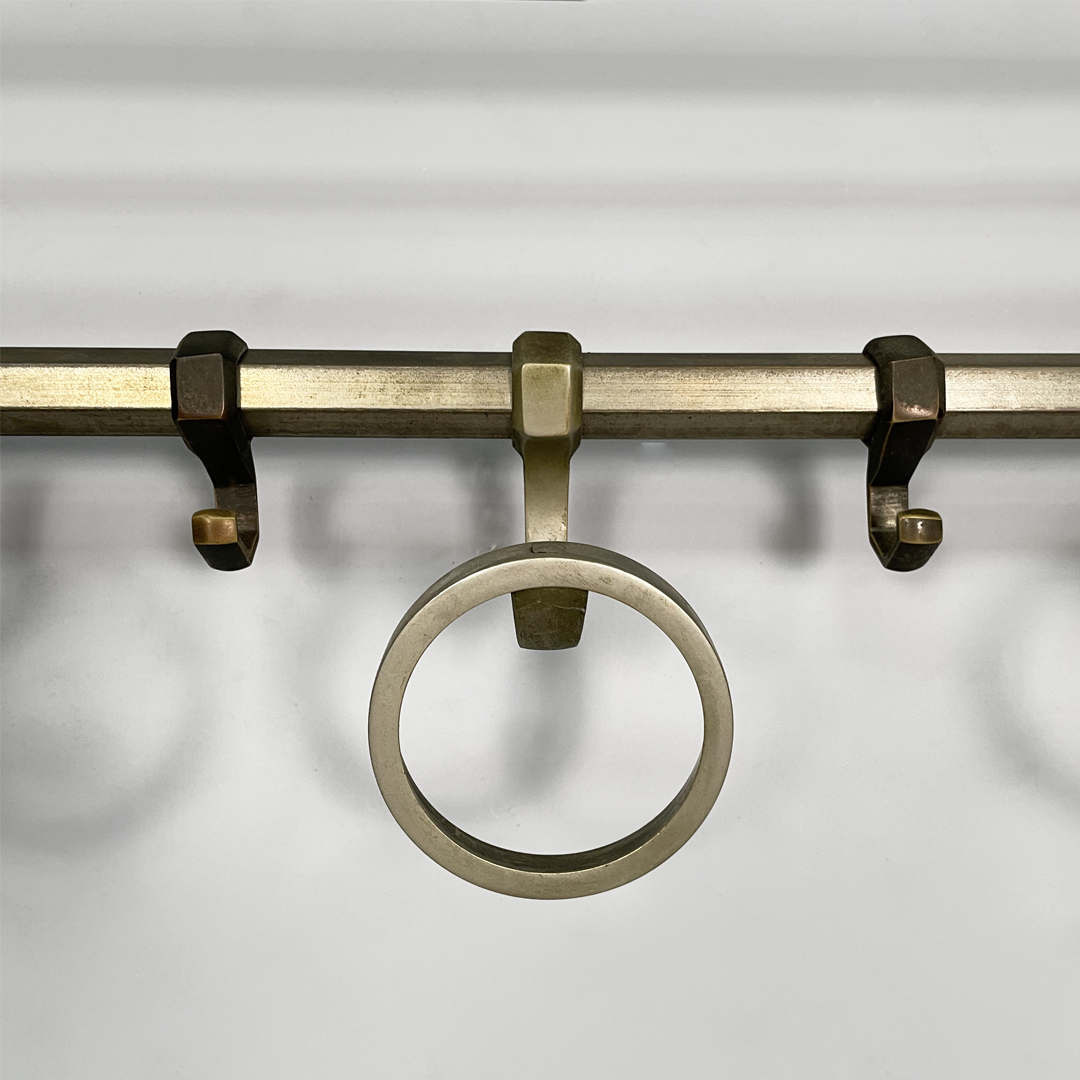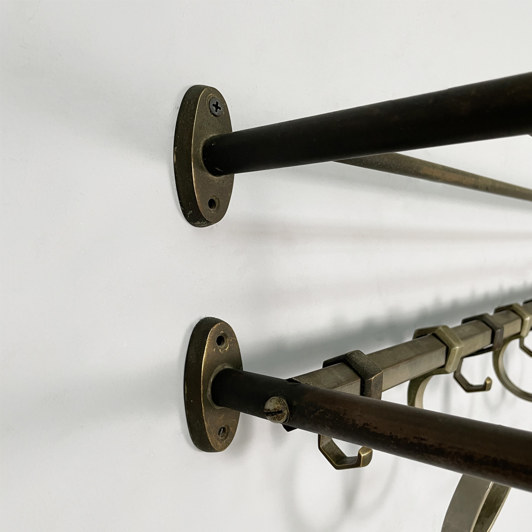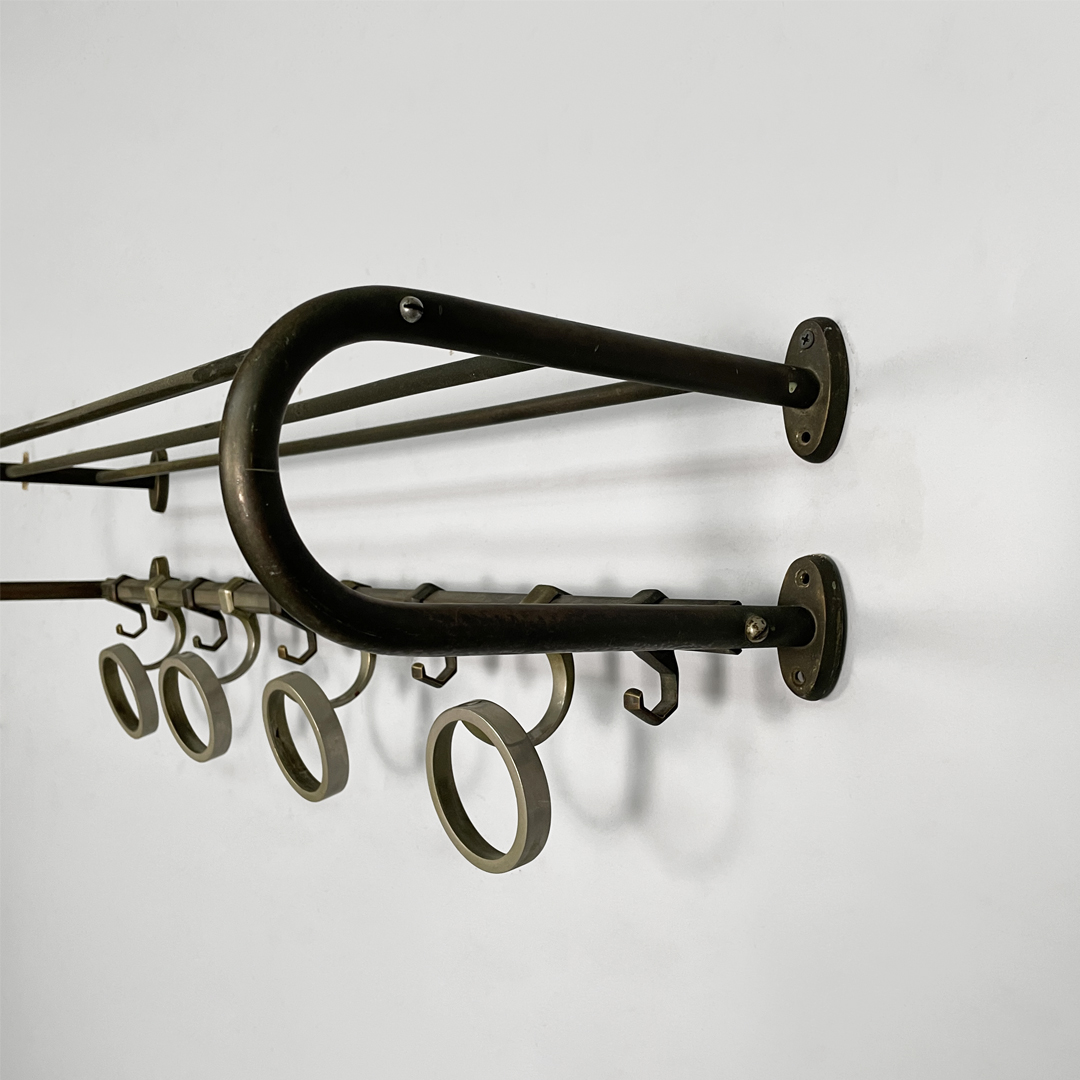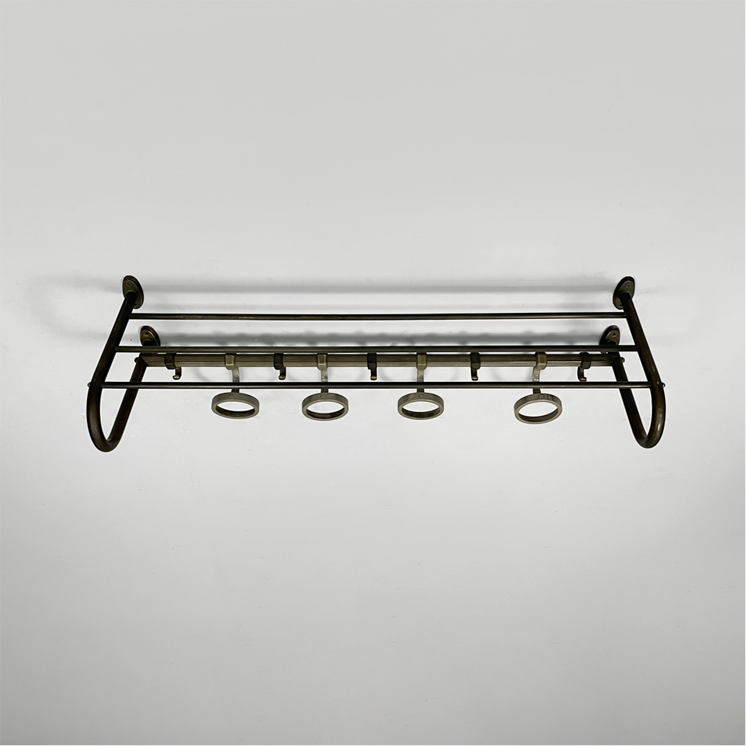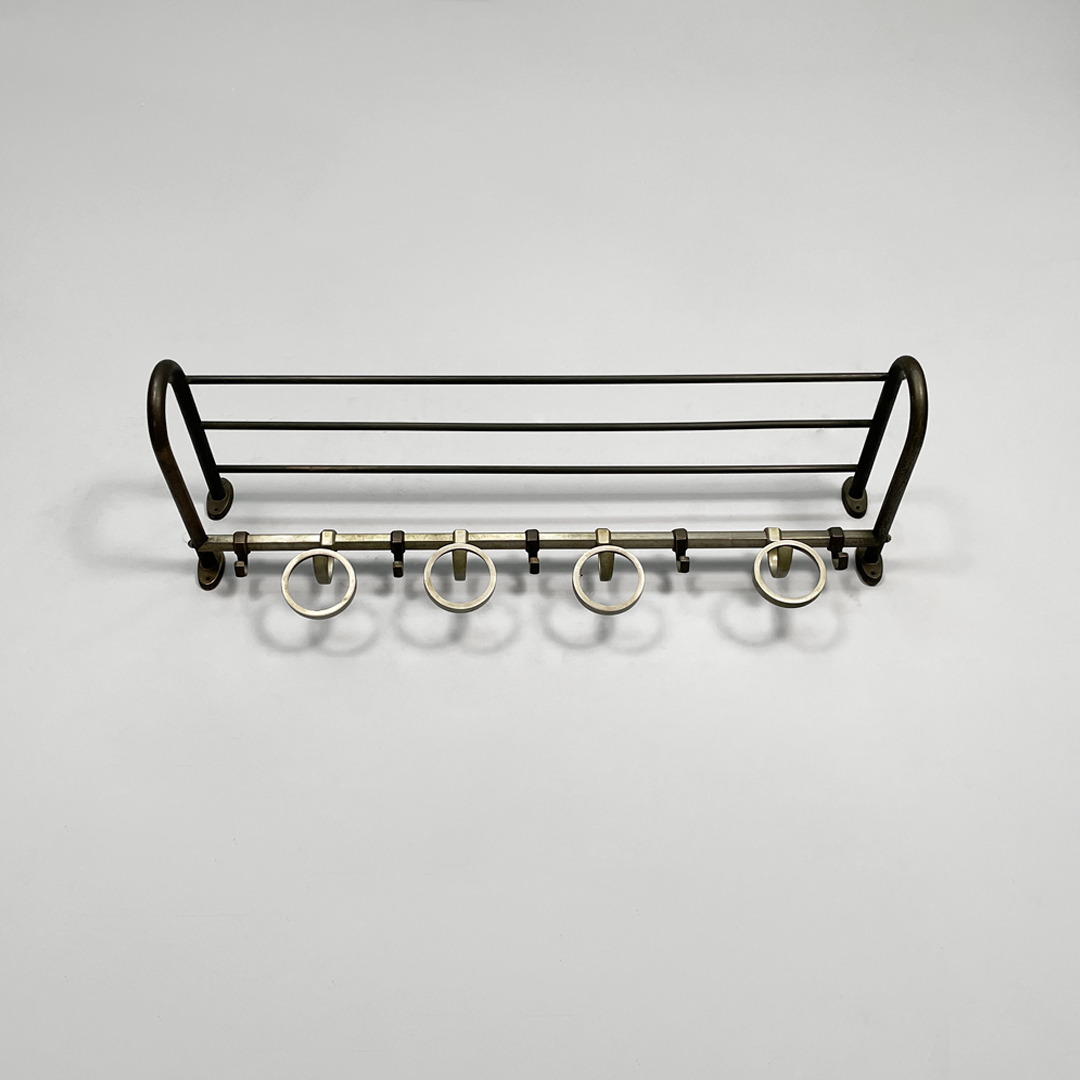 Appendiabiti da parete con mensola. Presenta cinque ganci a uncino e quattro con anello. E’ possibile posizionarli anche sulla prima barra della mensola.