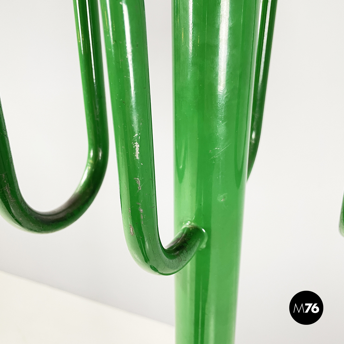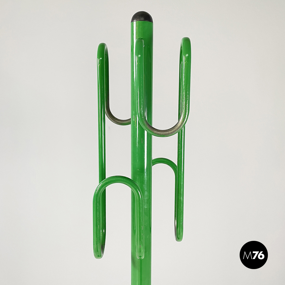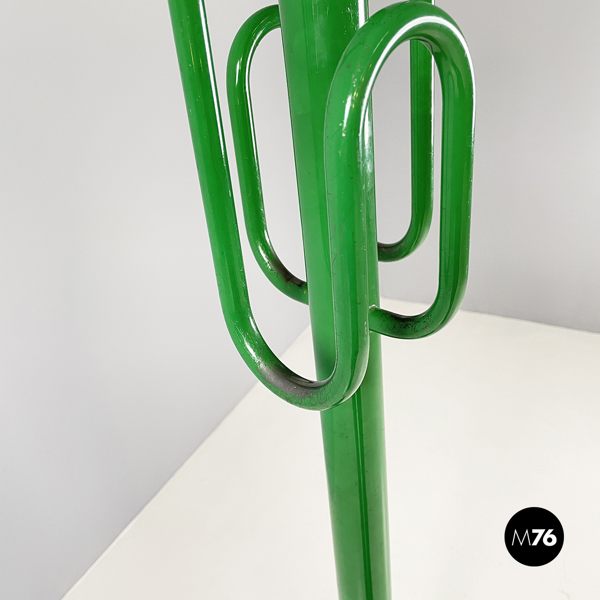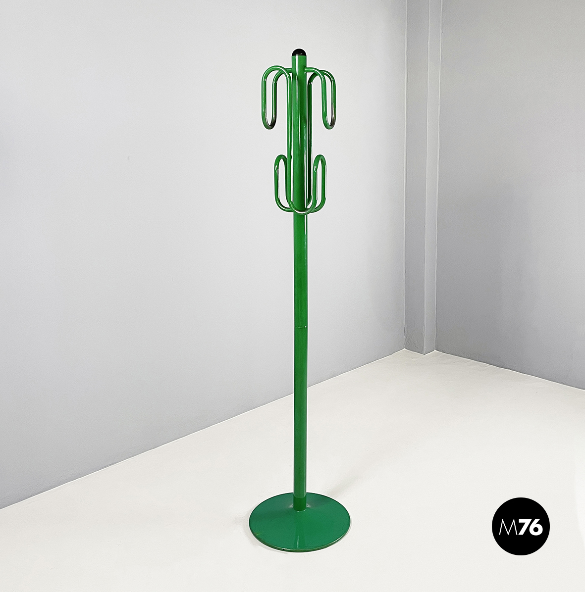 Appendiabiti da terra a base tonda in metallo verniciato verde. Nella parte superiore presenta dei tondini di metallo curvati, che funzionano da ganci. Finitura in plastica nera in alto. Struttura in tubolare di metallo. La forma dell’appendiabiti ricorda quella di un cactus.