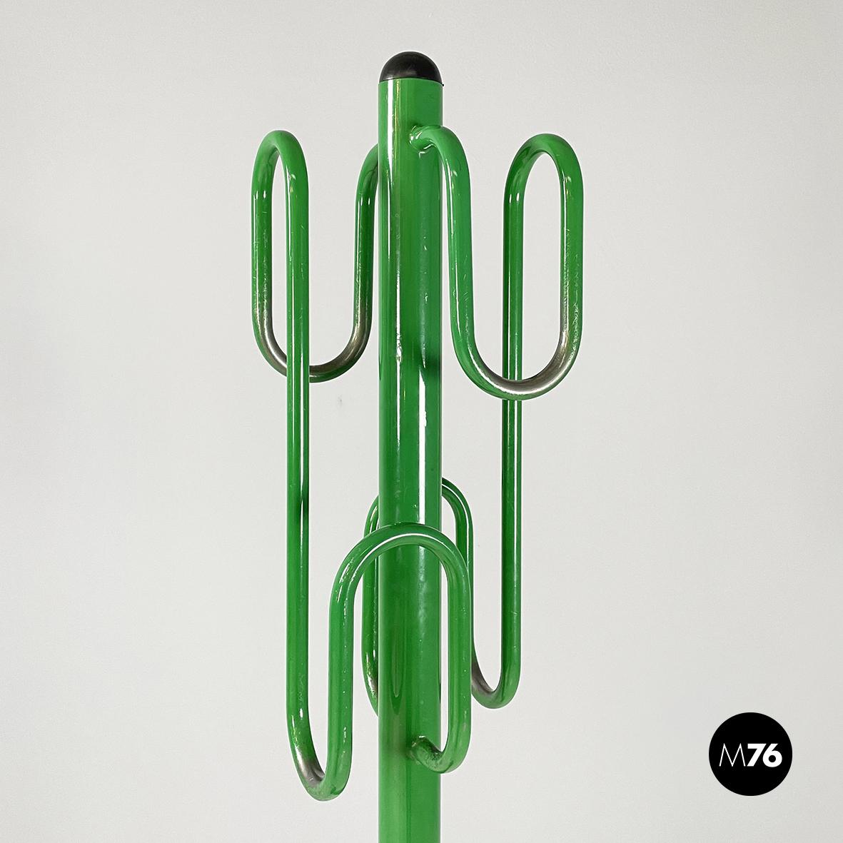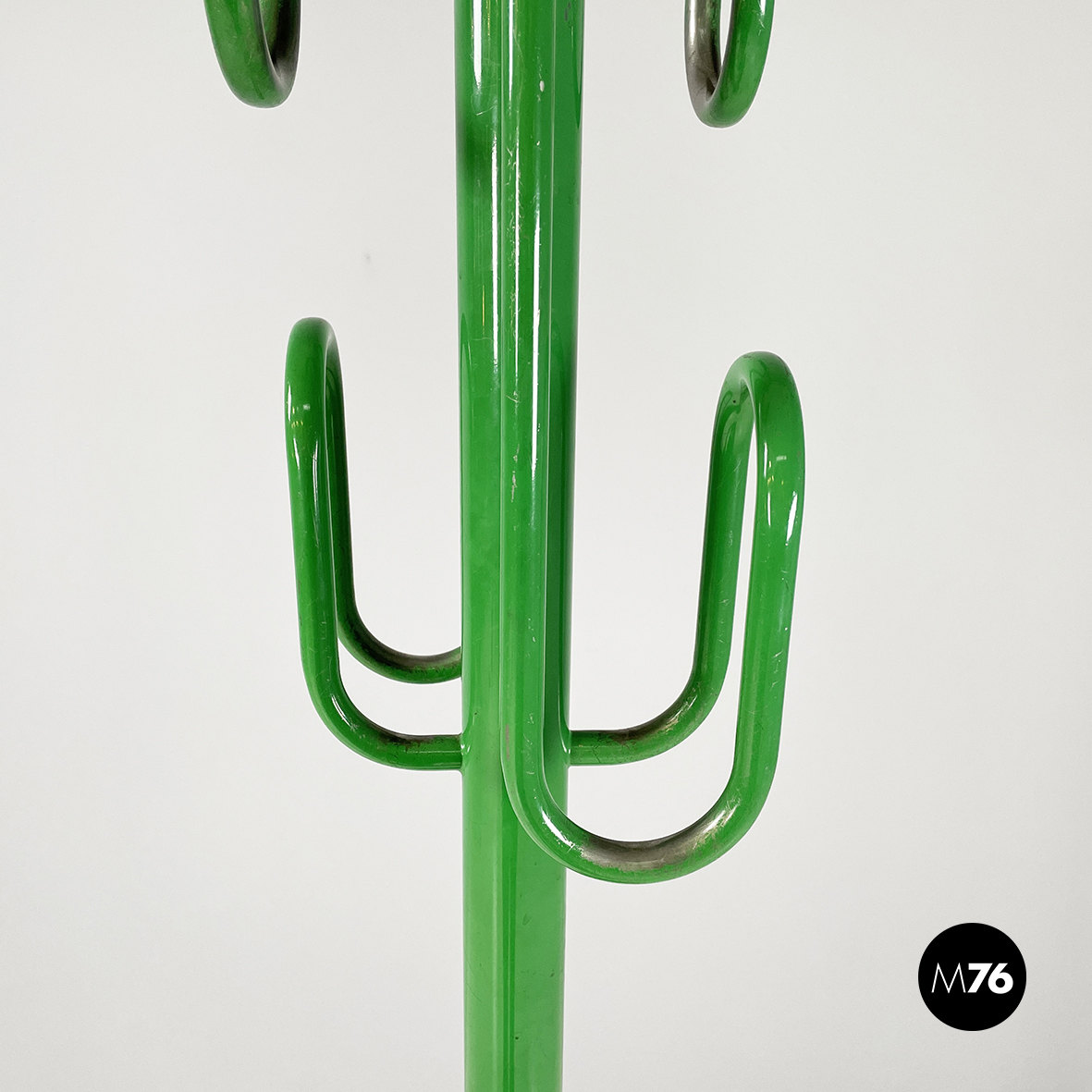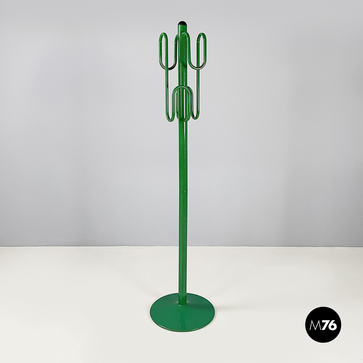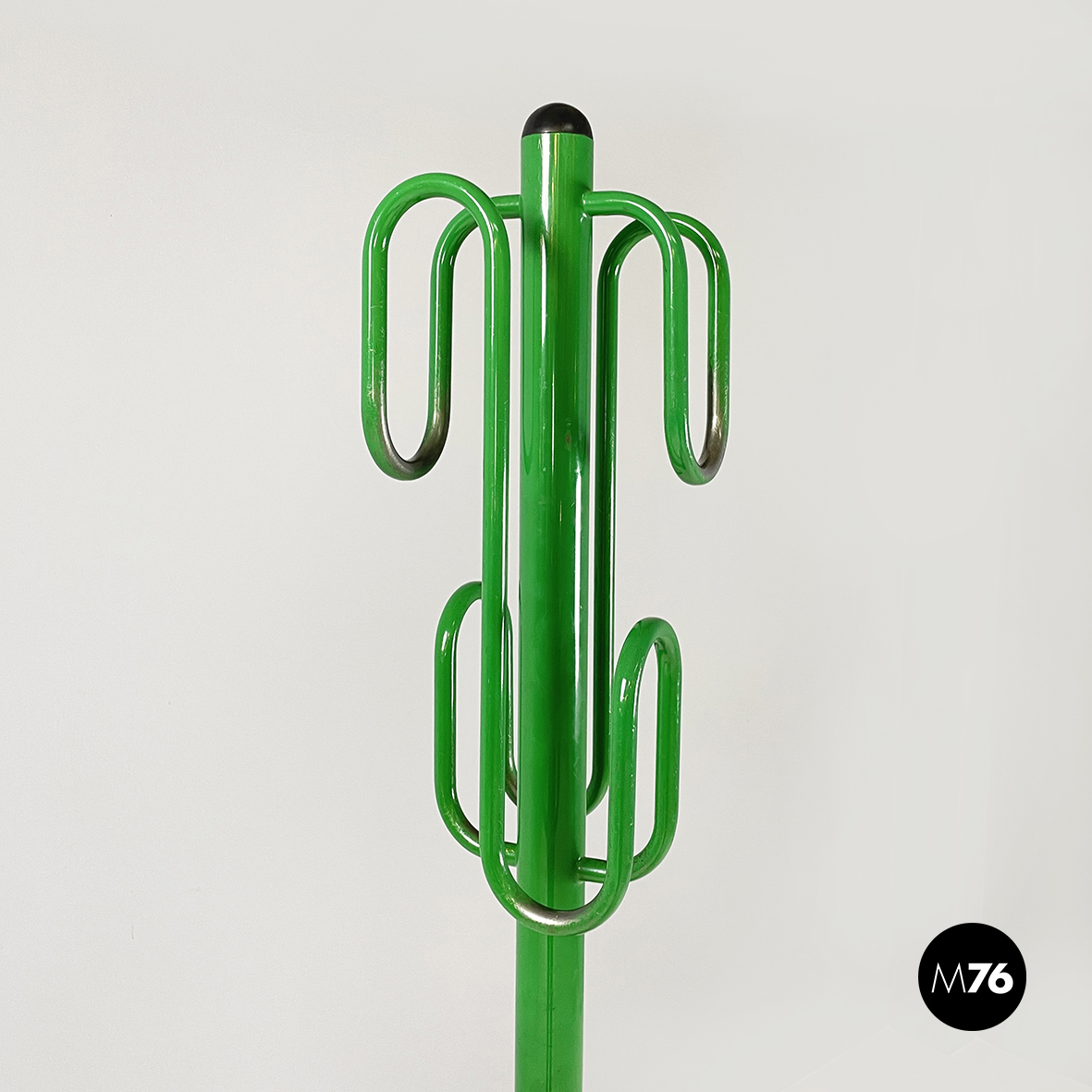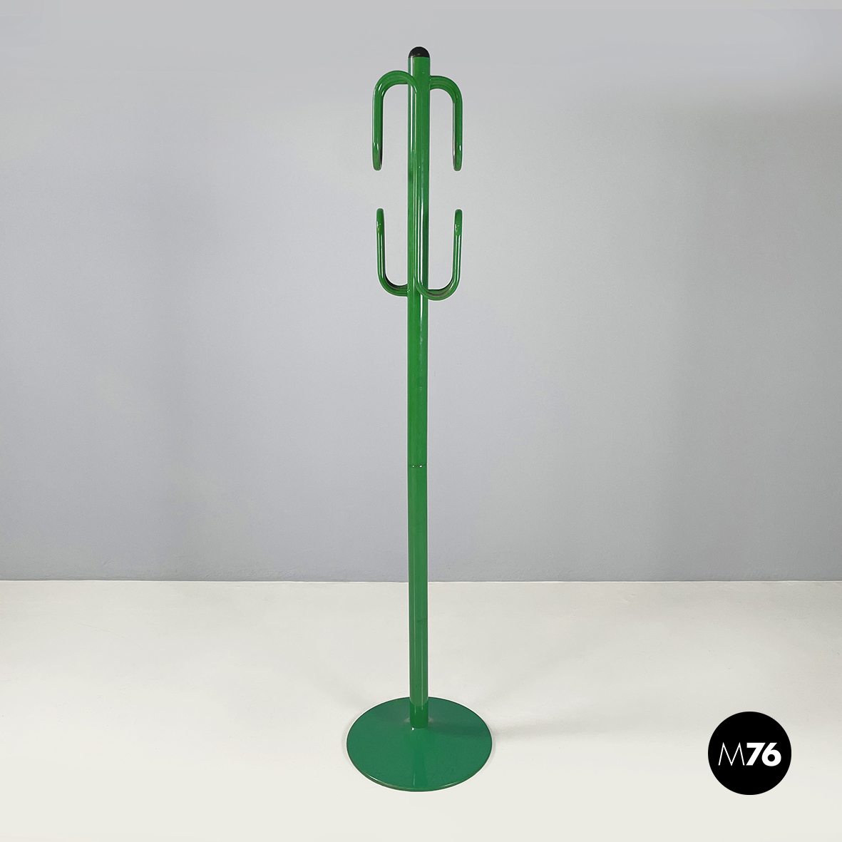 Appendiabiti da terra a base tonda in metallo verniciato verde. Nella parte superiore presenta dei tondini di metallo curvati, che funzionano da ganci. Finitura in plastica nera in alto. Struttura in tubolare di metallo. La forma dell’appendiabiti ricorda quella di un cactus.