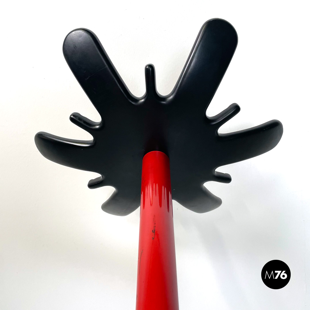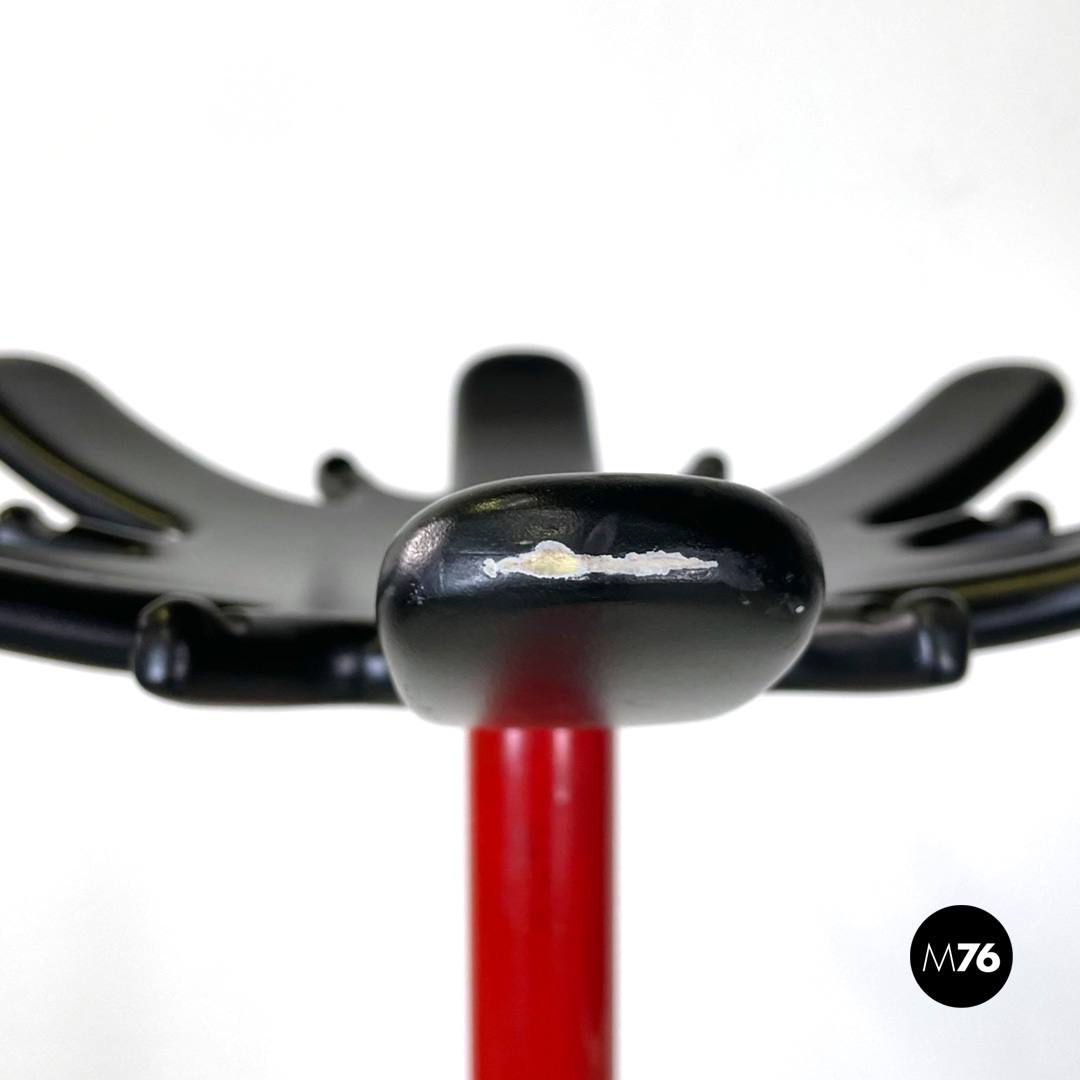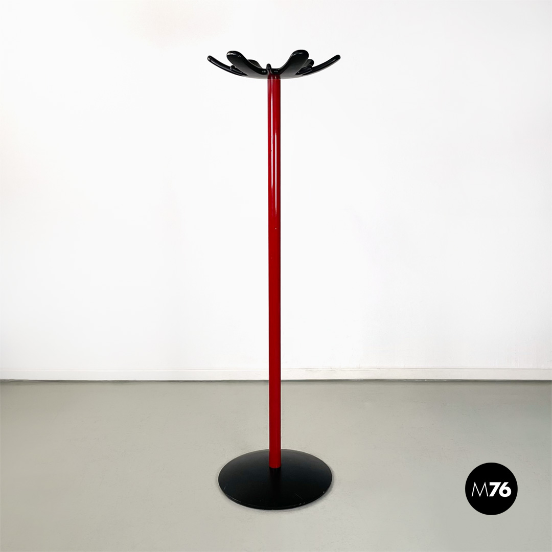 Appendiabiti da terra modello Pagoda a base tonda. Struttura in metallo verniciato rosso, base di forma circolare in metallo verniciato nero. La parte superiore, in plastica nera, ha sei braccia più grandi e sei più piccole con una piccola scavatura.