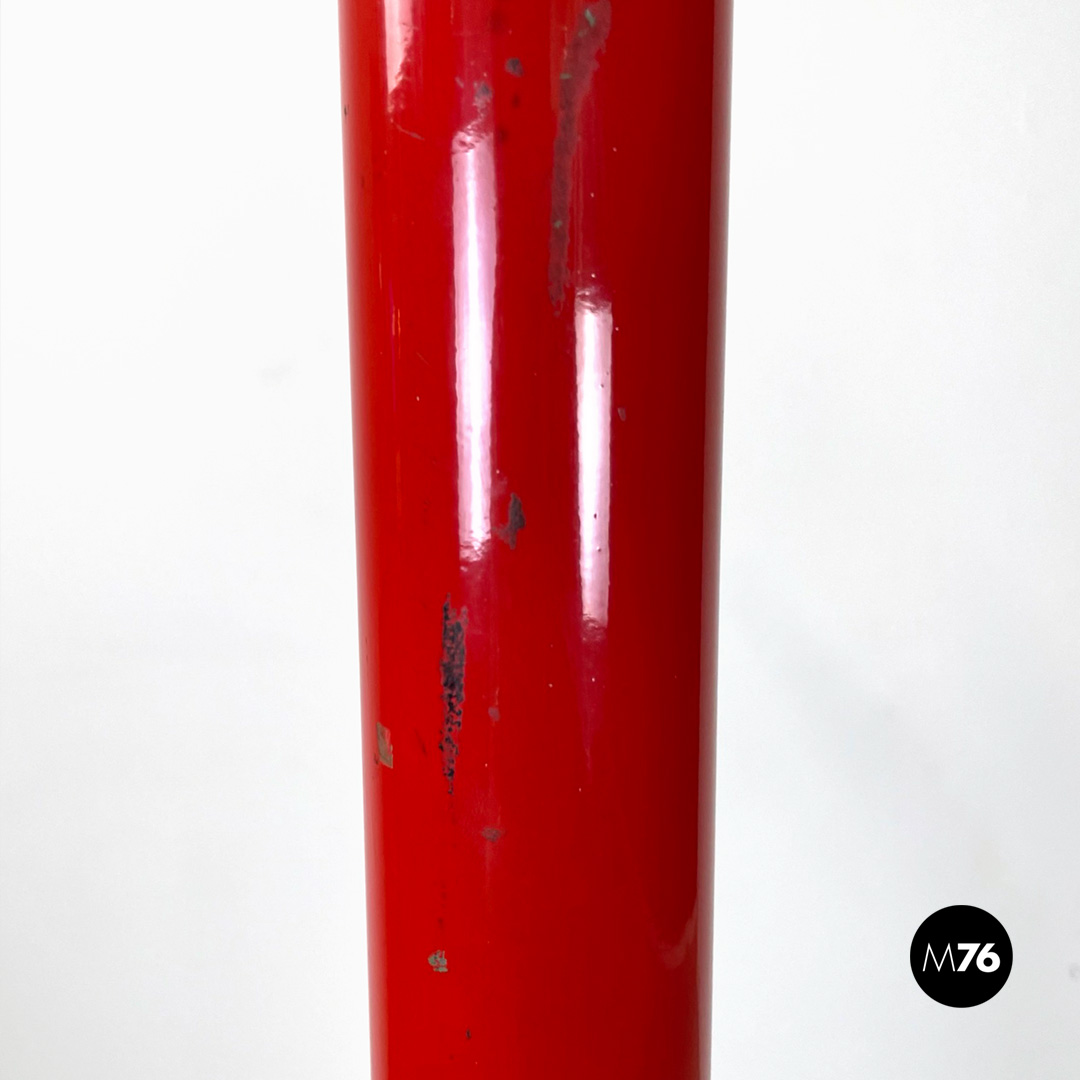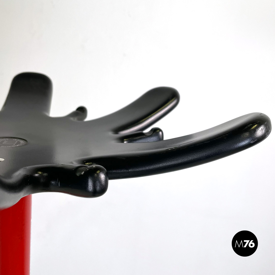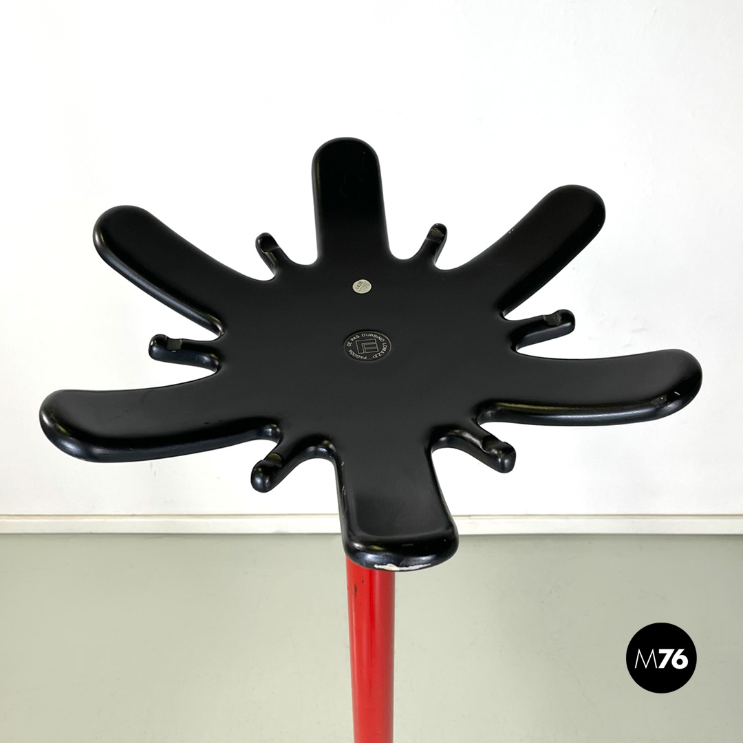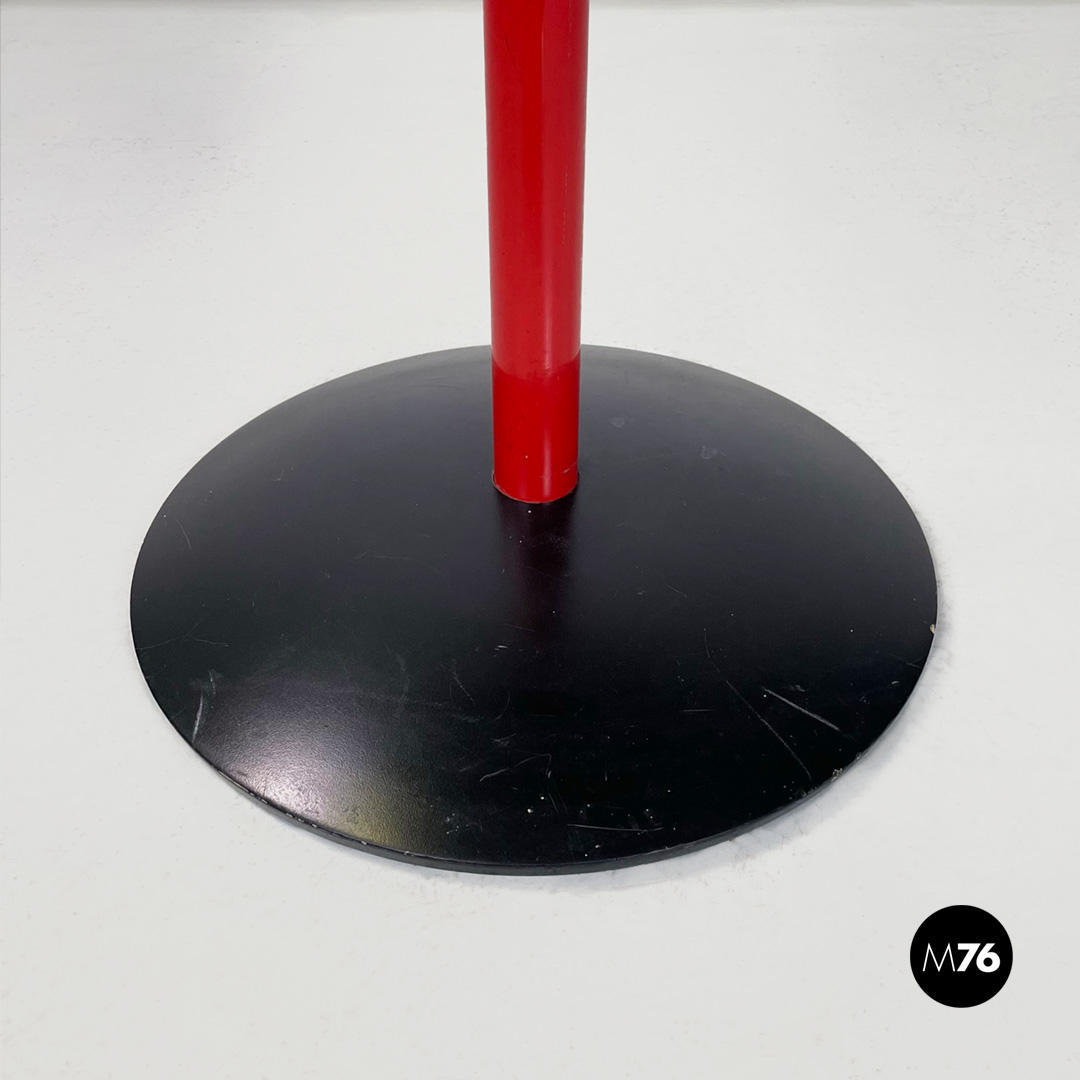 Appendiabiti da terra modello Pagoda a base tonda. Struttura in metallo verniciato rosso, base di forma circolare in metallo verniciato nero. La parte superiore, in plastica nera, ha sei braccia più grandi e sei più piccole con una piccola scavatura.