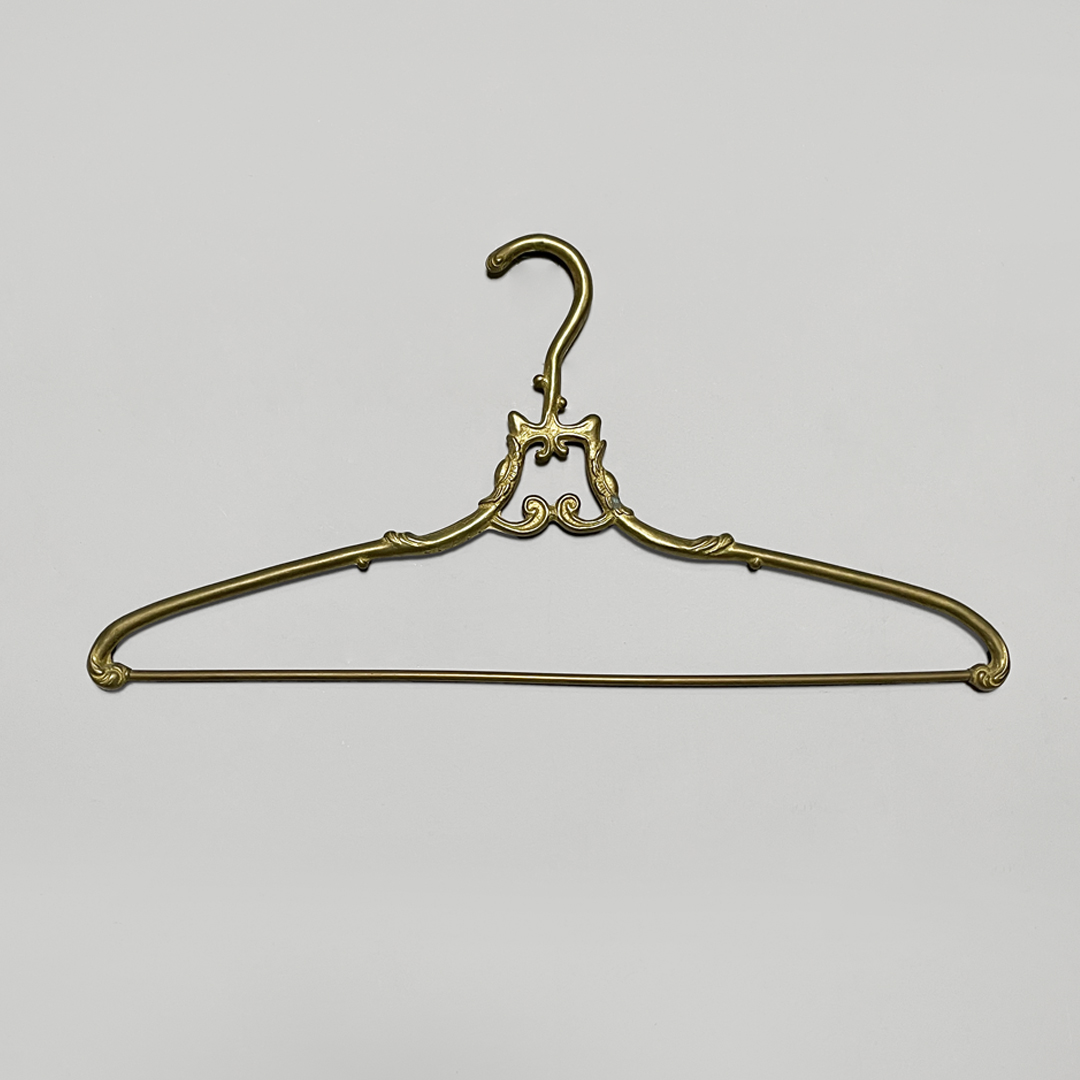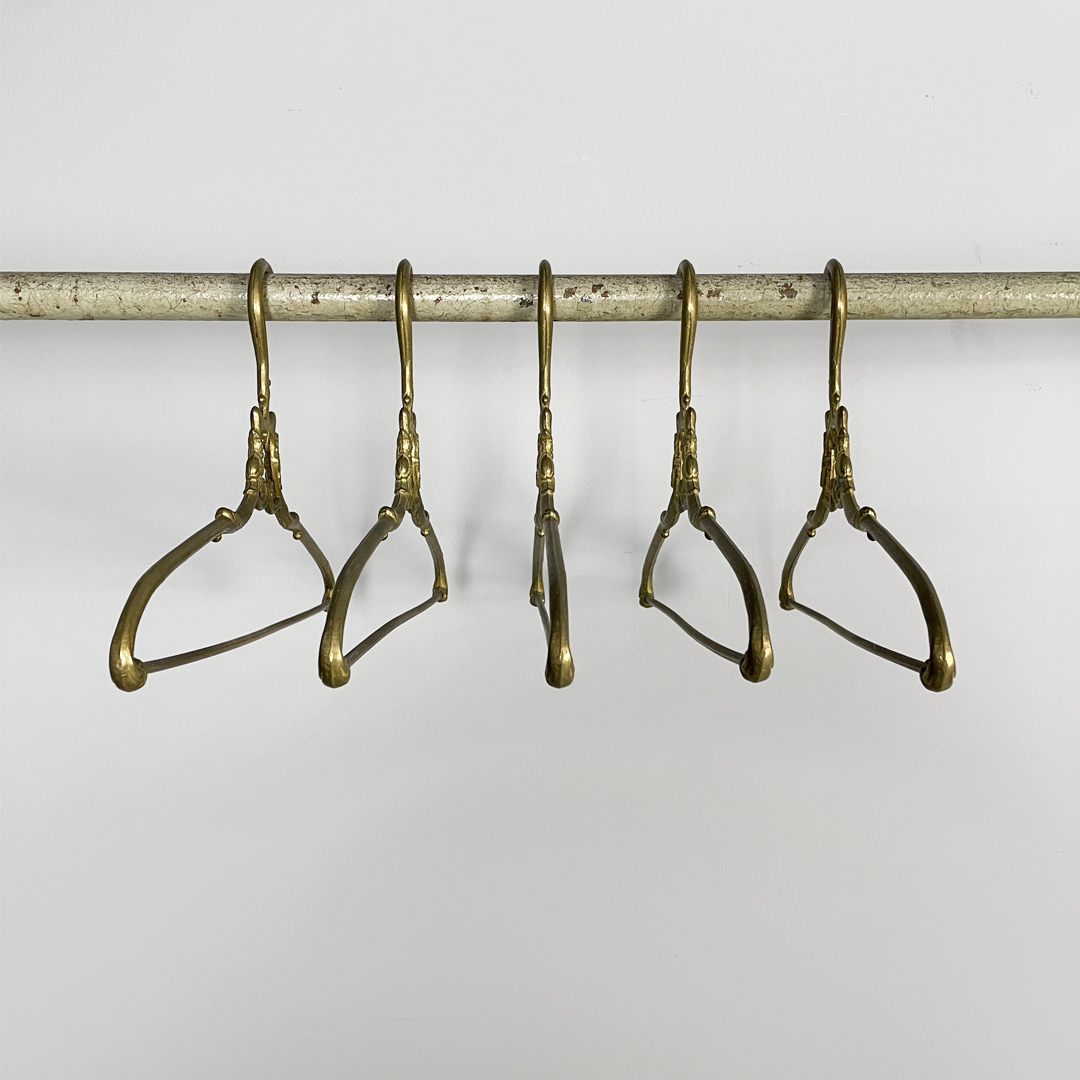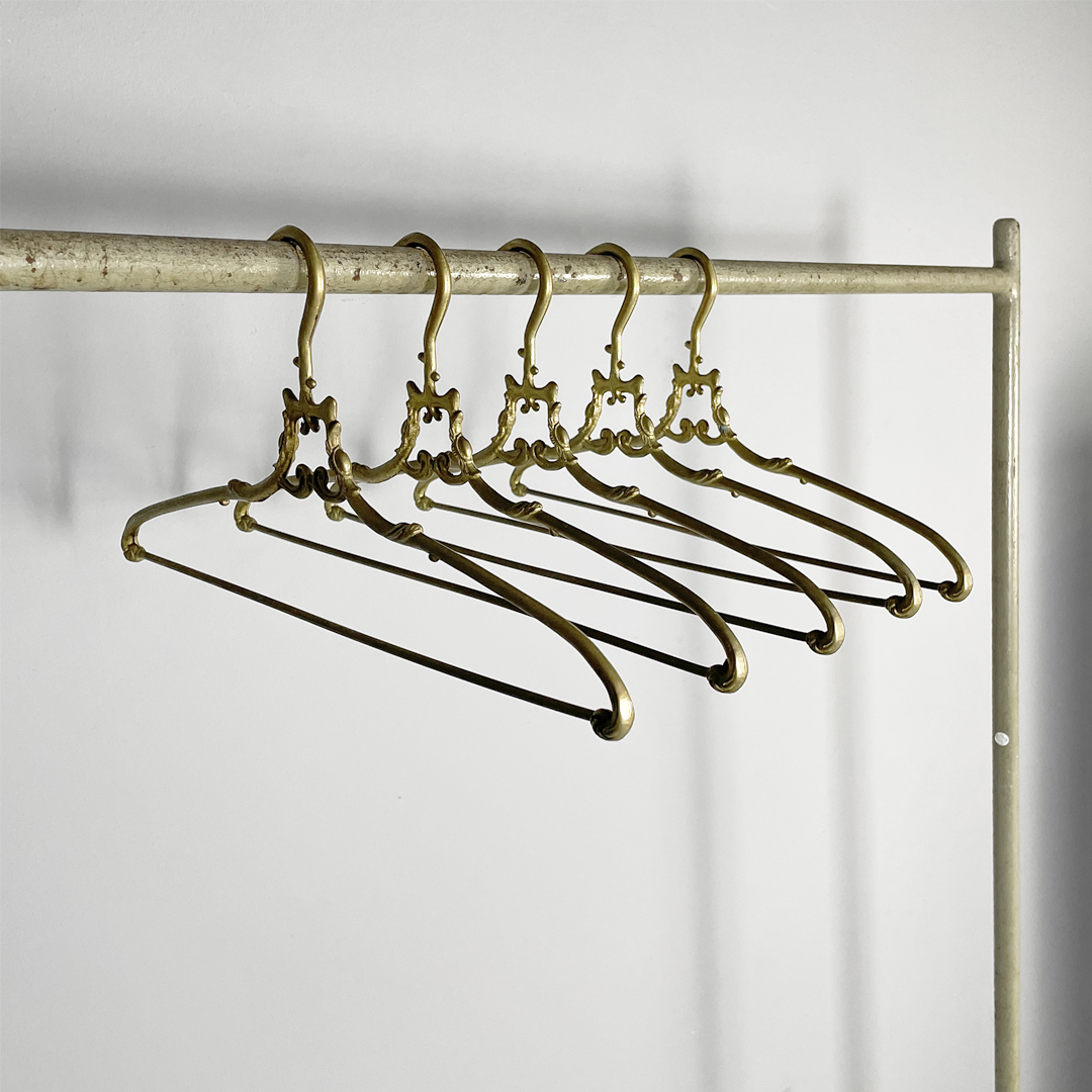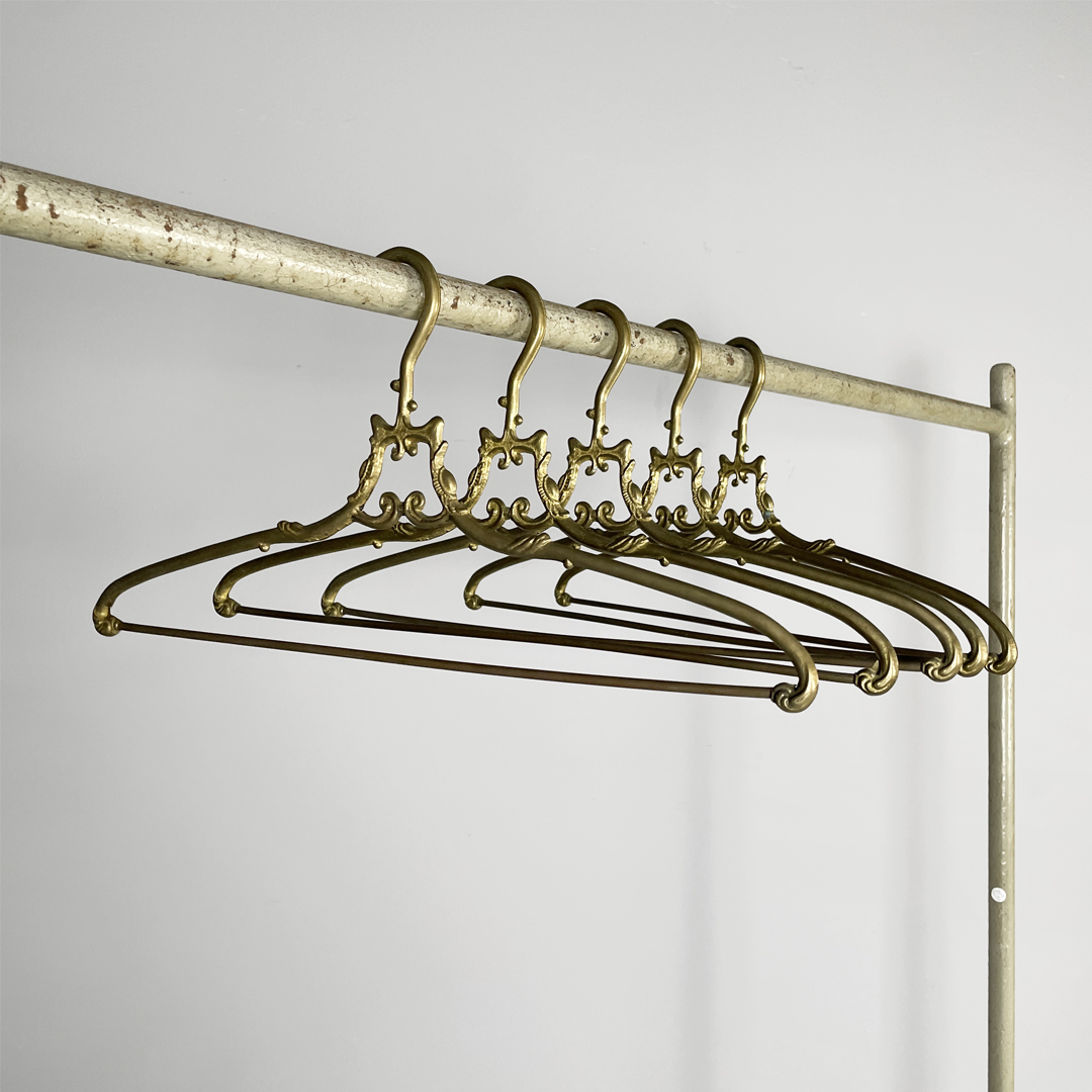 Set di cinque grucce in ottone. Il gancio superiore ha una curva morbida decorata mentre la parte centrale presenta un piccolo elemento ornamentale simmetrico. Le estremità sono leggermente sagomate e arricchite da dettagli a riccioli.