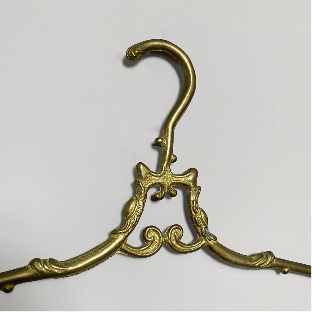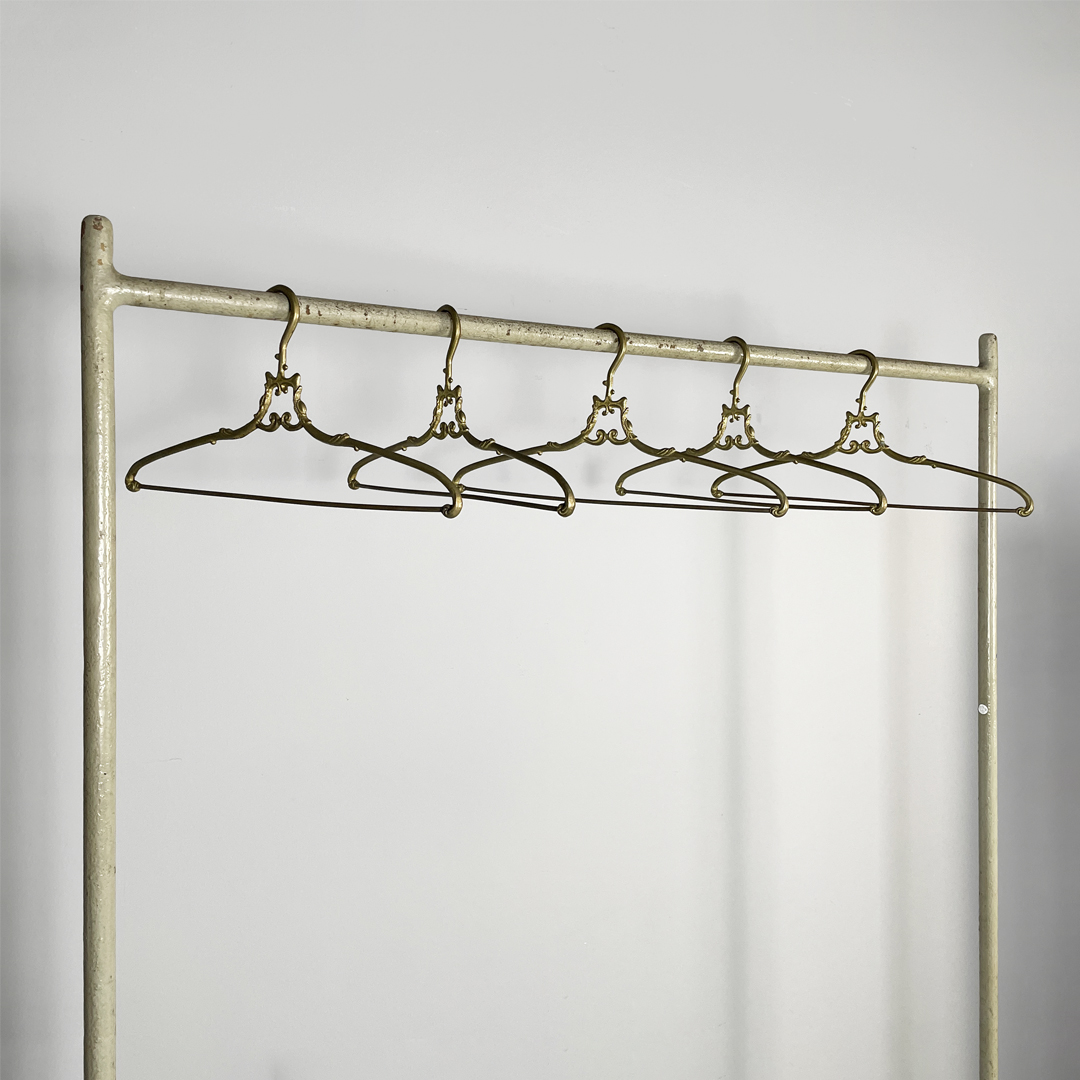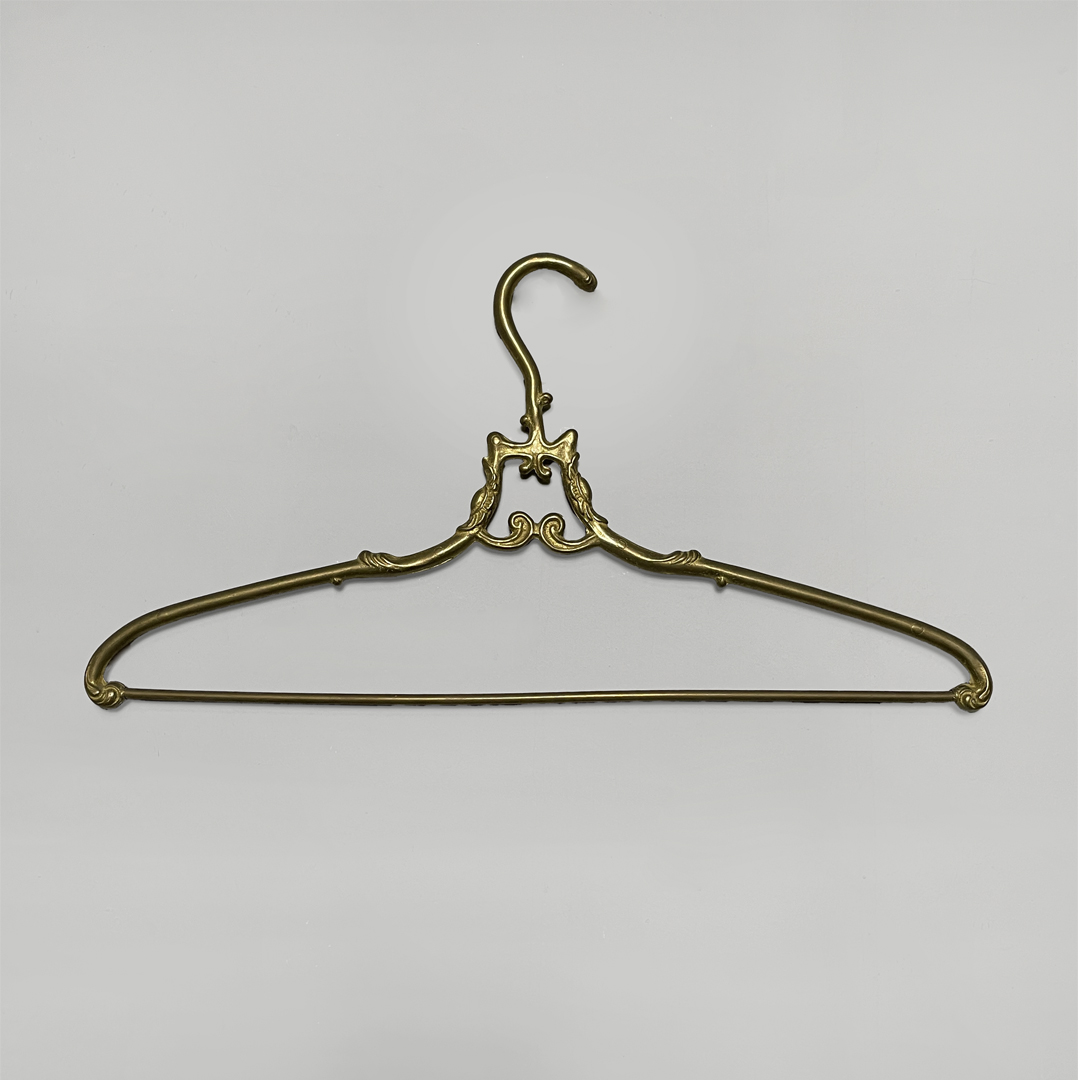 Set di cinque grucce in ottone. Il gancio superiore ha una curva morbida decorata mentre la parte centrale presenta un piccolo elemento ornamentale simmetrico. Le estremità sono leggermente sagomate e arricchite da dettagli a riccioli.