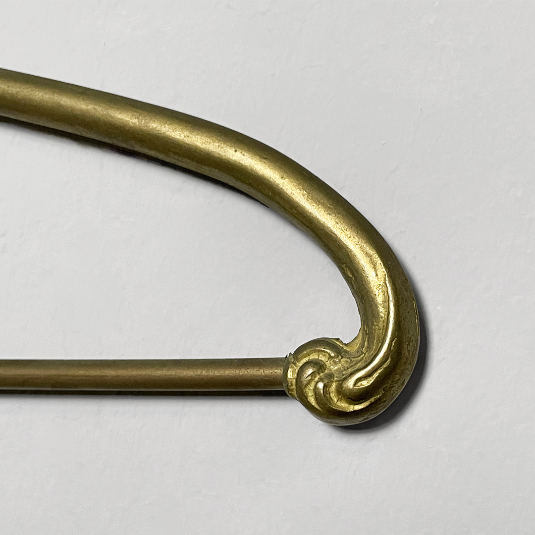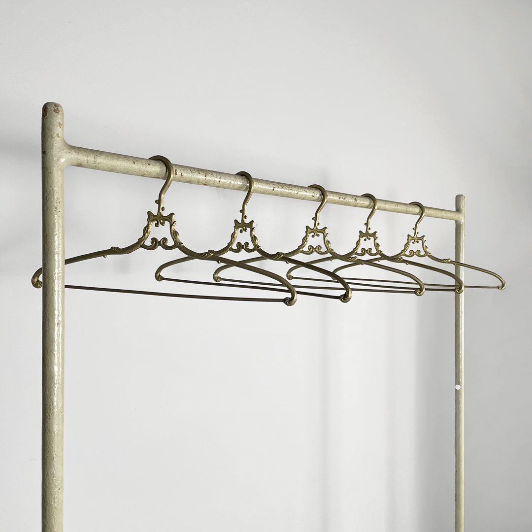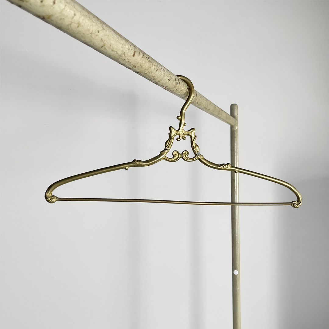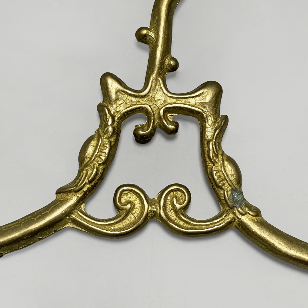 Set di cinque grucce in ottone. Il gancio superiore ha una curva morbida decorata mentre la parte centrale presenta un piccolo elemento ornamentale simmetrico. Le estremità sono leggermente sagomate e arricchite da dettagli a riccioli.