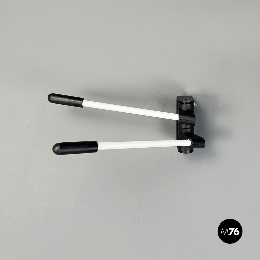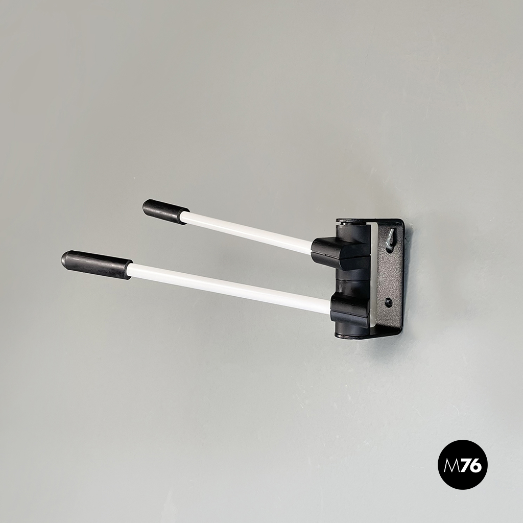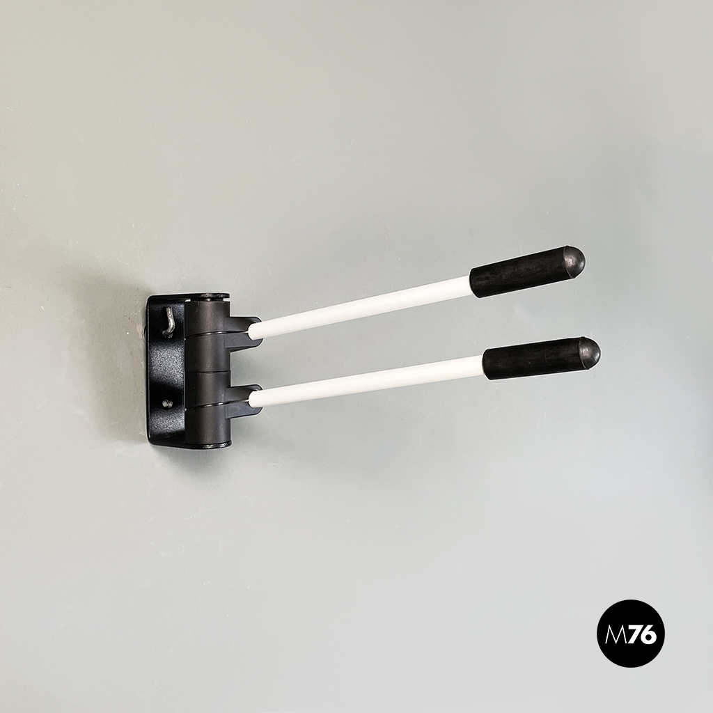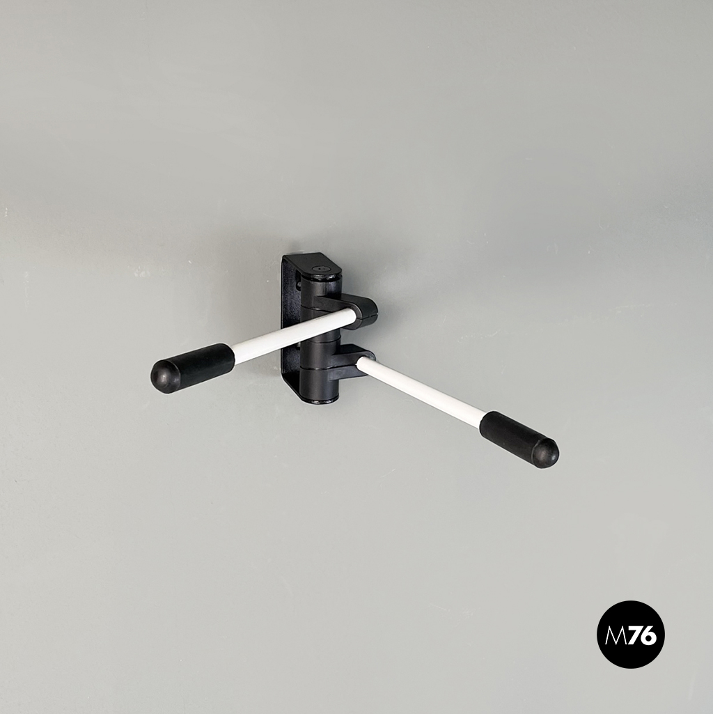 Appendiabiti da parete modello Signa composto da due bracci mobili in tubolare di metallo verniciato bianco con puntali in gomma nera. La base fissata al muro è rettangolare in metallo verniciato nero. Utilizzabile anche come portasciugamani.
