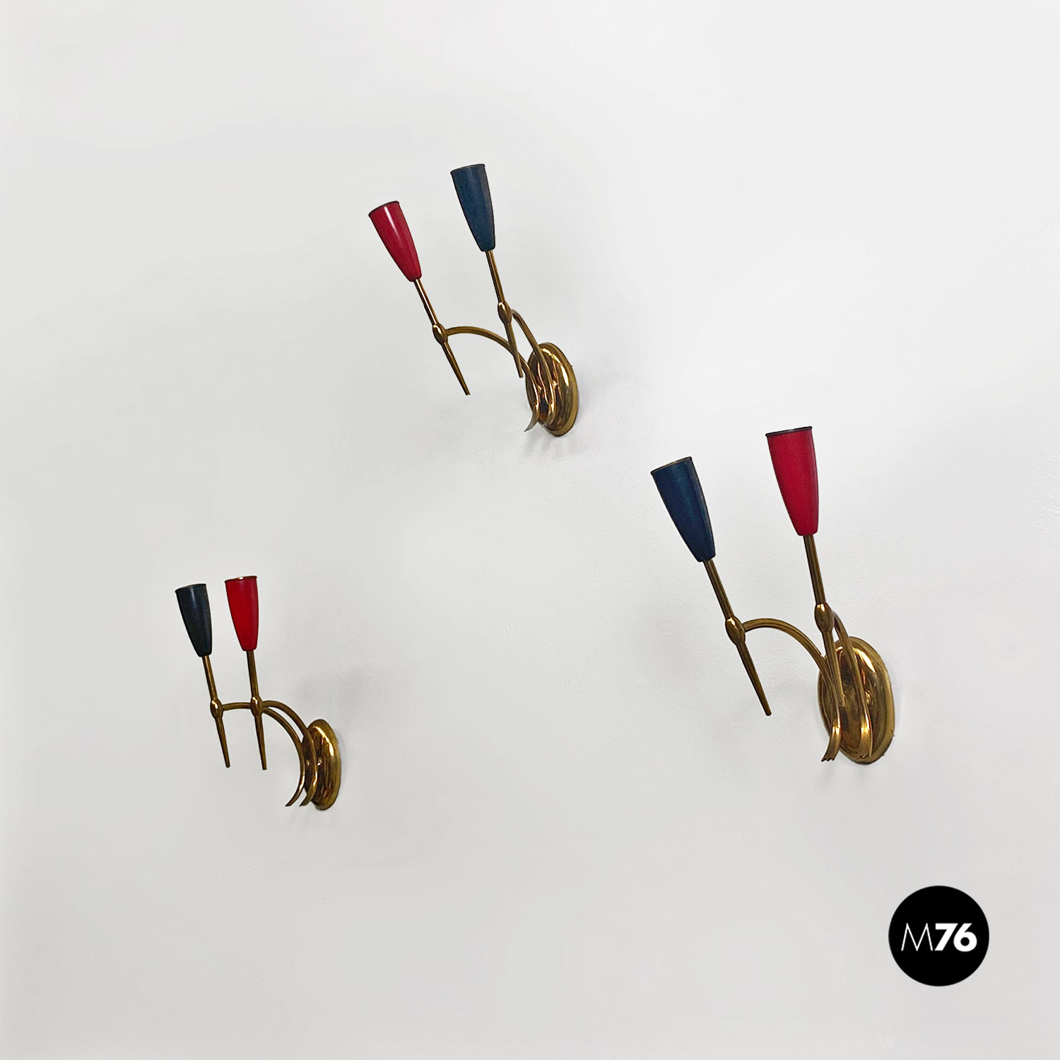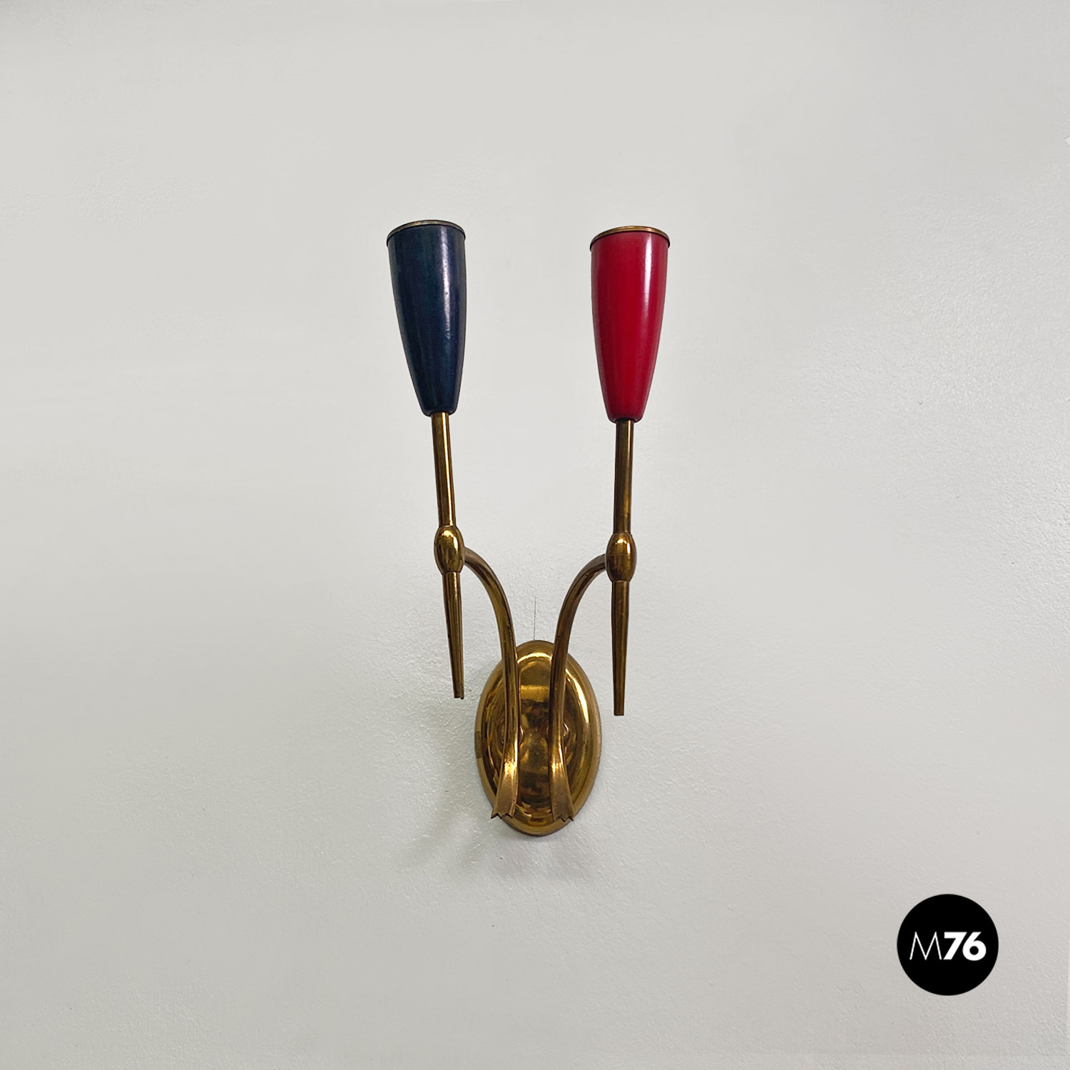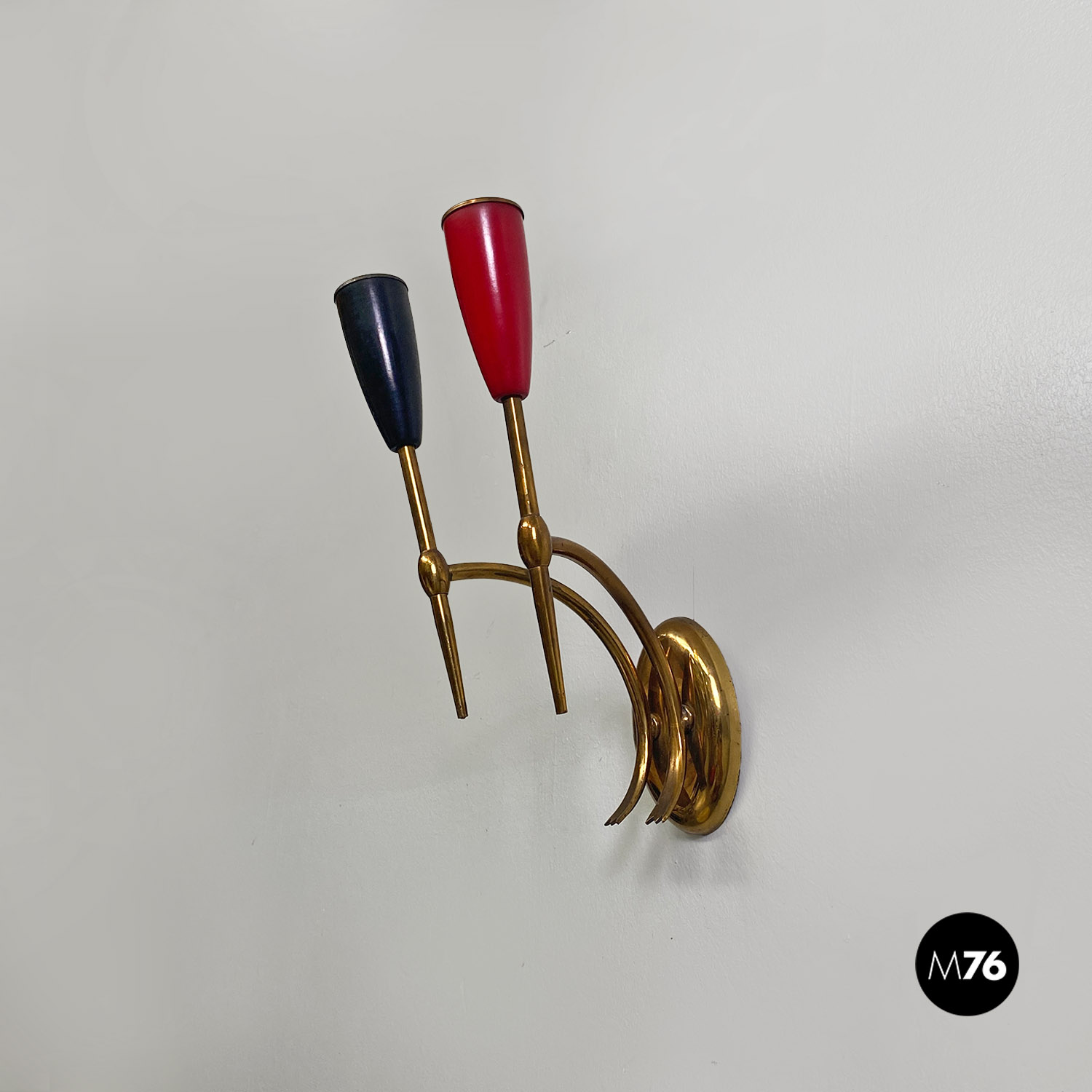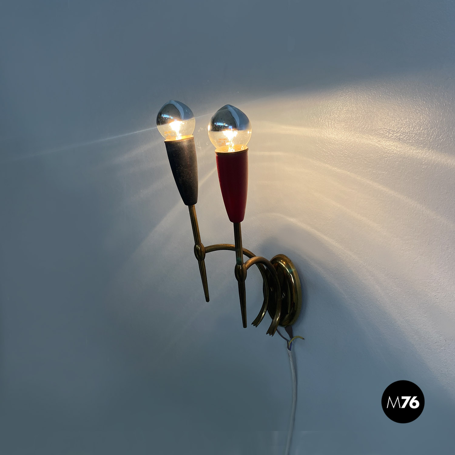 Lampade da parete a due bracci con struttura in ottone e rispettivi portalampada a cono in colore rosso e nero.