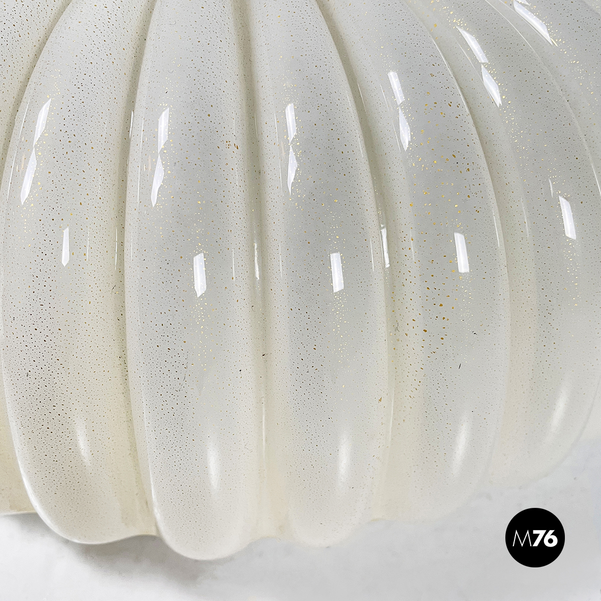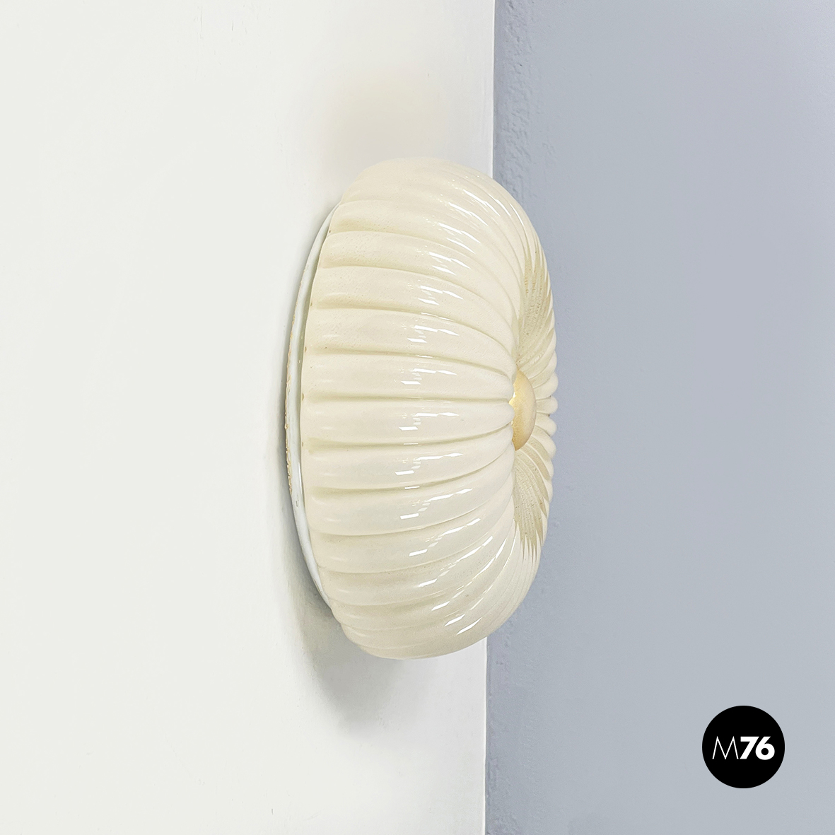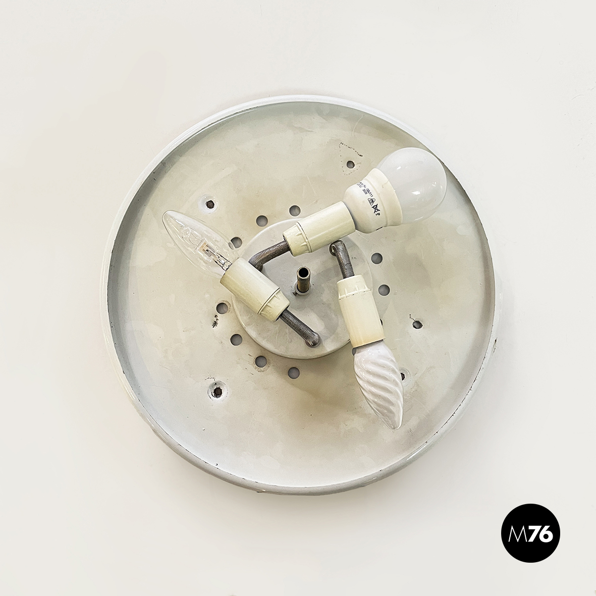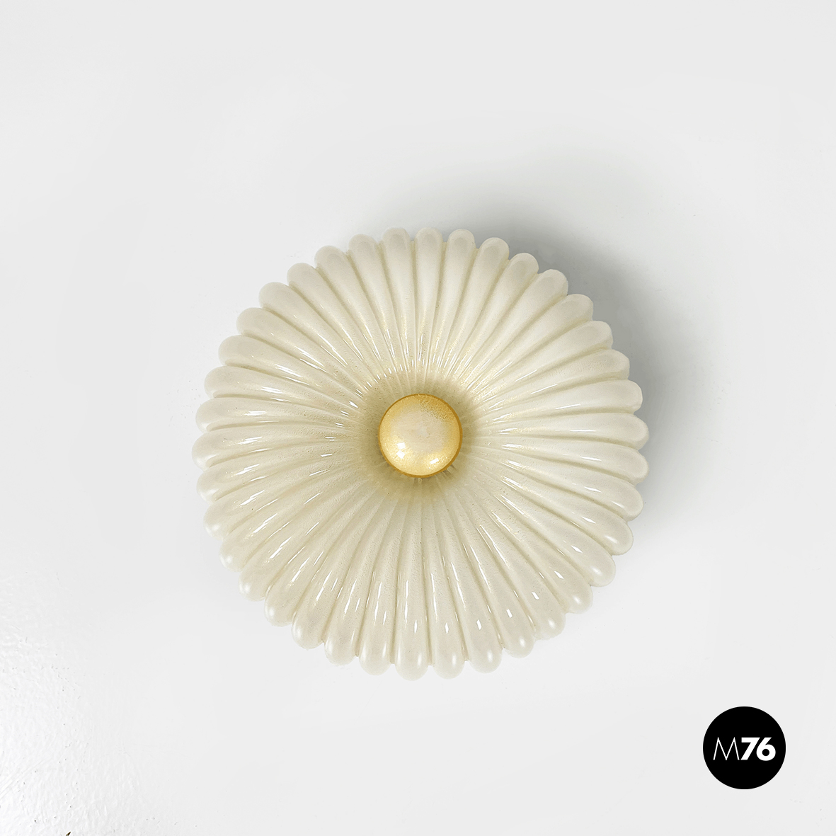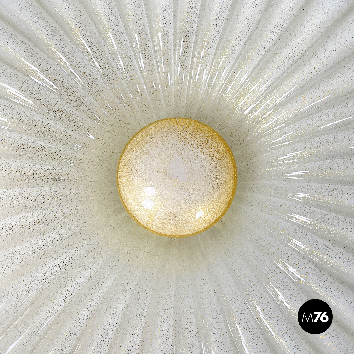 Applique o plafoniera a base tonda in vetro opalino decorato con polvere d’oro. Il diffusore presenta delle scanalature decorative concentriche con al centro un cerchio, anche esso in vetro opalino con polvere d’oro. L’attaccatura al parete è in metallo verniciato bianco. All’interno sono presenti 3 attacchi per lampadina. Può essere usata sia come lampada da parete che da soffitto.