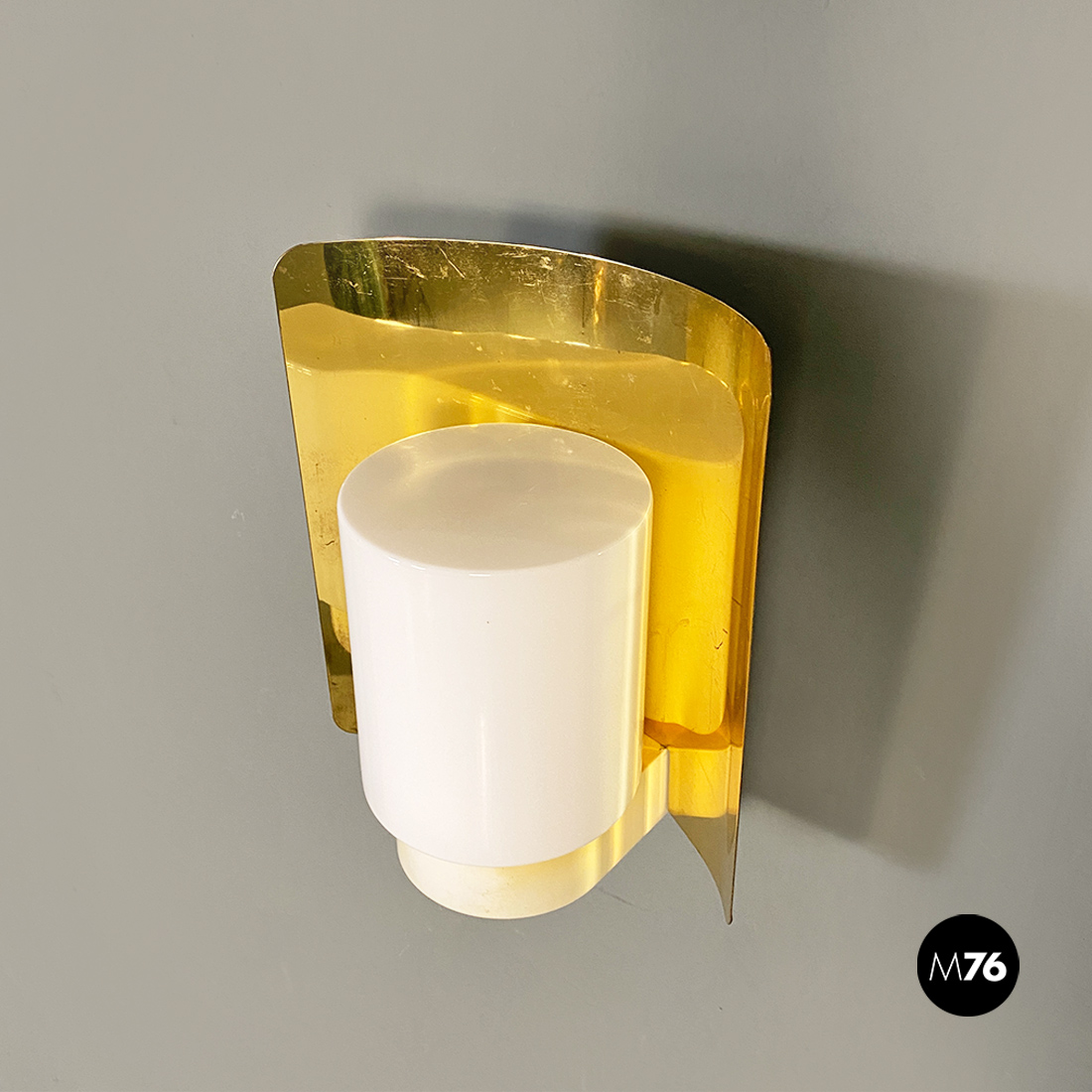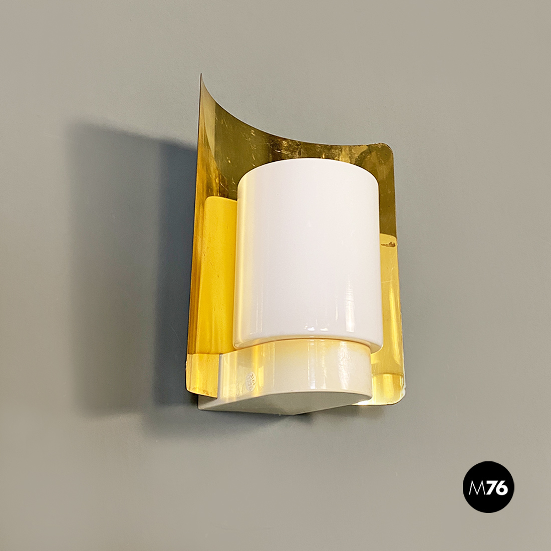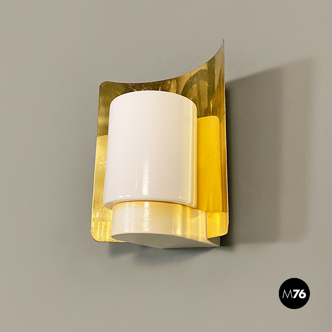 Applique in ottone e vetro con struttura in metallo curvato con finitura dorata che racchiude la diffusione proveniente dal vetro opaline cilindrico, posto sul portalampada in ceramica al centro della struttura metallica.