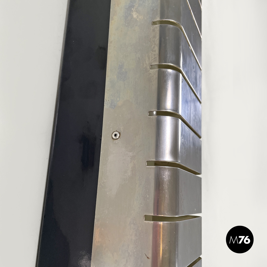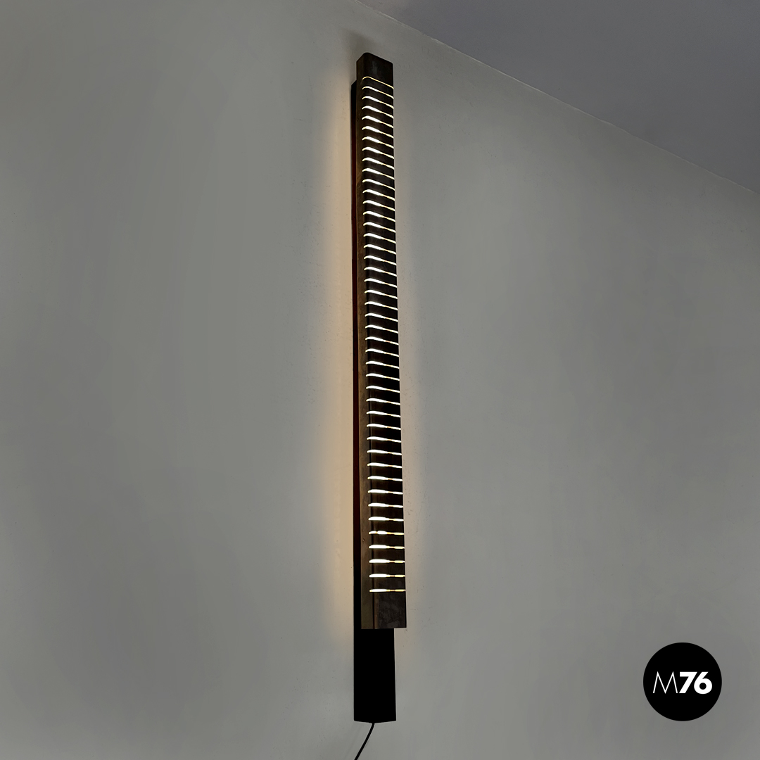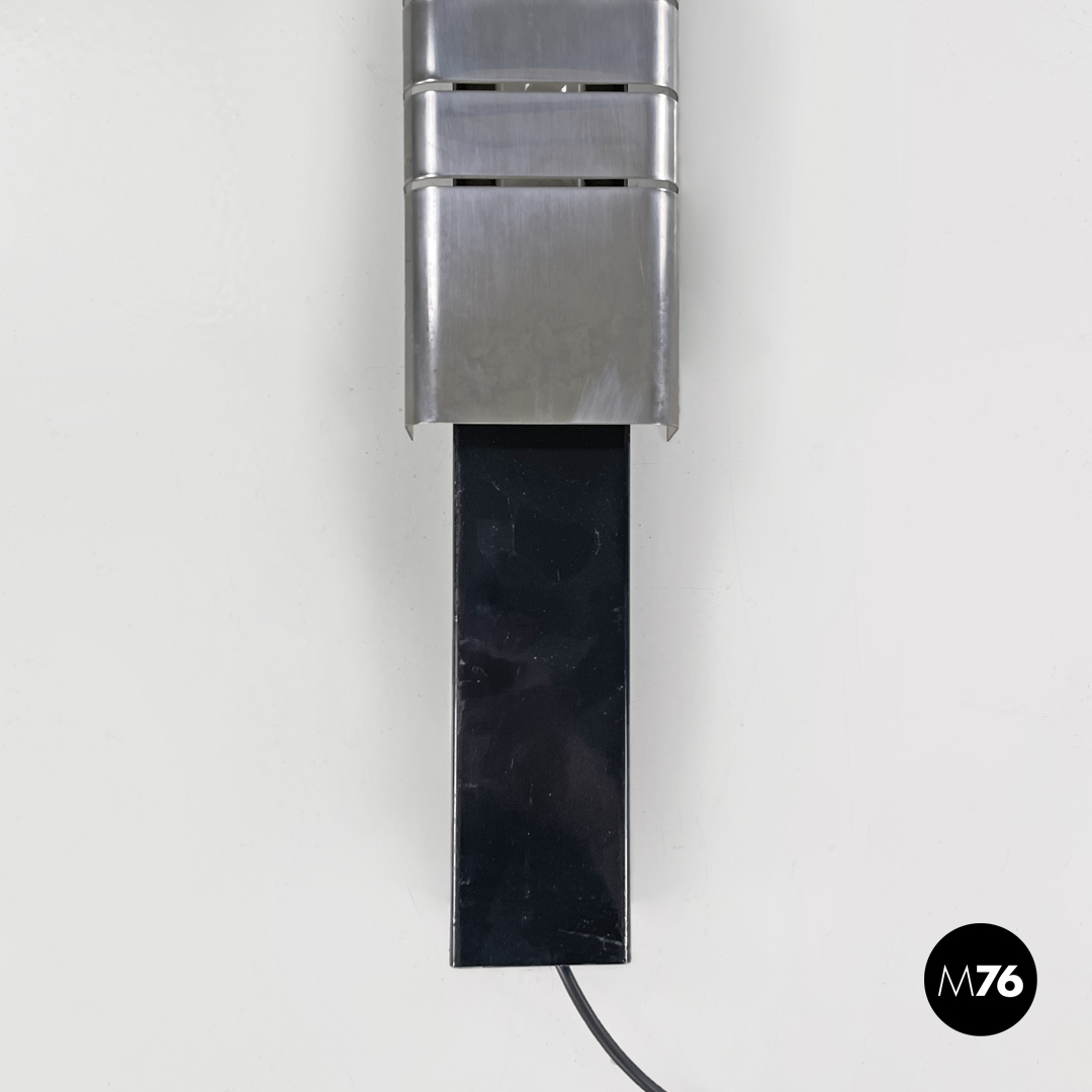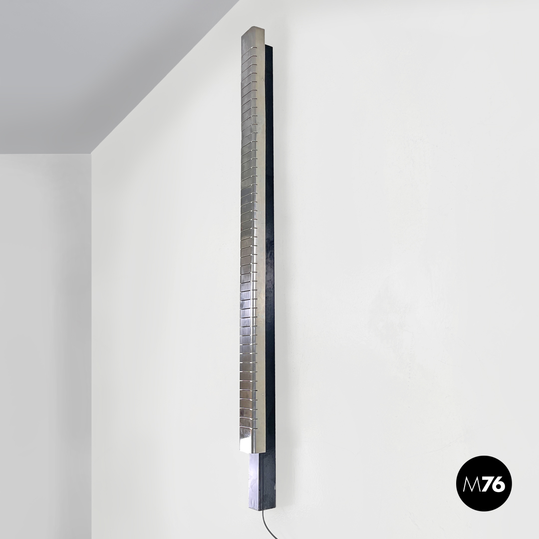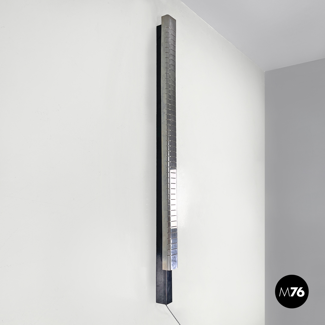 Lampada da parete o applique rettangolare con struttura in metallo cromato con una serie di incisioni a intervalli regolari orizzontali. La base è in metallo verniciato nero.