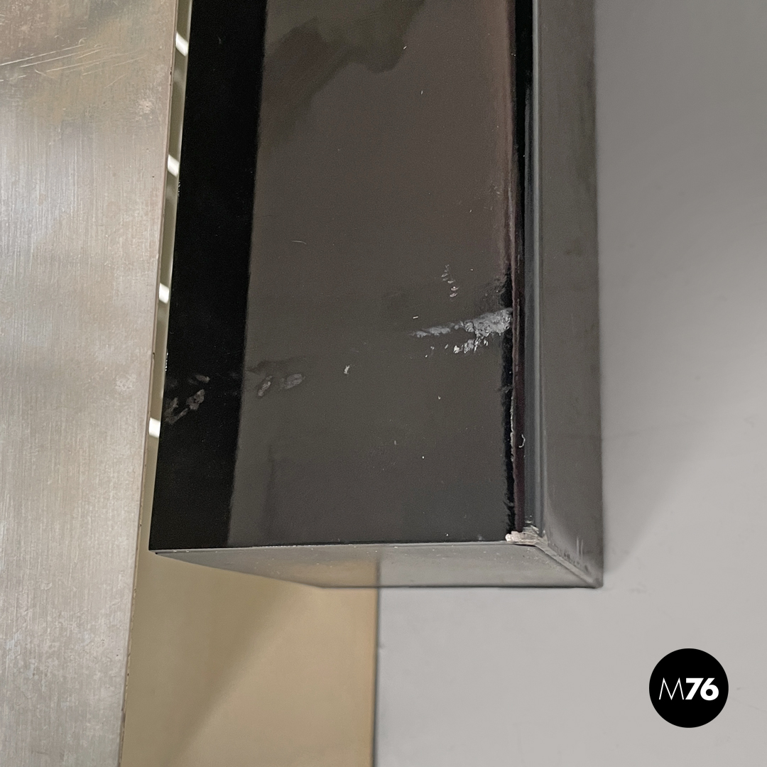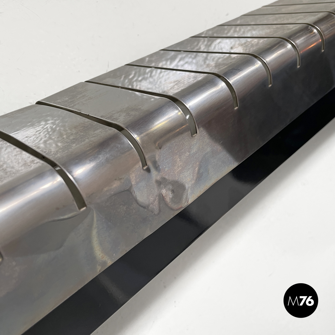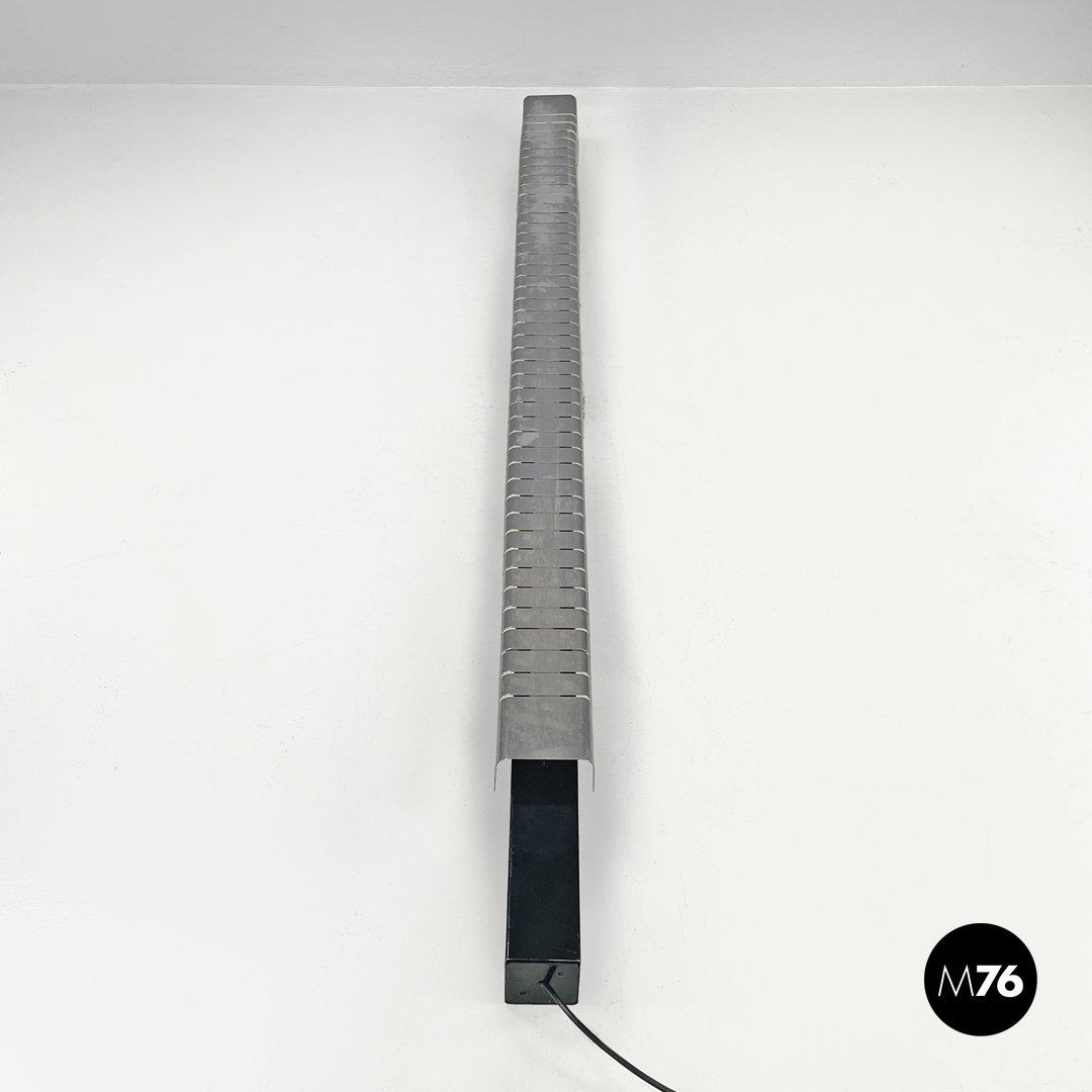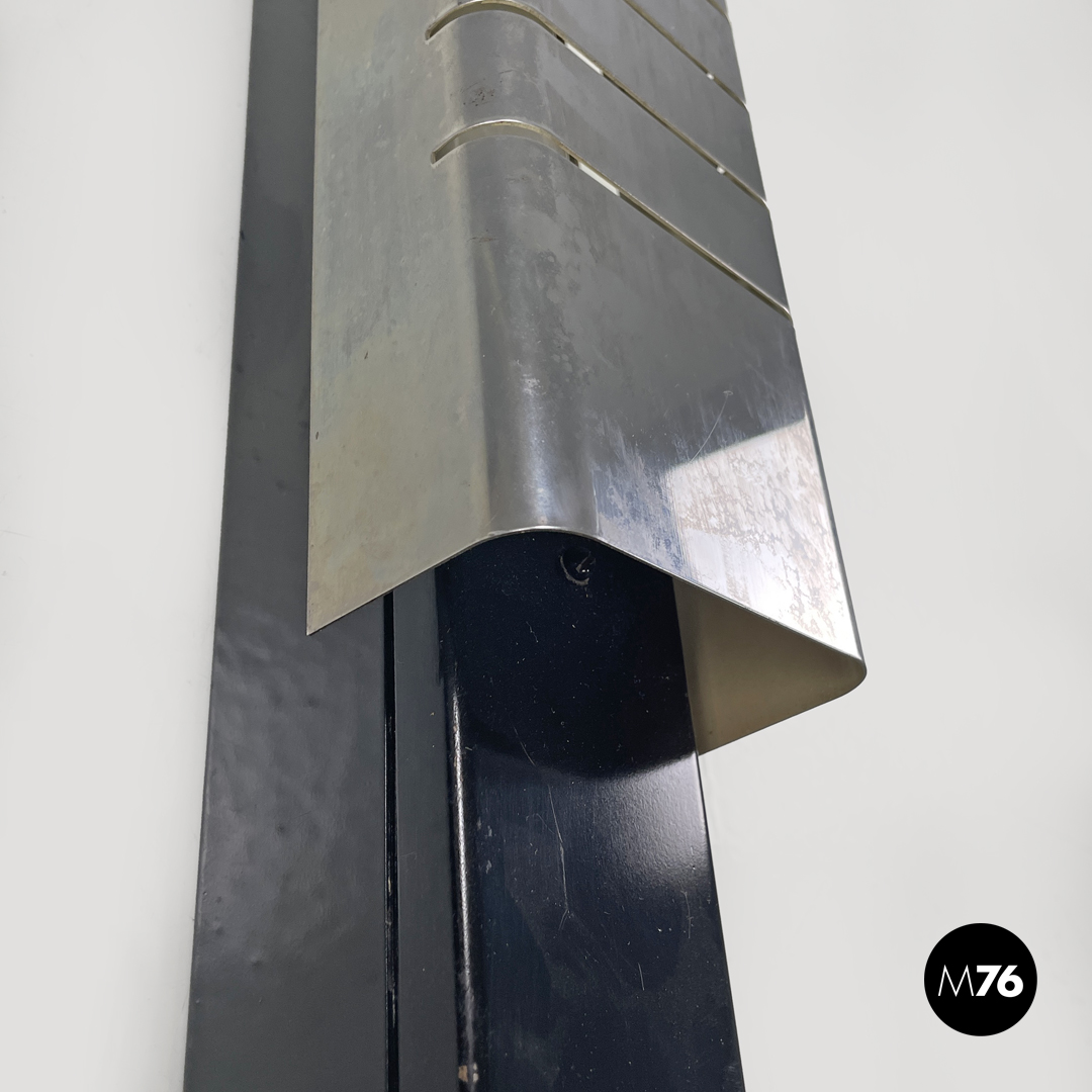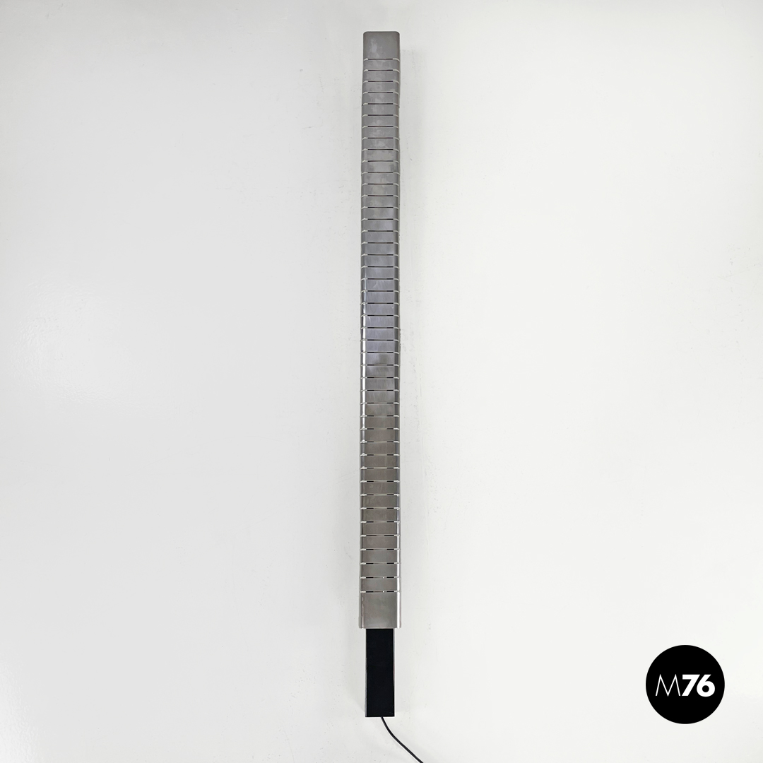 Lampada da parete o applique rettangolare con struttura in metallo cromato con una serie di incisioni a intervalli regolari orizzontali. La base è in metallo verniciato nero.