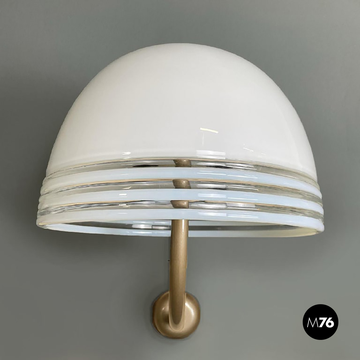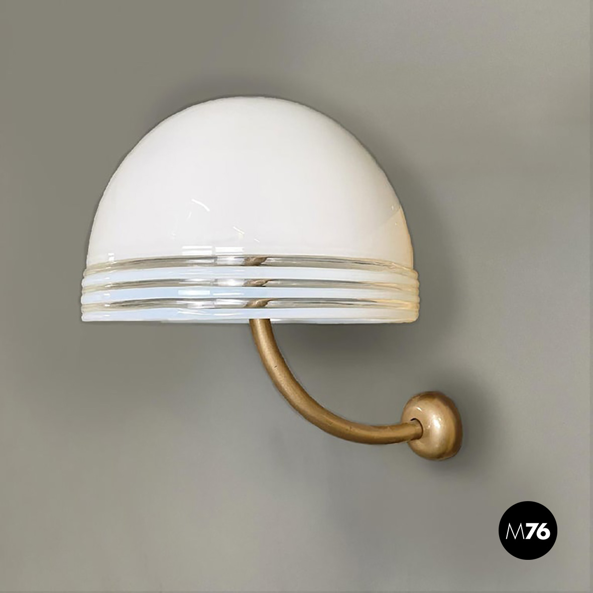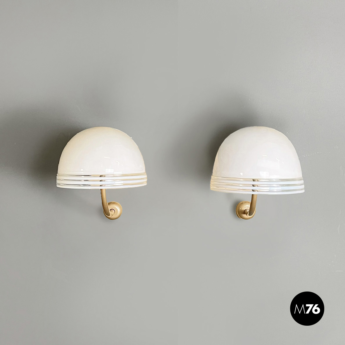 Coppia di applique a base tonda. Il diffusore è una semisfera in vetro di Murano bianco, ai bordi si trovano tre linee decorative in vetro trasparente. Le strutture di supporto è in metallo verniciato oro.