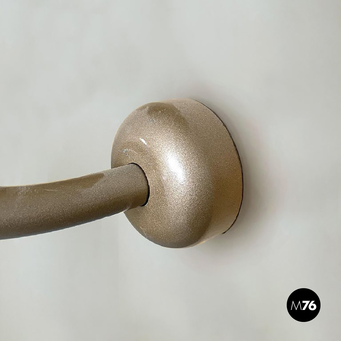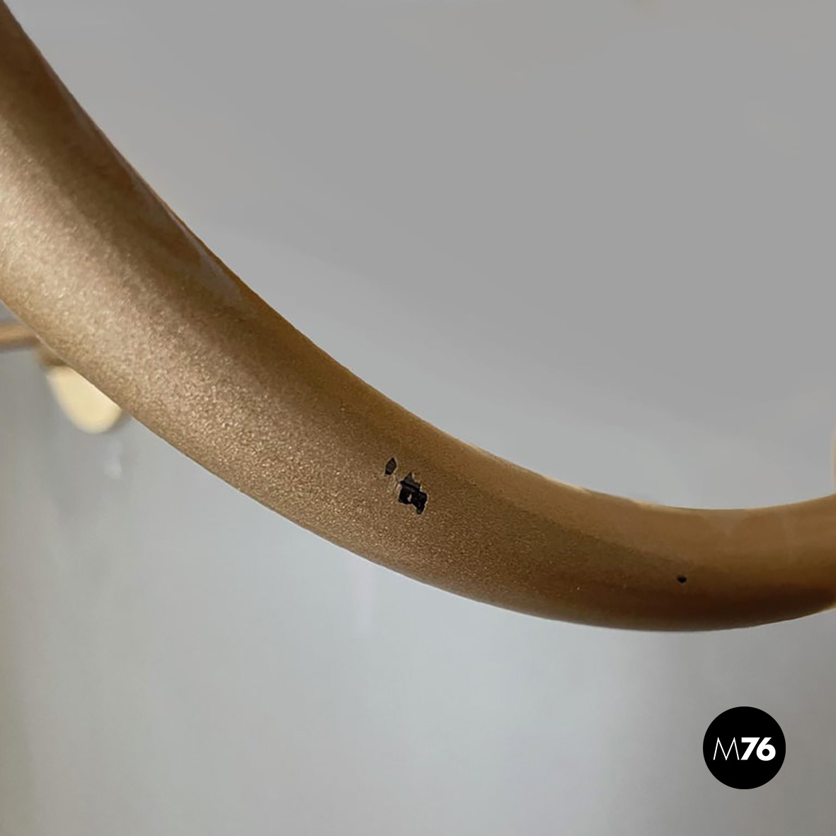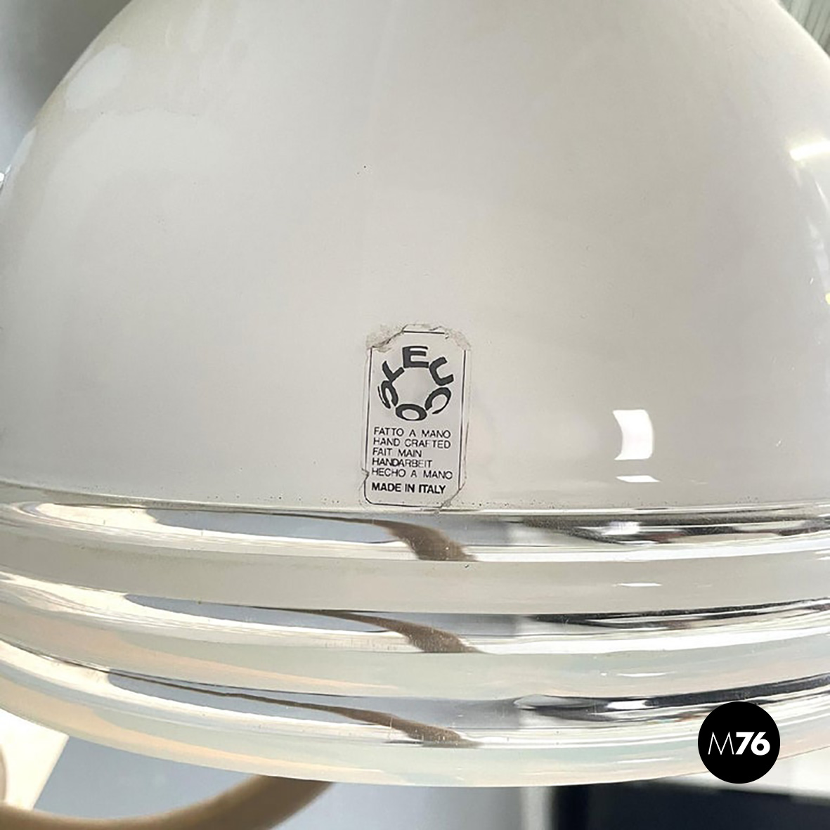 Coppia di applique a base tonda. Il diffusore è una semisfera in vetro di Murano bianco, ai bordi si trovano tre linee decorative in vetro trasparente. Le strutture di supporto è in metallo verniciato oro.